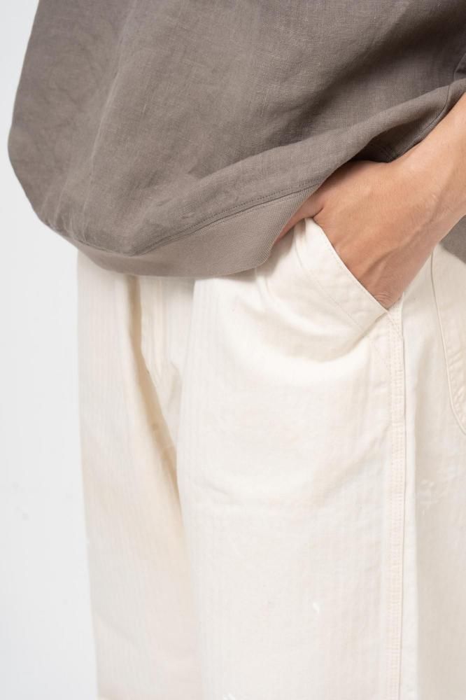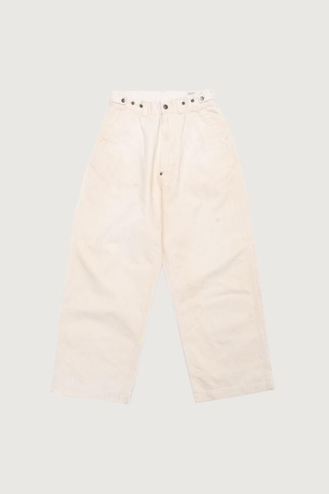 빈티지 독일군 자켓을 기반으로 한 디자인에서 영감을 받아 제작된 워크 팬츠입니다. 높은 밀도로 짜여진 덕 원단을 사용하여 탄탄하면서도 입을수록 자연스러운 질감이 살아나며, 페인트 자국과 은은한 워싱으로 완성된 USED 가공이 독특한 분위기를 더합니다.