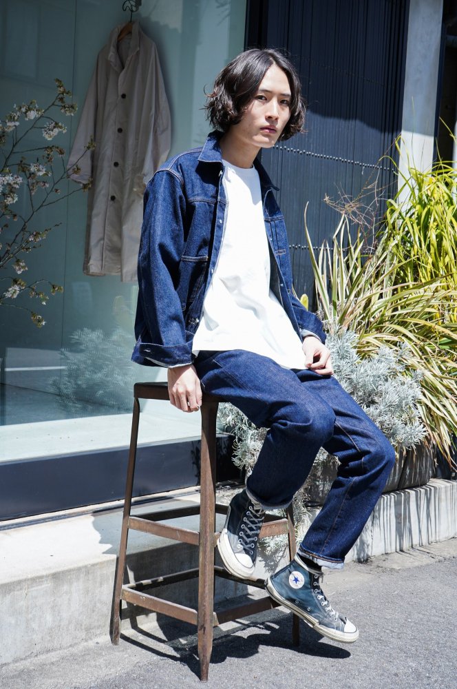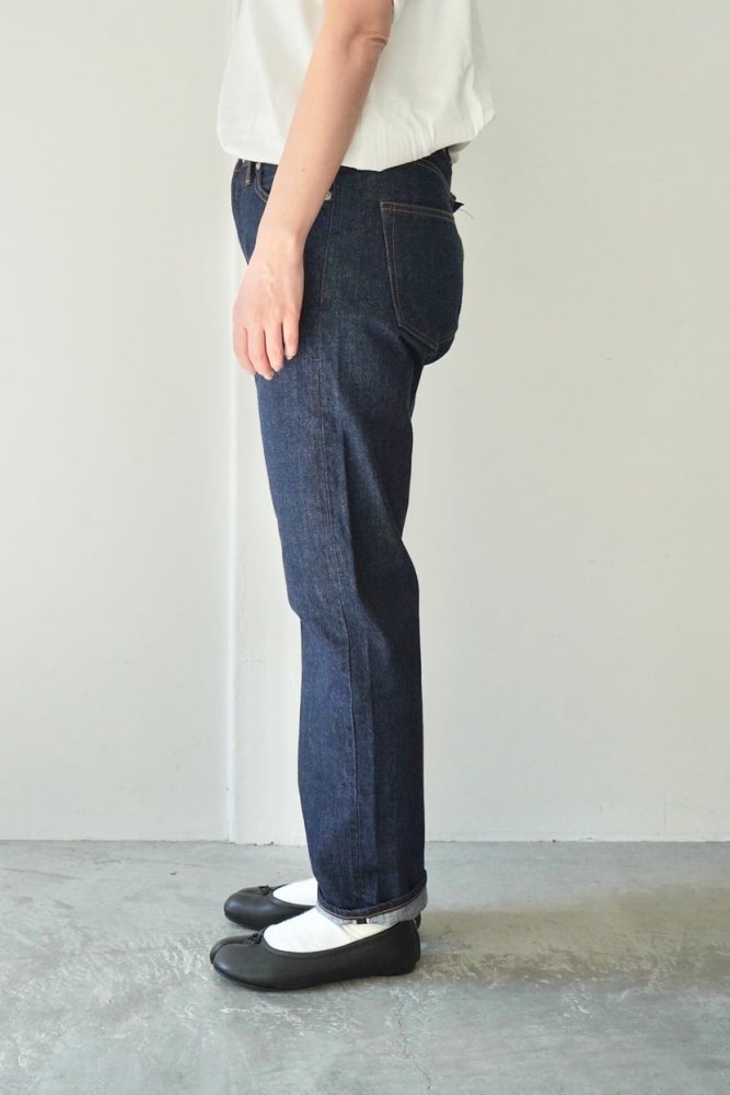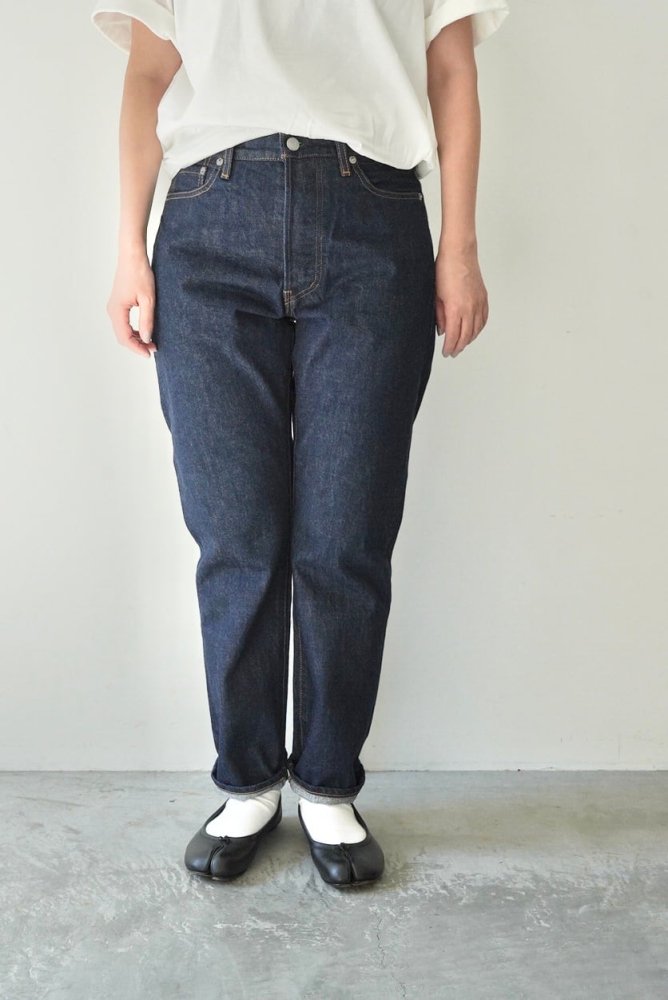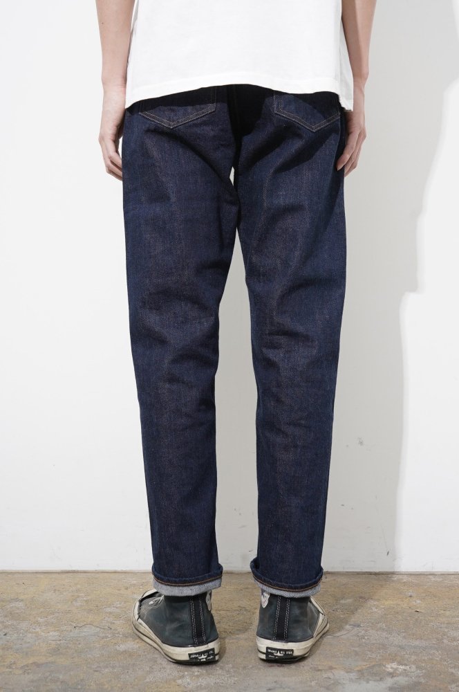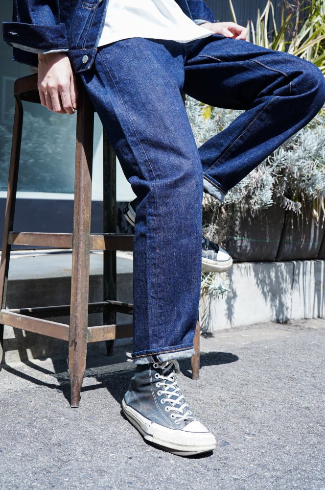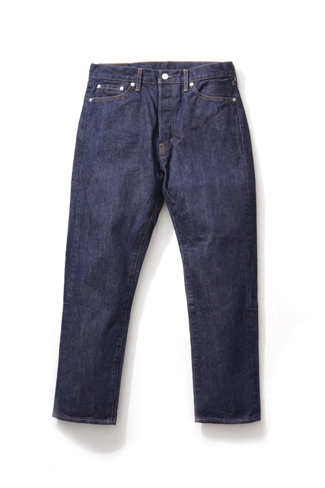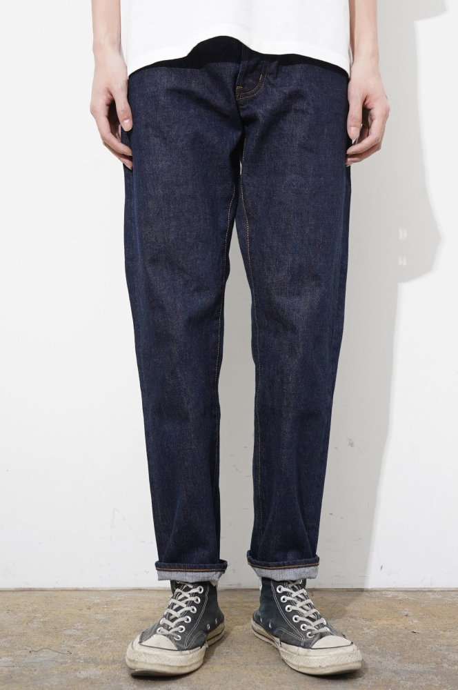 허벅지와 엉덩이에 여유가 있고 밑단이 가늘어지는 테이퍼드 실루엣입니다. 14oz 셀비치 데님 소재입니다.