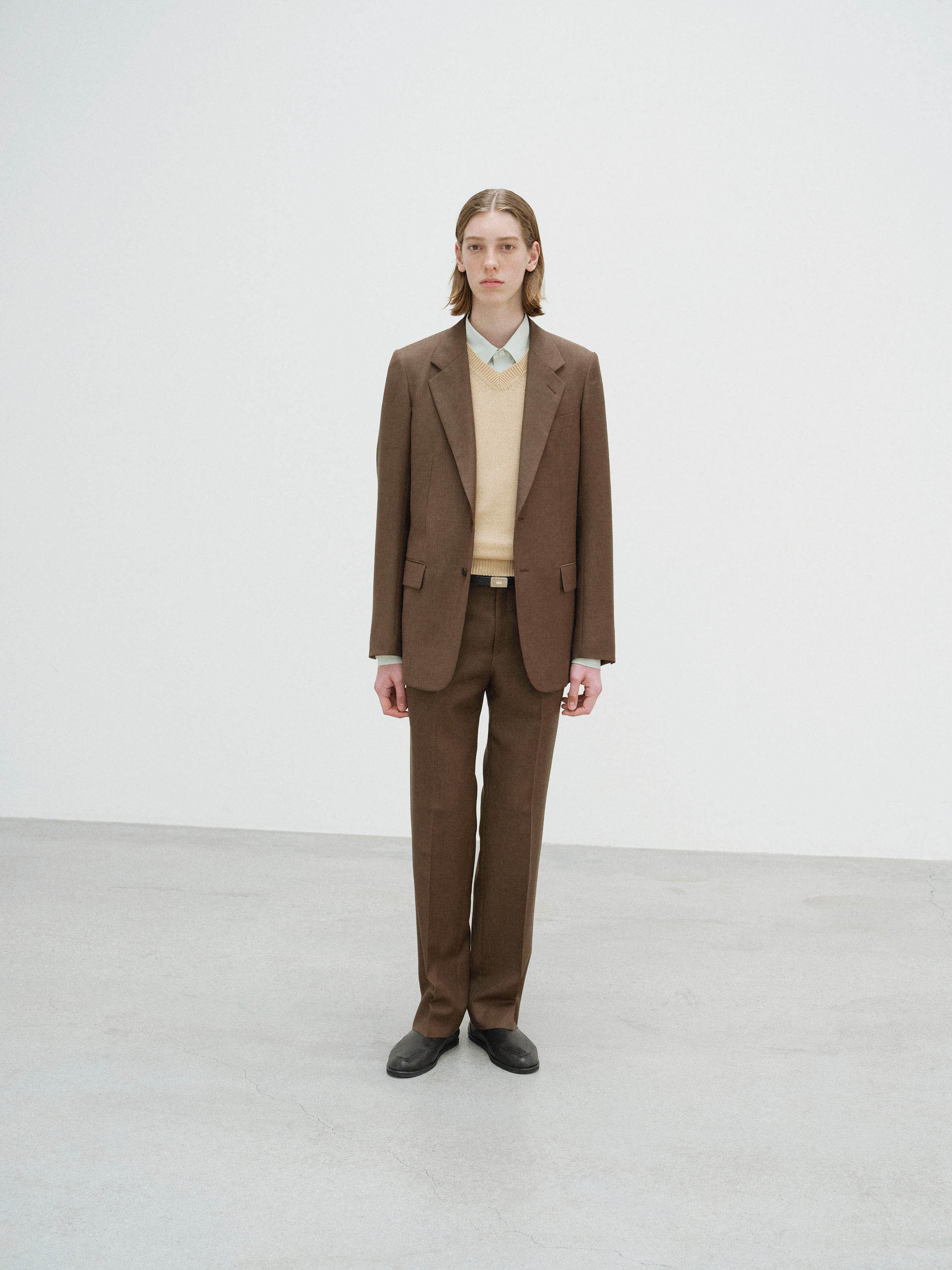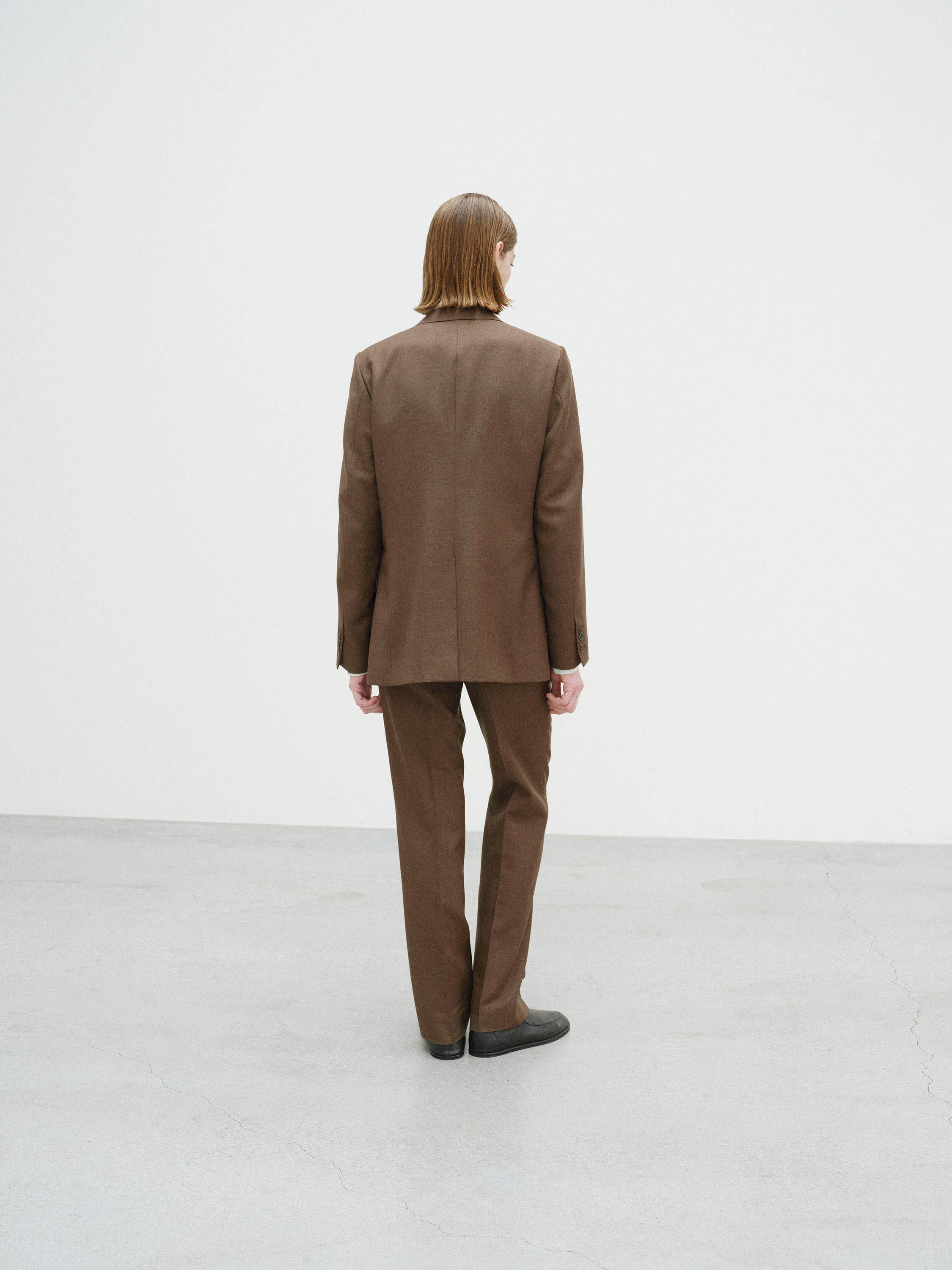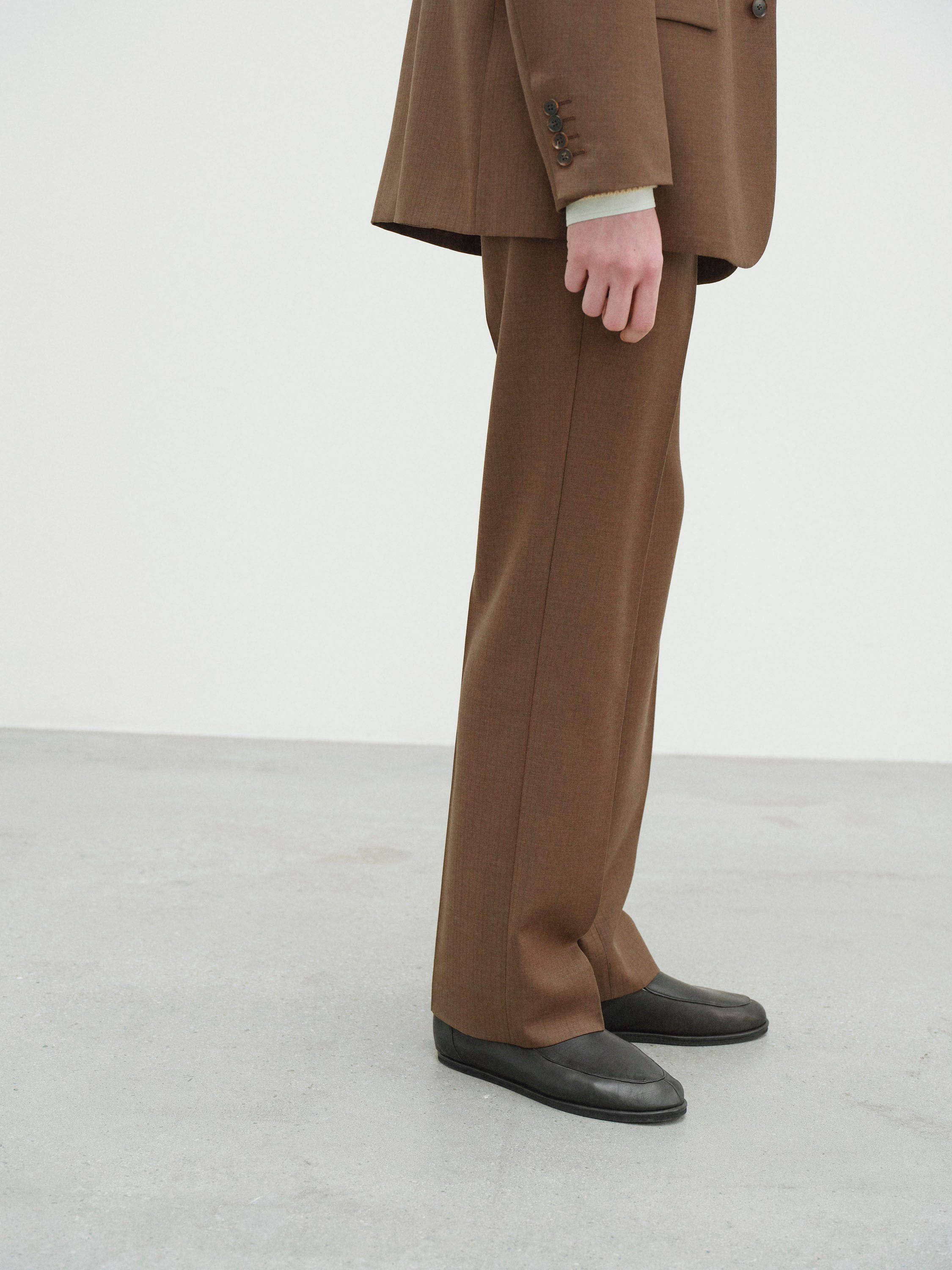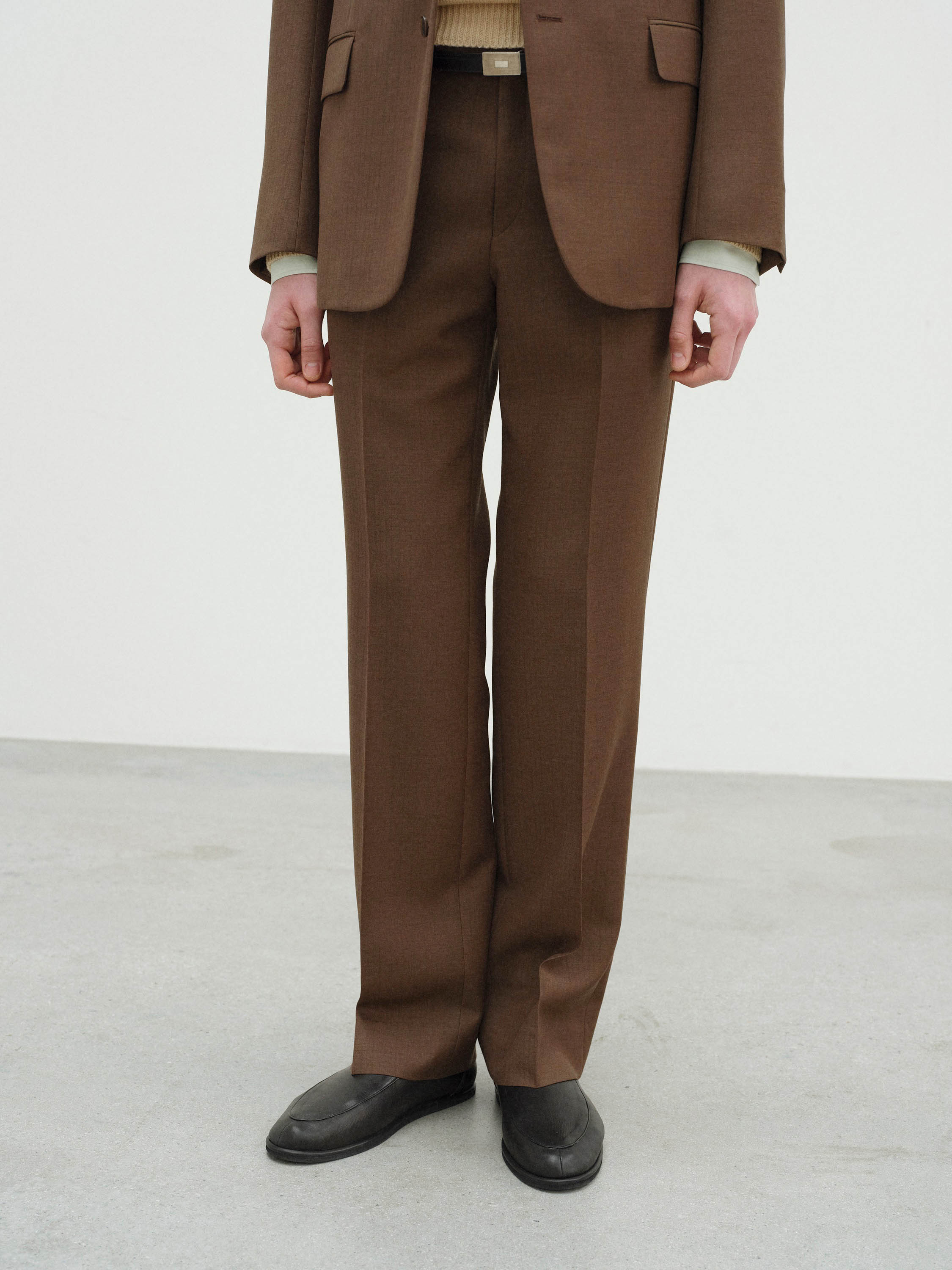경사에는 Super130’s 슈퍼 엑스트라 파인 메리노 울을, 위사에는 영국산 블루페이스 레스터 종의 원모를 사용한 고급 원사로 짠 소재입니다. 블루페이스 특유의 풍성함과 적당한 탄성에, 슈퍼 엑스트라 파인 메리노의 뛰어난 부드러움을 절묘하게 조합하여 고급스러운 질감을 구현했습니다.
