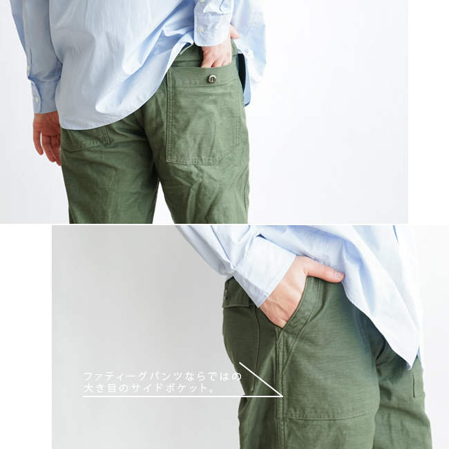 빈티지 팬츠를 연상시키는 베이커 포켓과 플랩이 있는 백 포켓은 그대로 유지되지만, 롤업을 고려하여 가랑이는 약간 얕게 배치하고 있습니다.