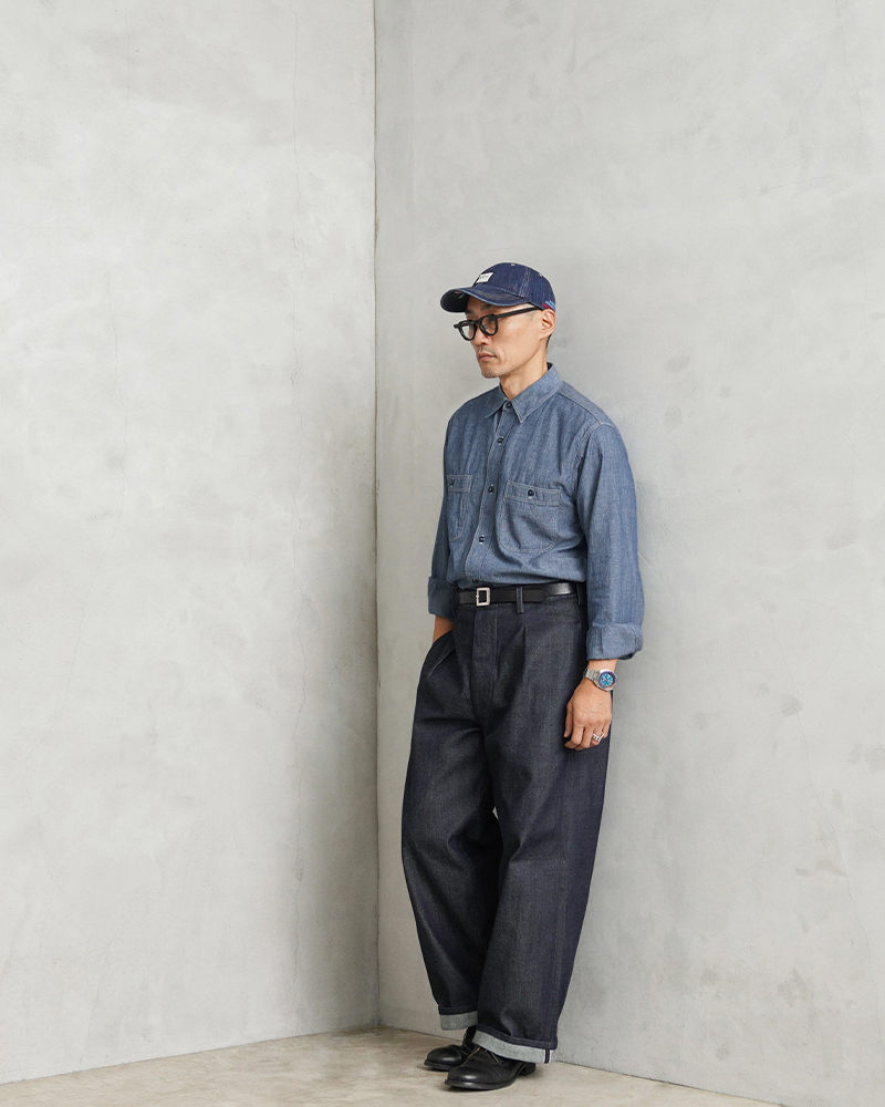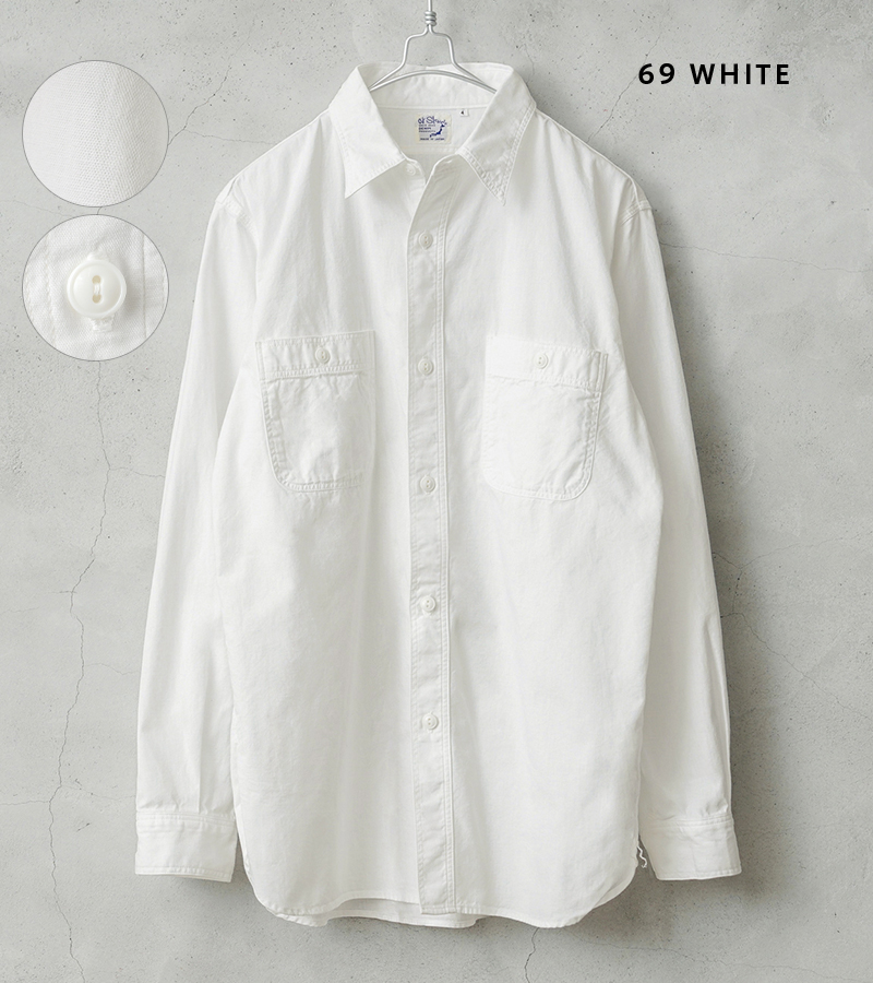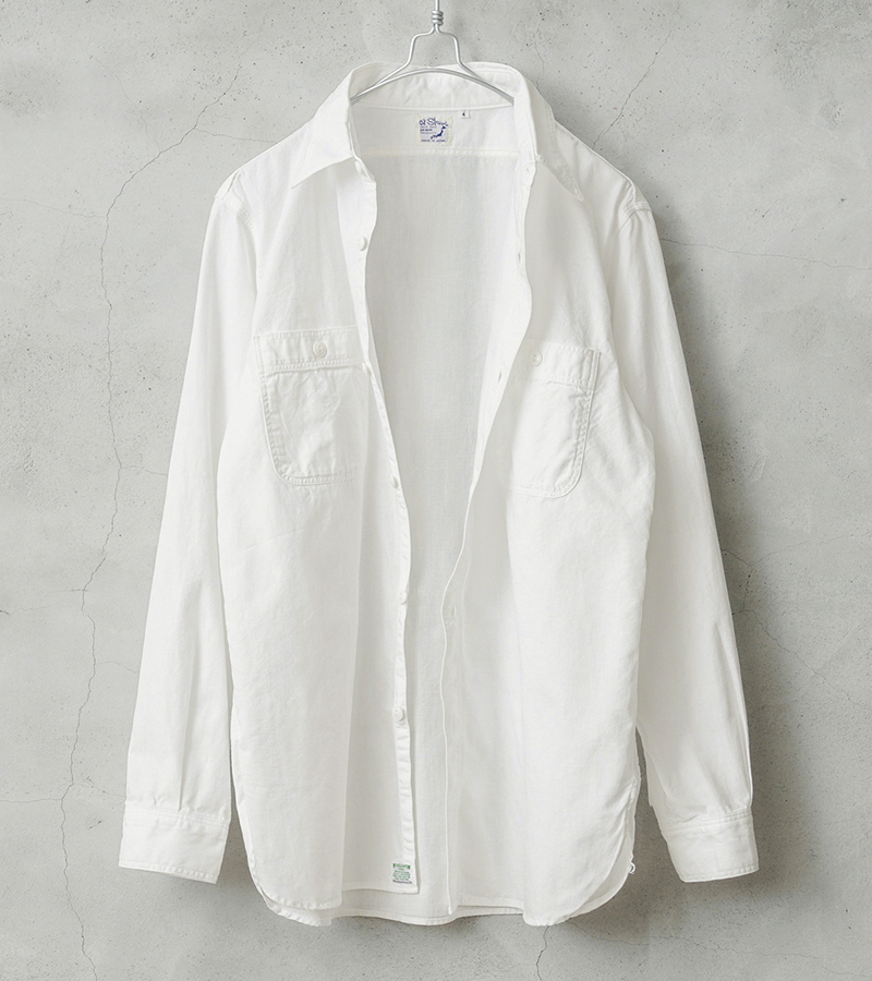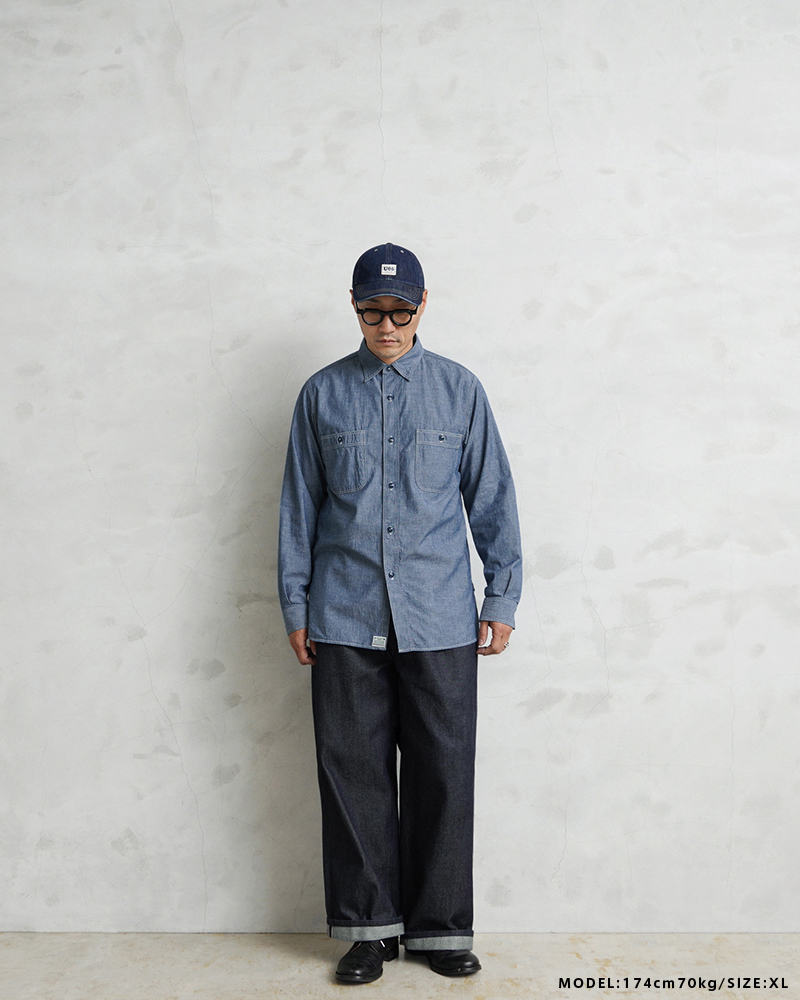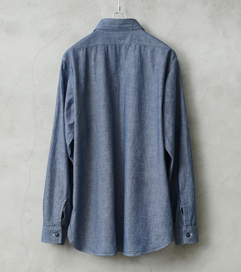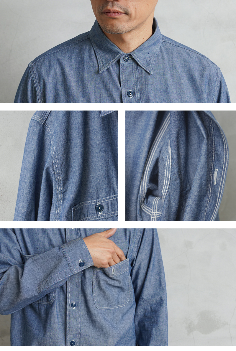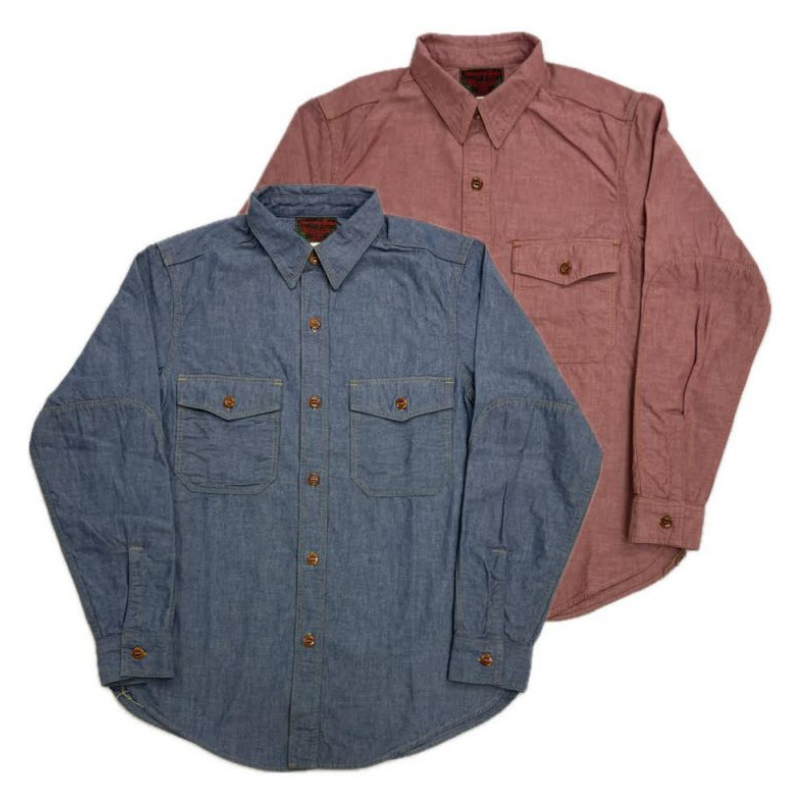 40년대 밀리터리 워크 셔츠를 모델로 한 심플한 디자인의 4.5oz 샴브레이 소재의 셔츠.