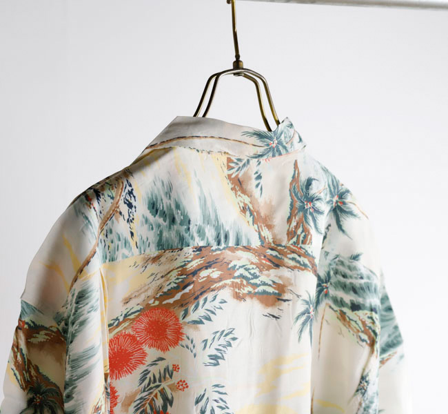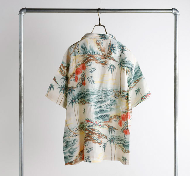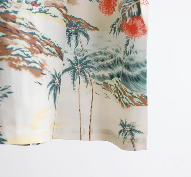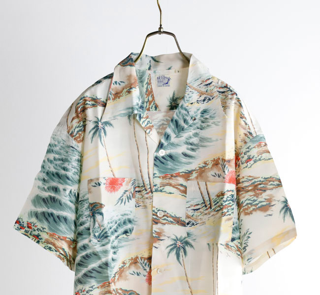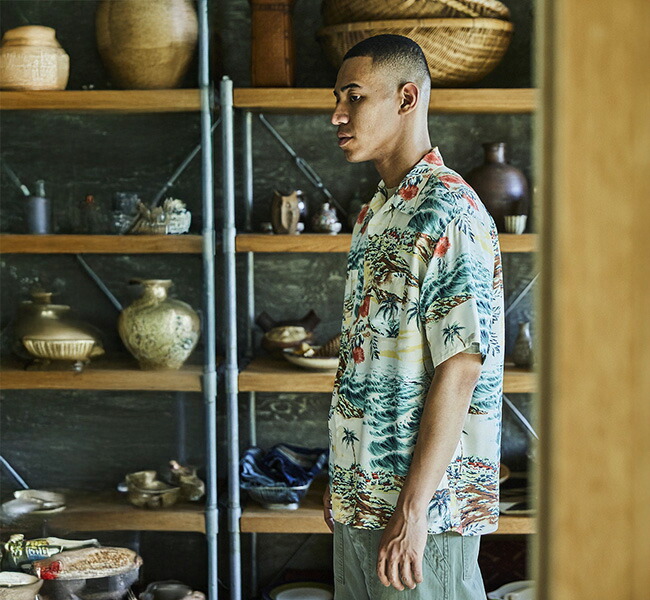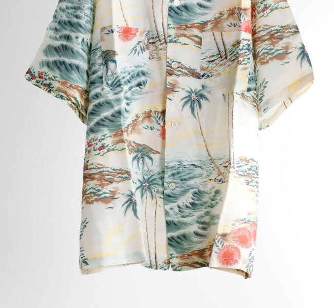 남국의 풍경을 모티프로 한 프린트 디자인 이 특징으로, 여름 분위기를 물씬 느낄 수 있는 패턴이 돋보이는 하와이안 셔츠.