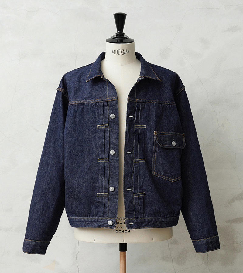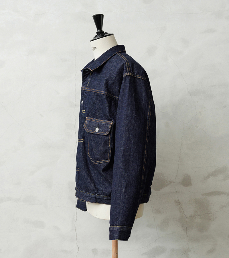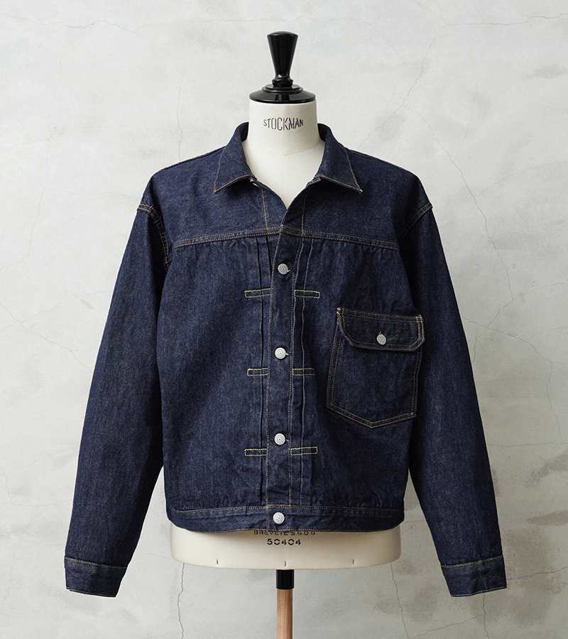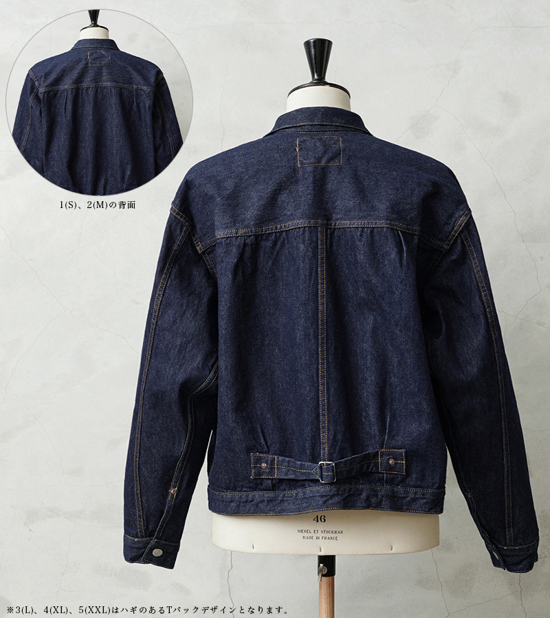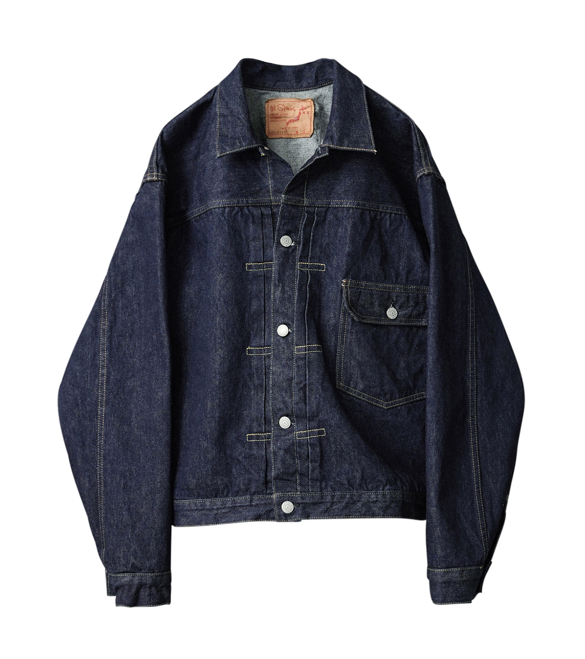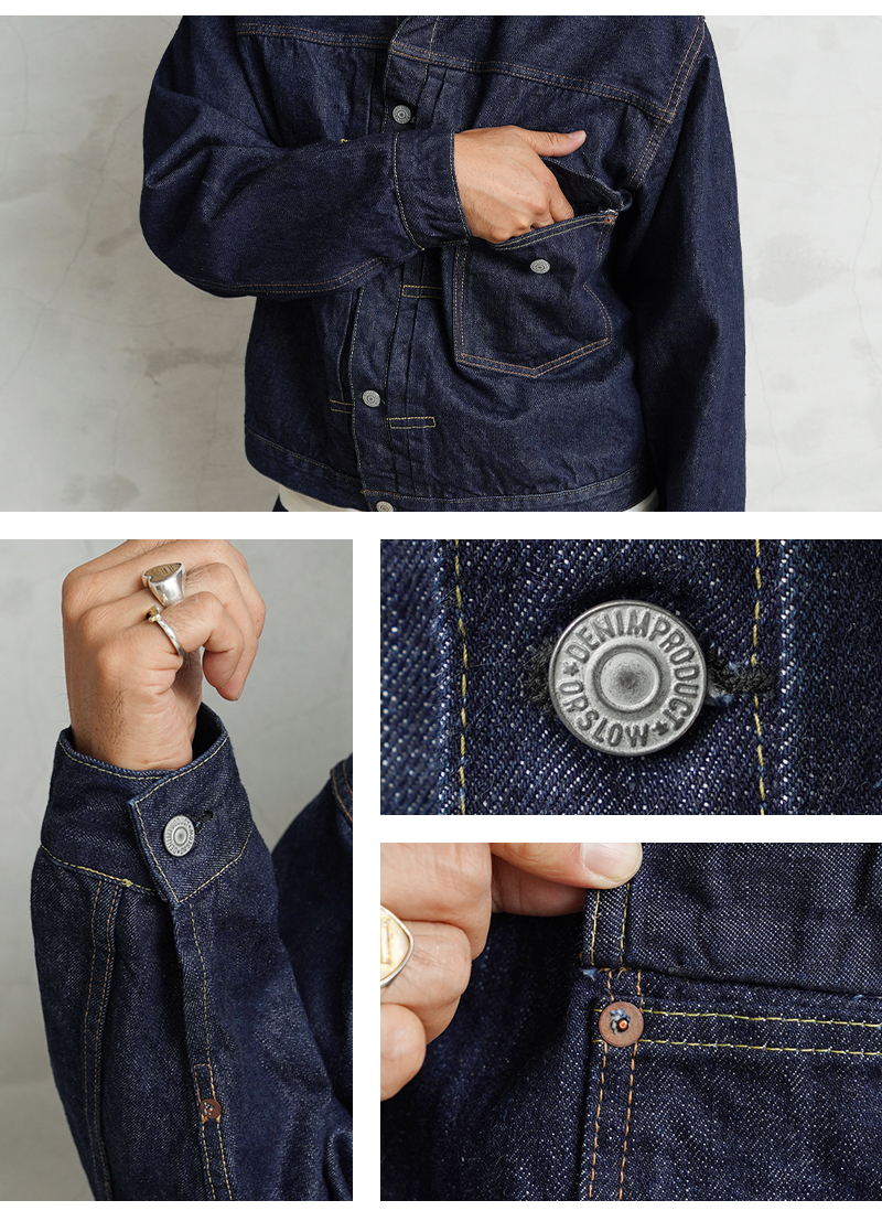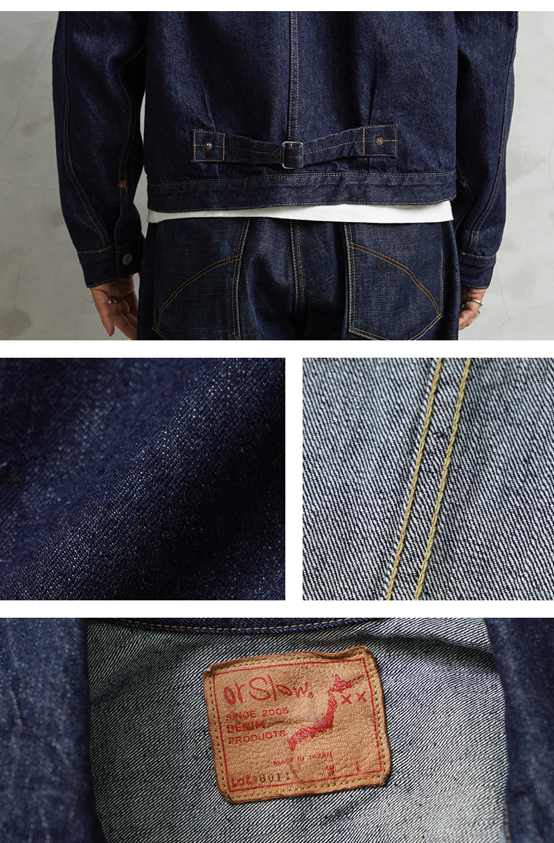 13.5온스의 셀비지 데님 소재로 박스 스티치, 왼쪽 가슴에만 배치된 플랩이 있는 포켓, 분위기 있는 예고 없는 리벳과 신치 백이 있습니다.