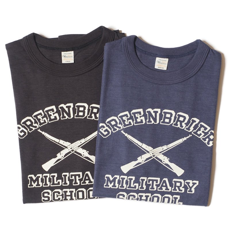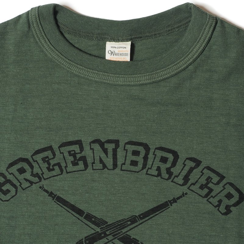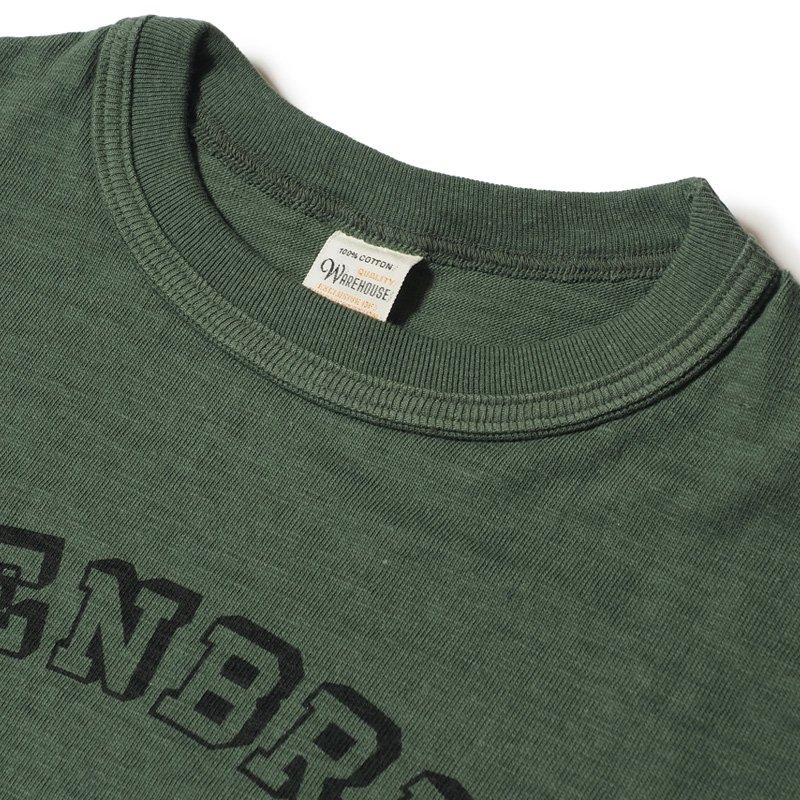 저궤도 편직기를 사용한 웨어하우스의 스탠다드 티 셔츠입니다. 12호의 요철 실로 짜서 독특한 색조를 주는 이 원단은 그림자 보더라고 불립니다.
