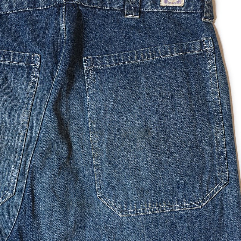 엉덩이와 앞면의 독특한 포켓, 오버사이즈 백 포켓의 독특한 디자인의 데님 팬츠.