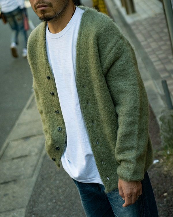 빈티지 모델에서 볼 수 있는 모헤어 가디건으로 높은 보온성이 있습니다.