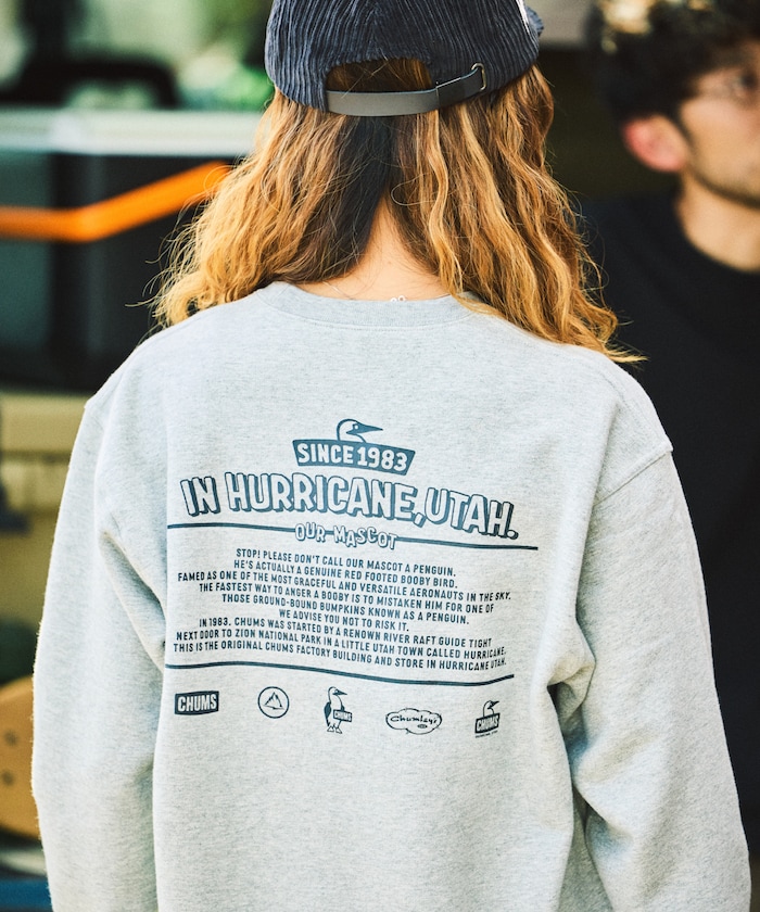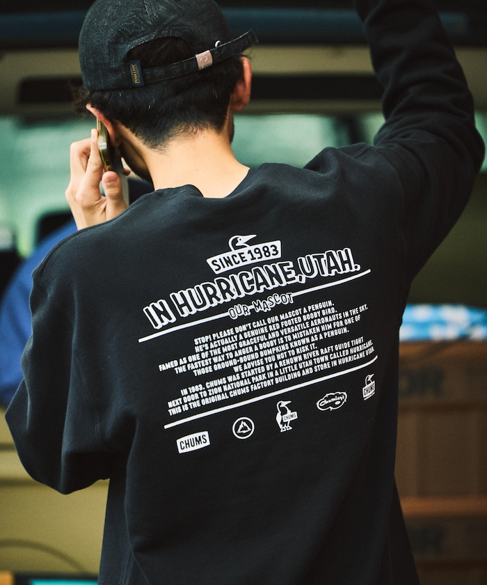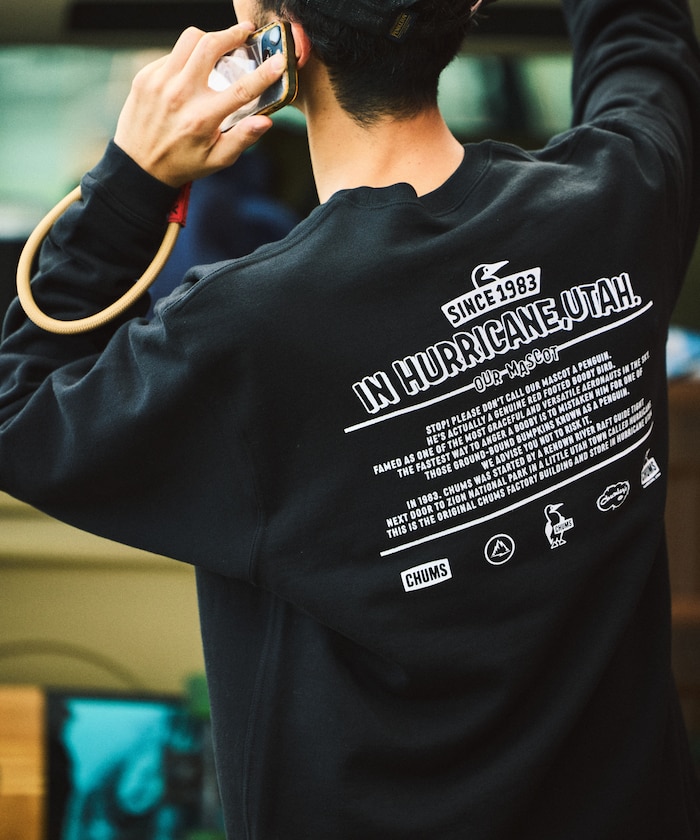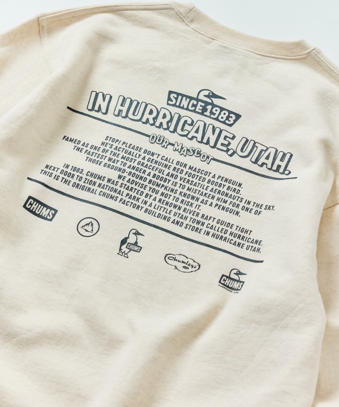 뒷면에 브랜드 역사가 담긴 오리지널 그래픽 프린트가 있는 디자인의 스웨트 티. 부드러운 뒷기모 소재입니다