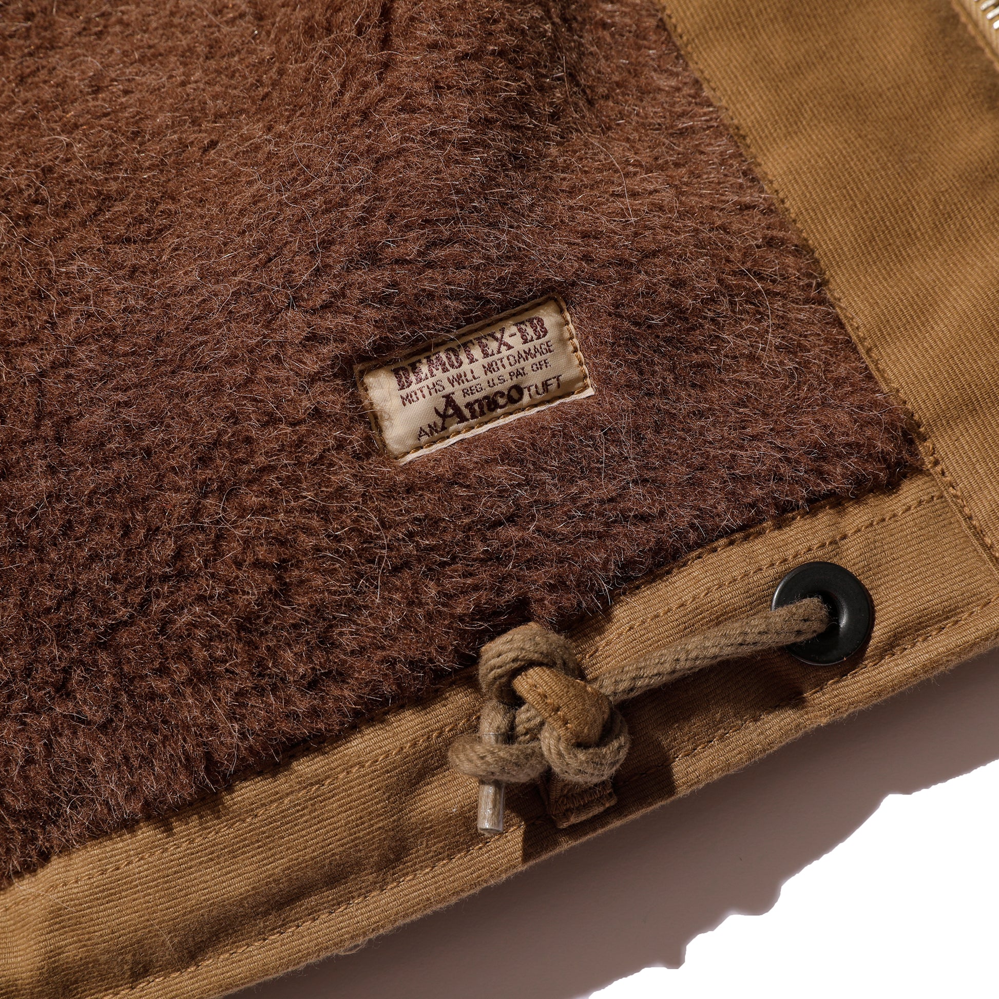 겉감은 코튼 100% 오리지널 그로그랭 원단을 사용해 당시 밀리터리 웨어 특유의 견고한 질감을 재현했으며, 안감에는 라이트 브라운 알파카 파일 라이닝을 적용해 부드러운 착용감과 우수한 보온성을 동시에 확보했습니다.