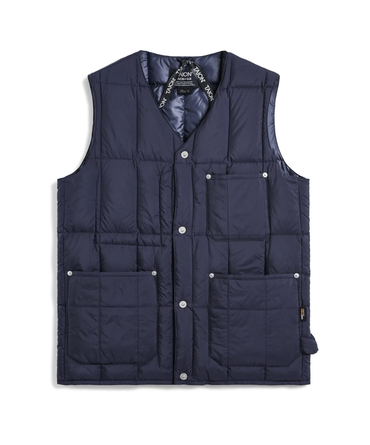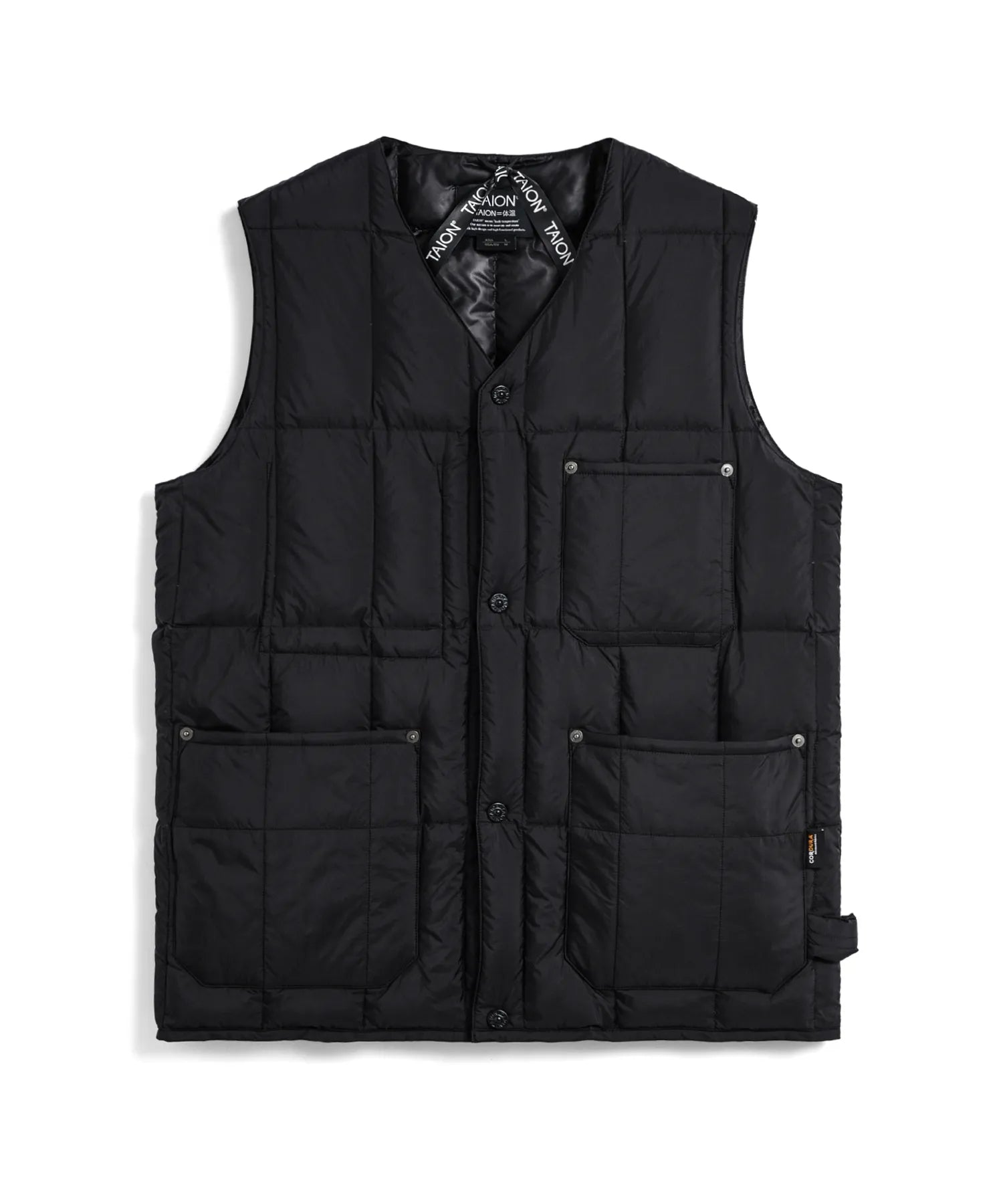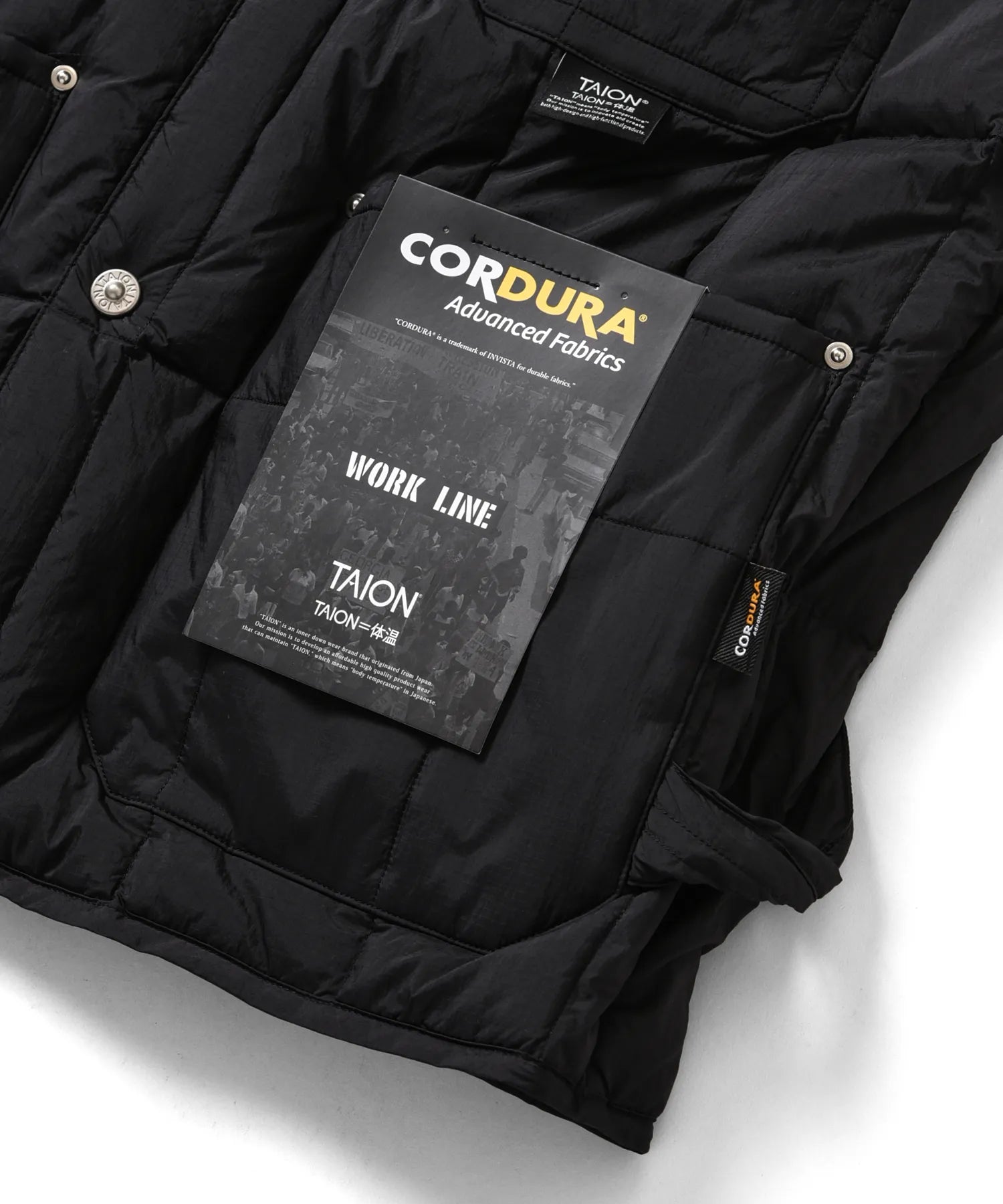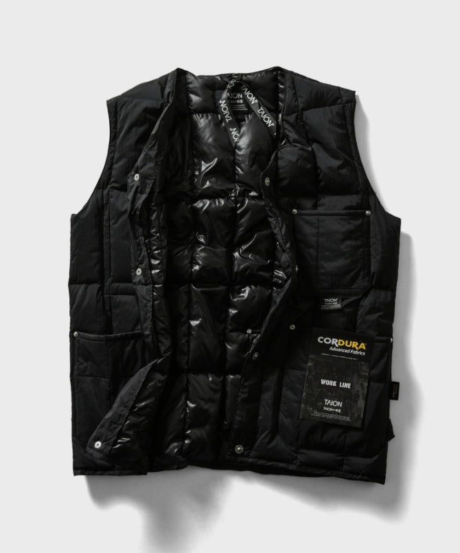고밀도 코듀라 원단을 사용하여 가볍고 내구성이 뛰어난 브이넥 다운 조끼입니다. 많은 포켓과 리벳 포인트가 있습니다. 왼쪽에는 워크 라인의 디자인 아이코능로 루프가 있습니다.