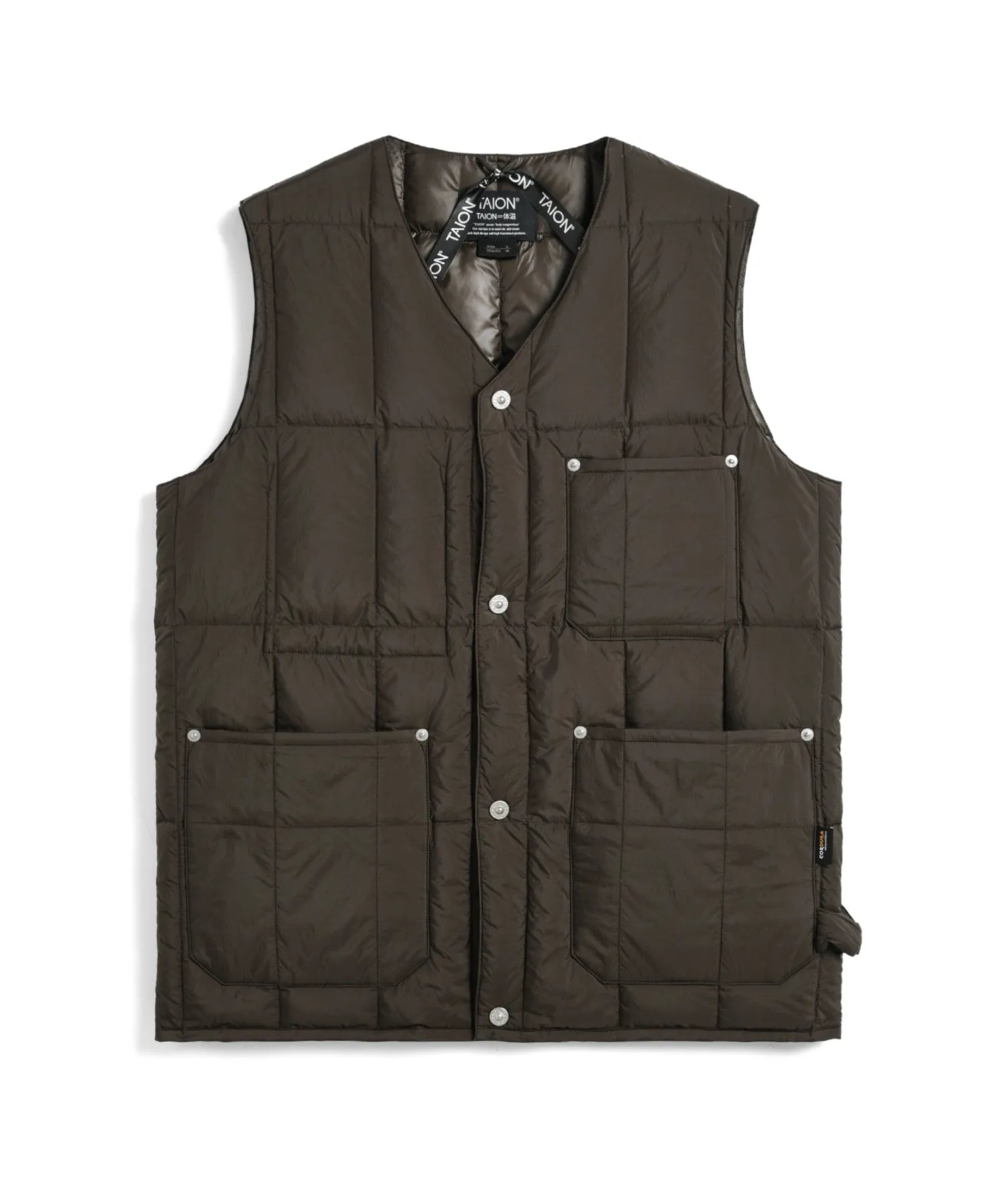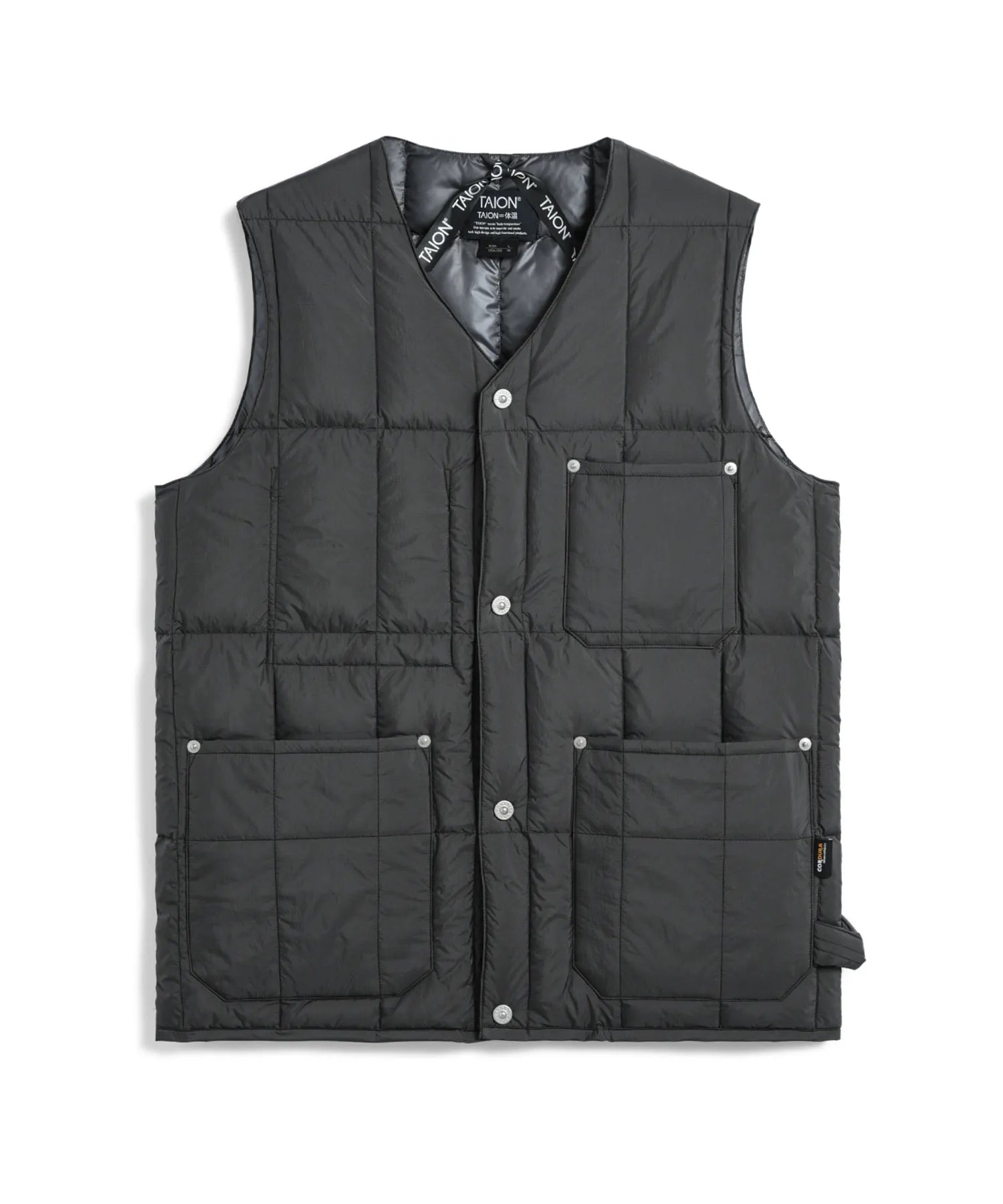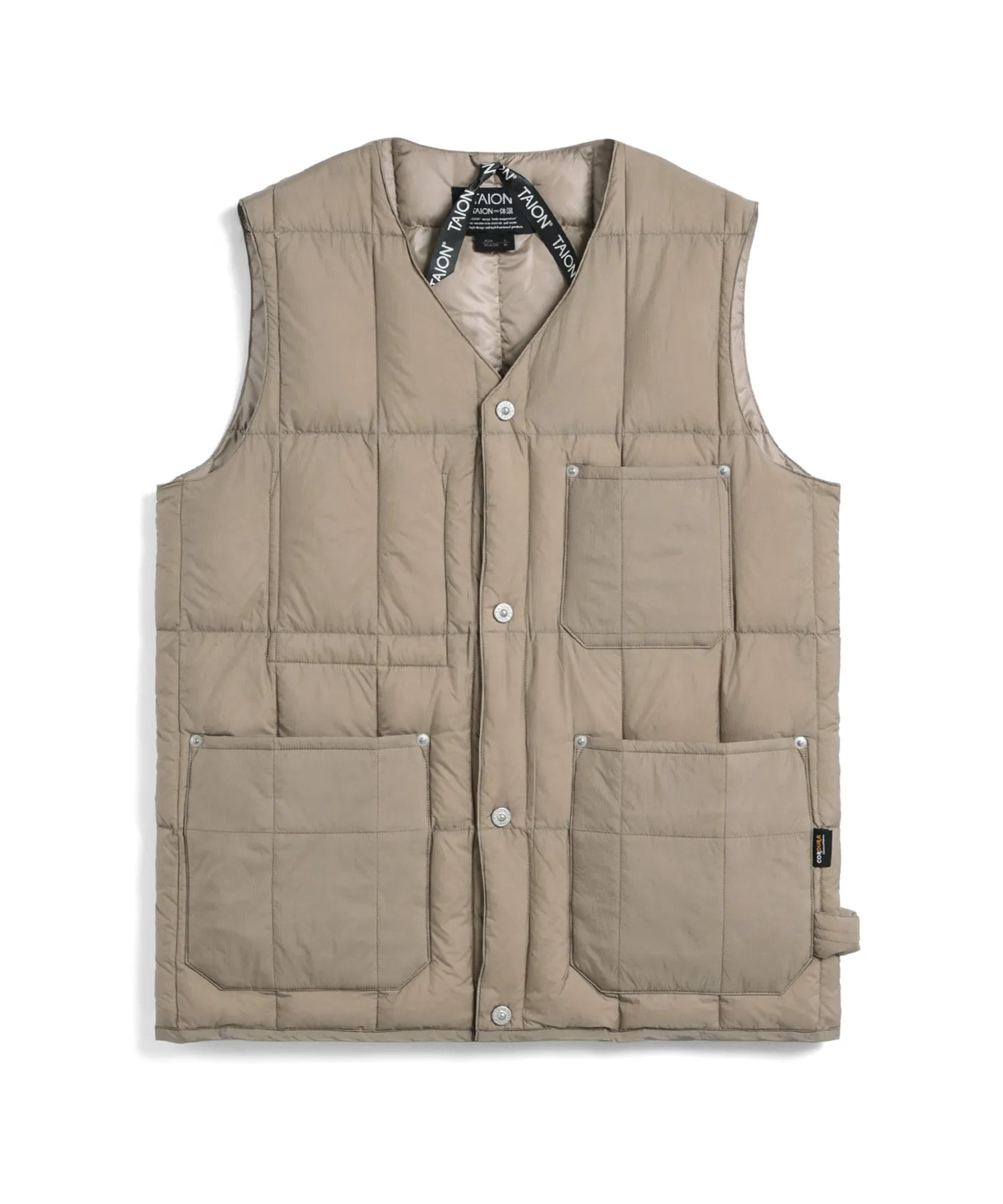 고밀도 코듀라 원단을 사용하여 가볍고 내구성이 뛰어난 브이넥 다운 조끼입니다. 많은 포켓과 리벳 포인트가 있습니다. 왼쪽에는 워크 라인의 디자인 아이코능로 루프가 있습니다.