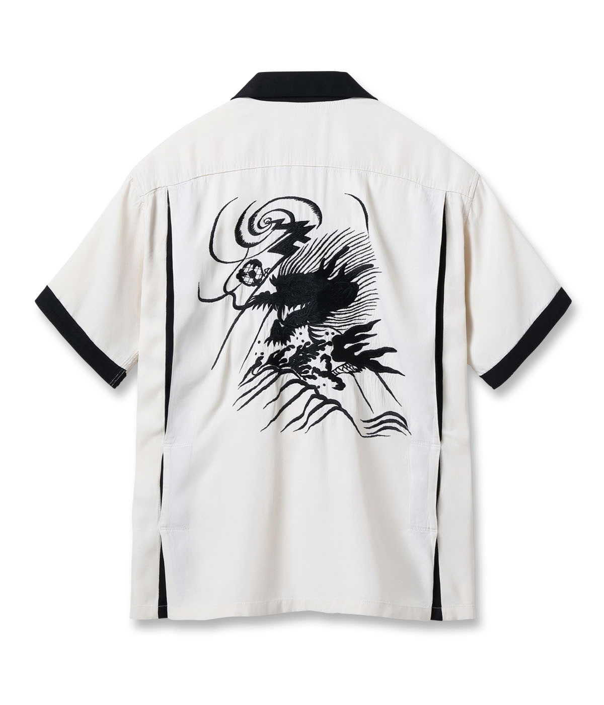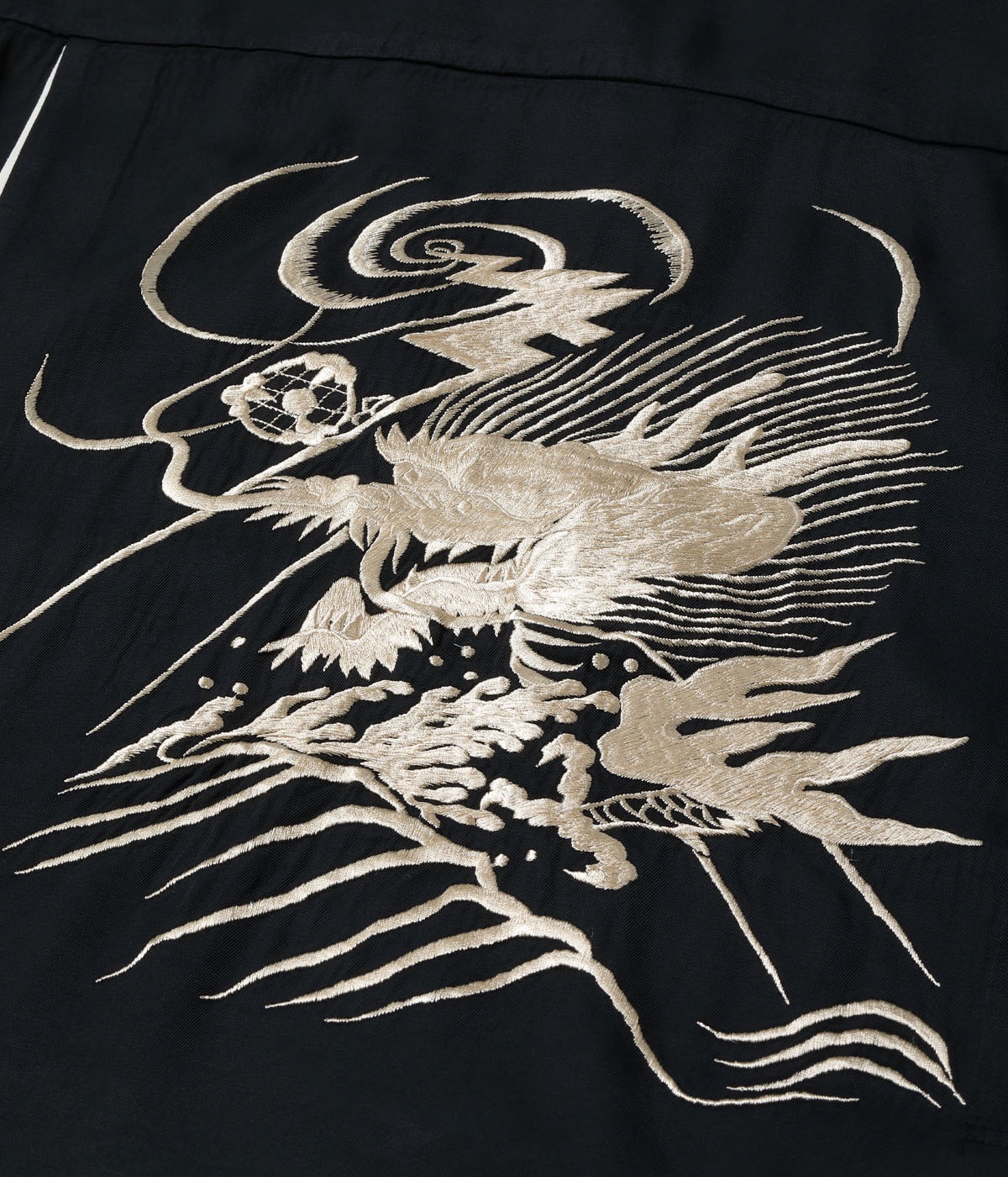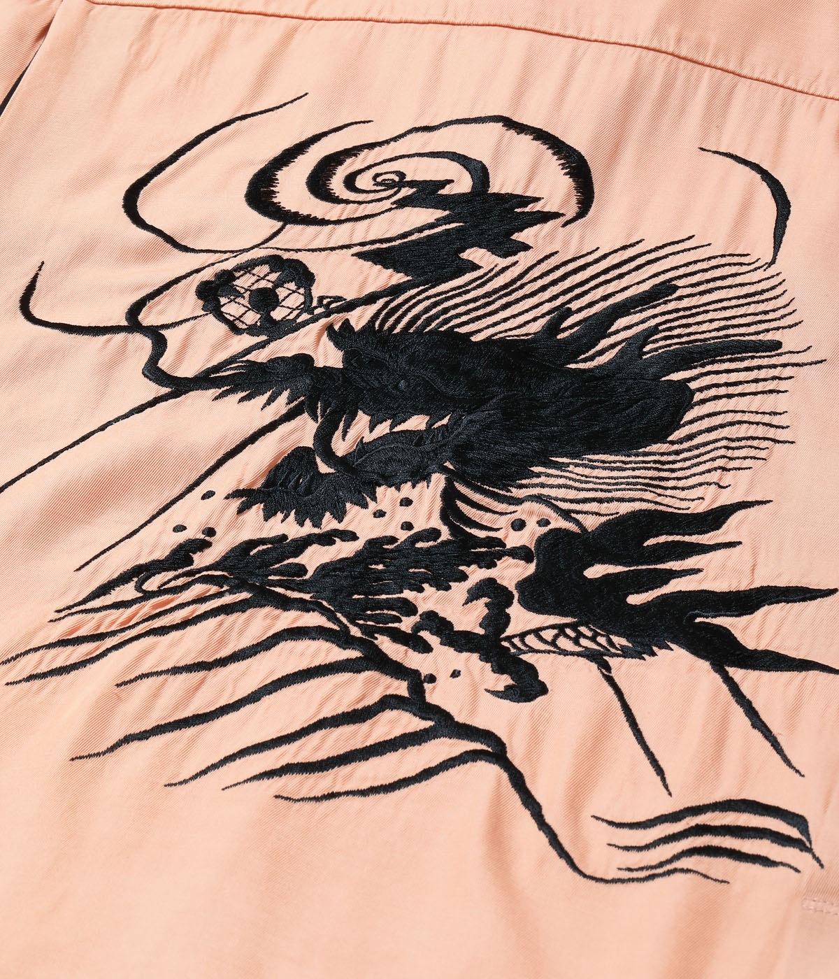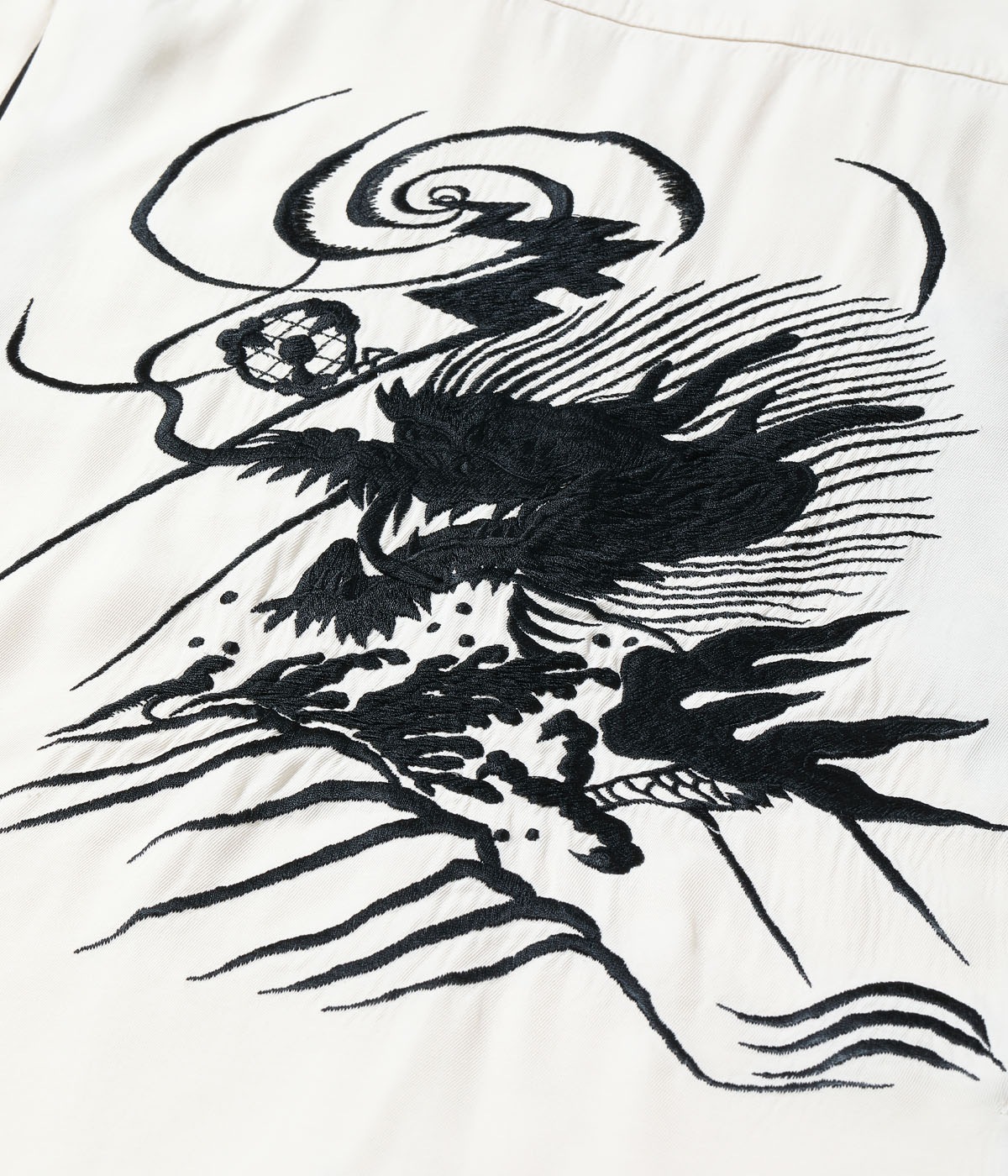 바늘땀의 방향을 자유자재로 조절하여, 입체적인 자수만으로 용의 위엄과 파도 물보라 를 섬세하게 표현한 1950년대 작품을 바탕으로 제작한 셔츠입니다.