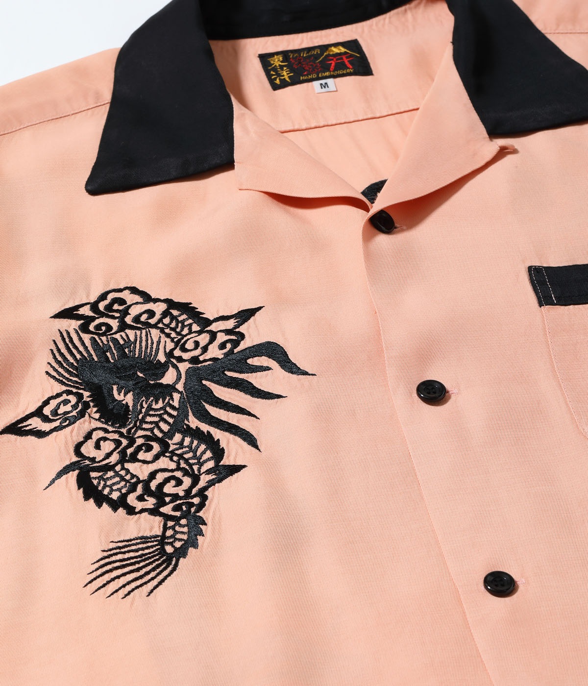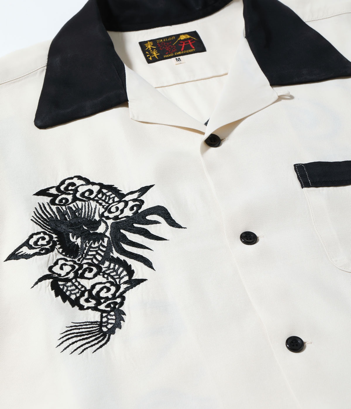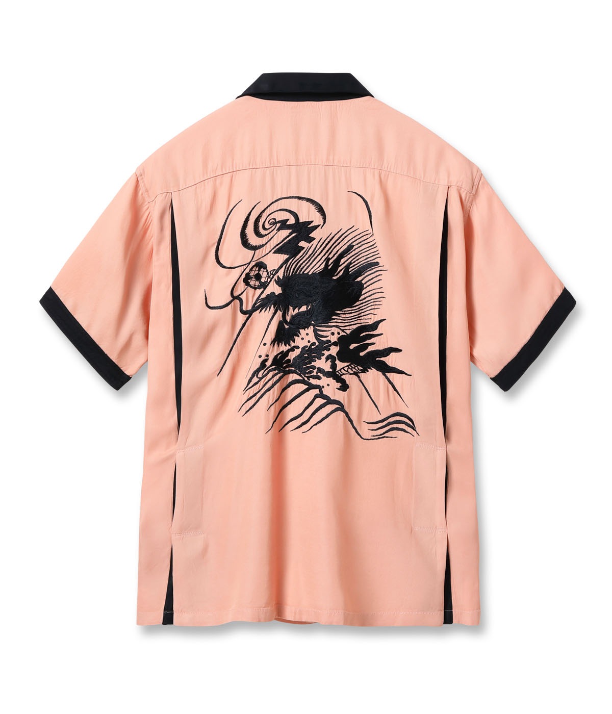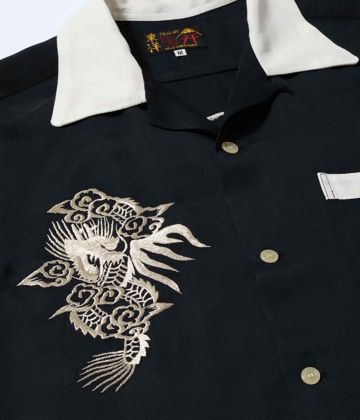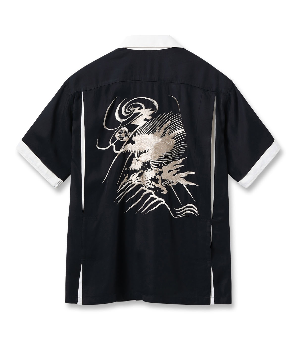 바늘땀의 방향을 자유자재로 조절하여, 입체적인 자수만으로 용의 위엄과 파도 물보라 를 섬세하게 표현한 1950년대 작품을 바탕으로 제작한 셔츠입니다.