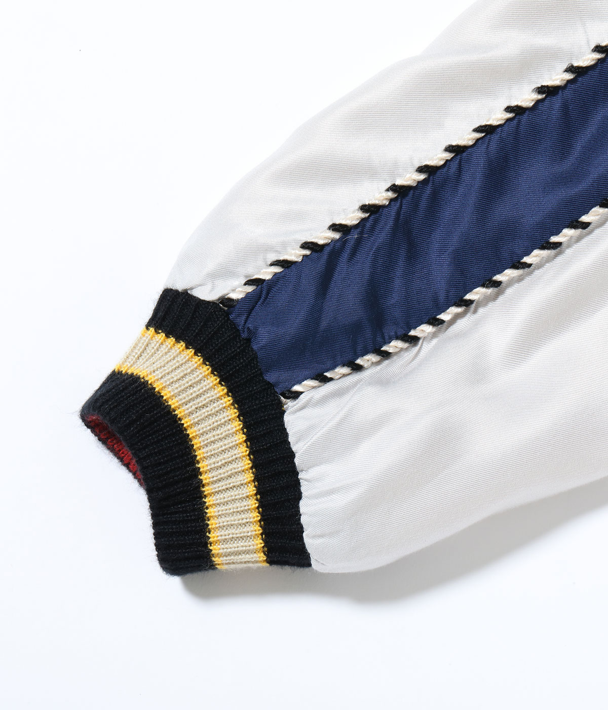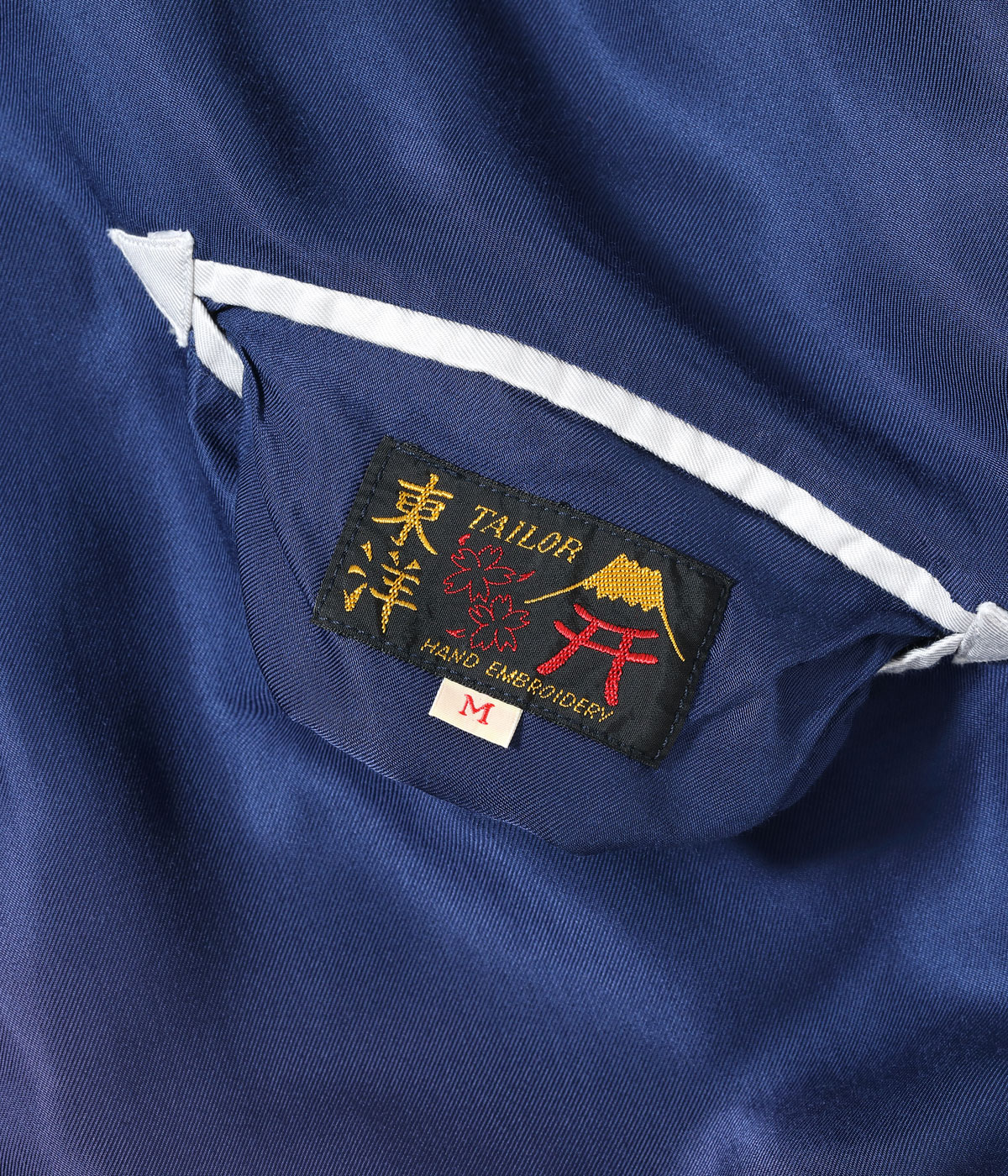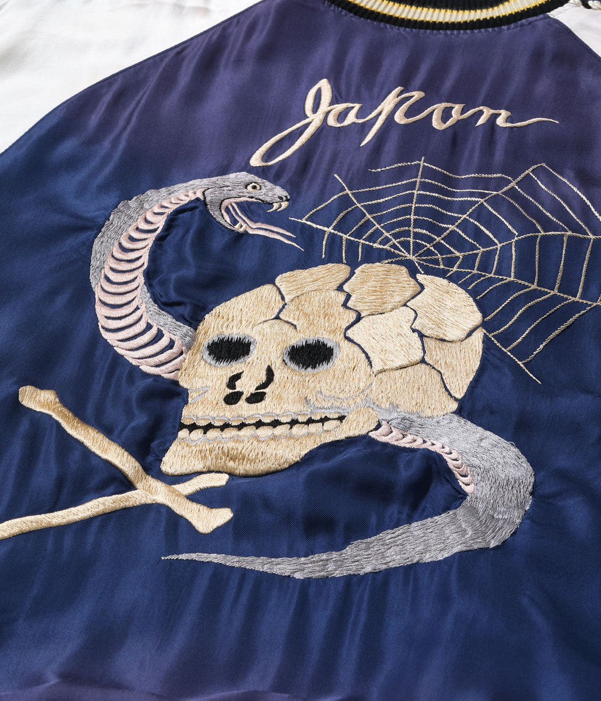 빈티지 제품 중에서도 현존 수량이 극히 적고, 시장에서는 믿기 어려운 가격으로 거래되는 ‘해골 자수 패턴’을 에이징 모델로 복각한 제품입니다. 리버시블면에는 드래곤 헤드라 불리는 용 머리 자수가 정교하게 표현되어 있습니다.