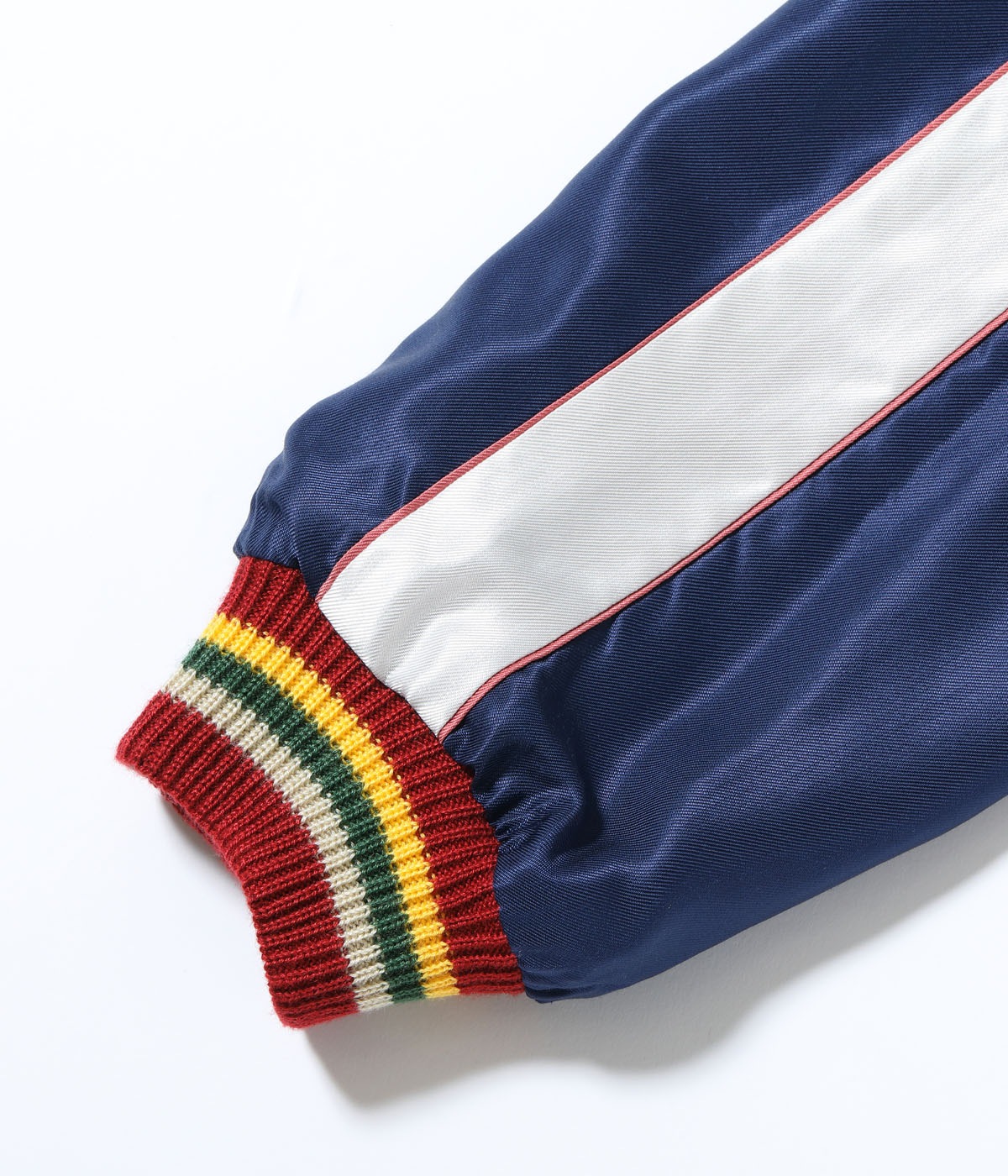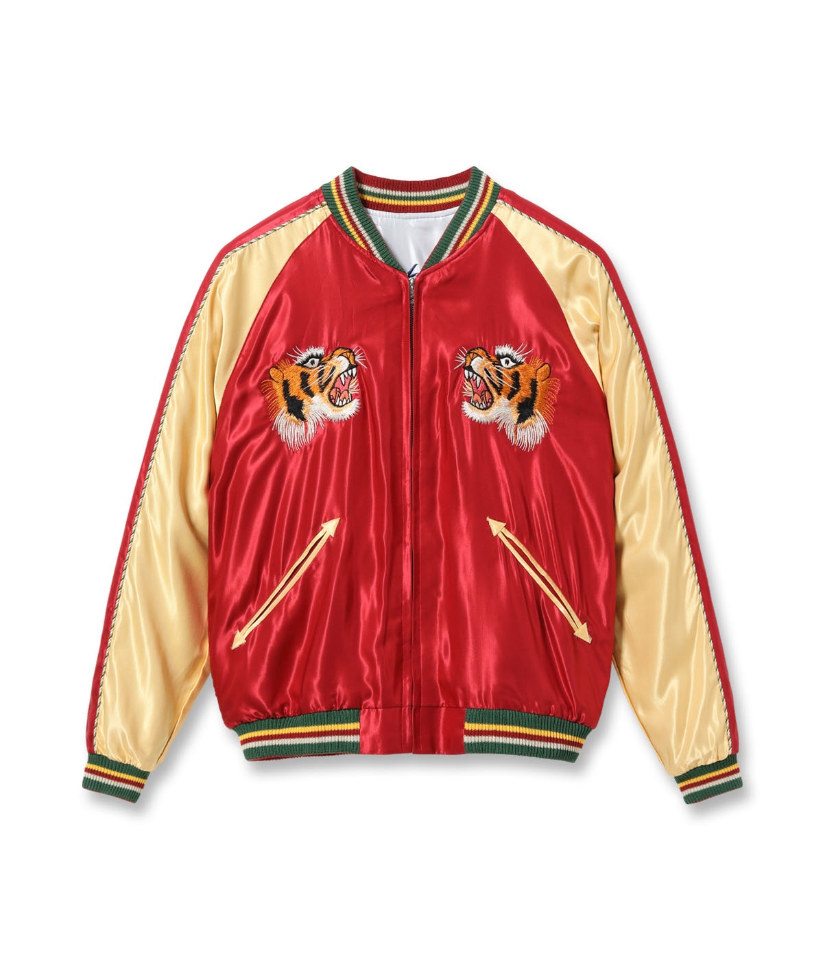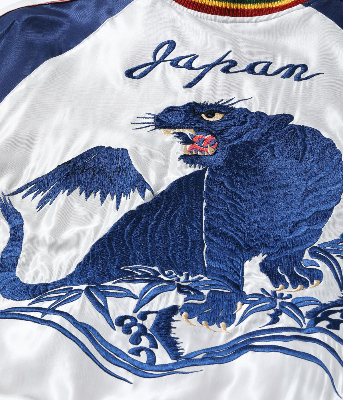앞면은 깊이 있는 와인 컬러의 바탕에 오렌지 그라데이션으로 표현된 독수리 자수가 돋보이며, 날개의 디테일이 정교하게 살아 있습니다. 리버서블 면은 소매 아래 부분이 몸판보다 짙은 실버×네이비 역배색 바디에, 강렬한 포효 포즈의 블루 타이거가 배치되어 있습니다.