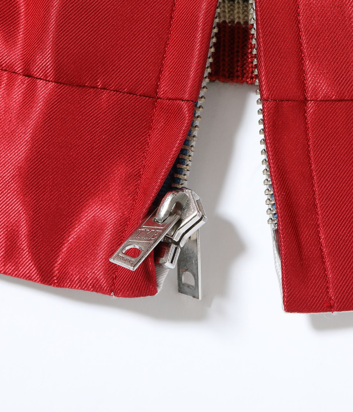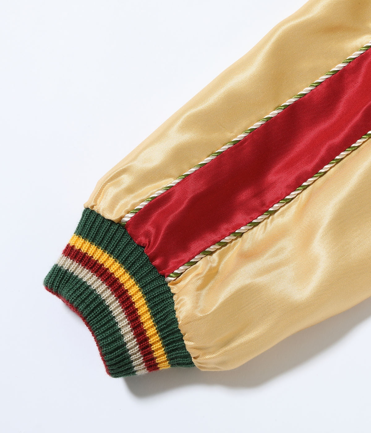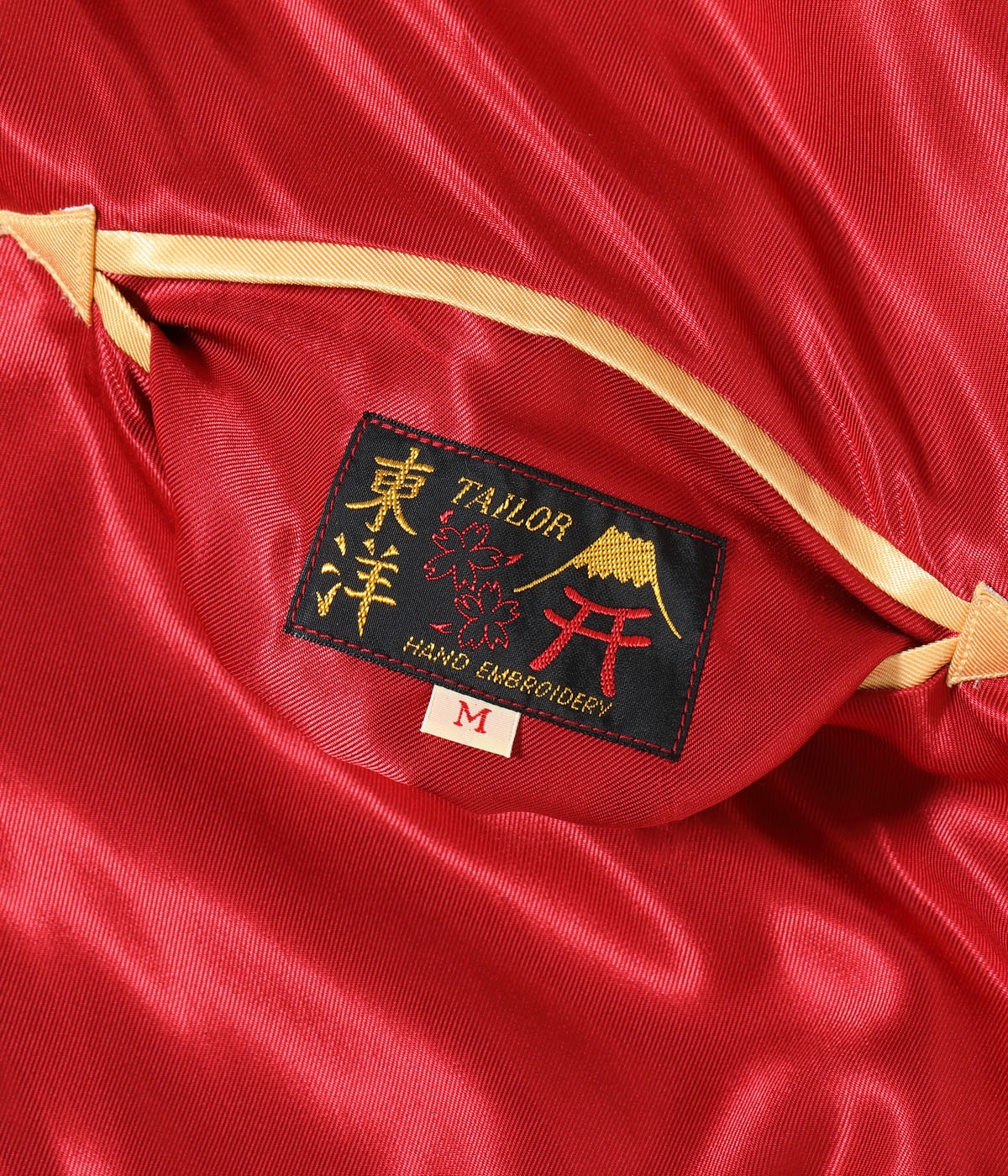 앞면은 깊이 있는 와인 컬러의 바탕에 오렌지 그라데이션으로 표현된 독수리 자수가 돋보이며, 날개의 디테일이 정교하게 살아 있습니다. 리버서블 면은 소매 아래 부분이 몸판보다 짙은 실버×네이비 역배색 바디에, 강렬한 포효 포즈의 블루 타이거가 배치되어 있습니다.