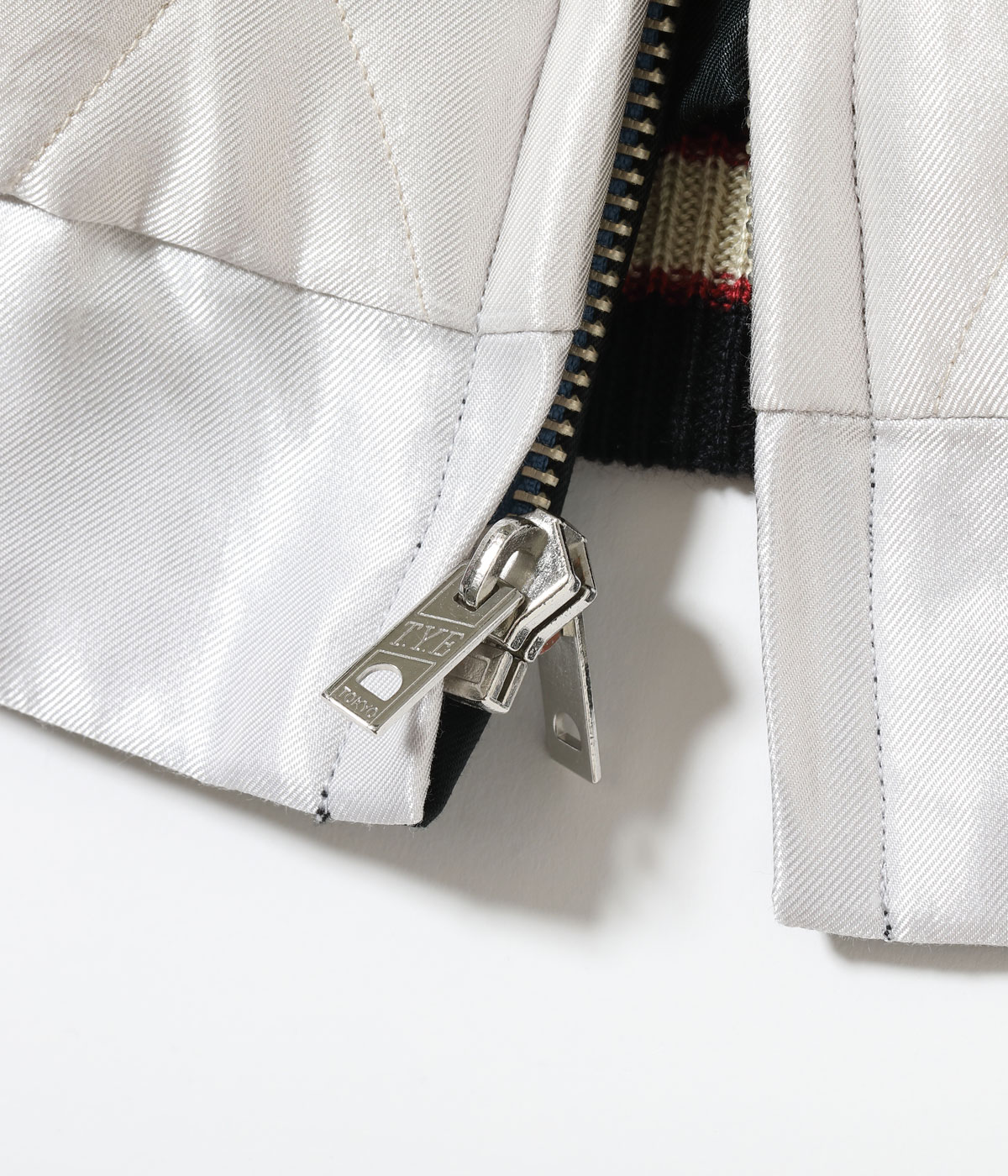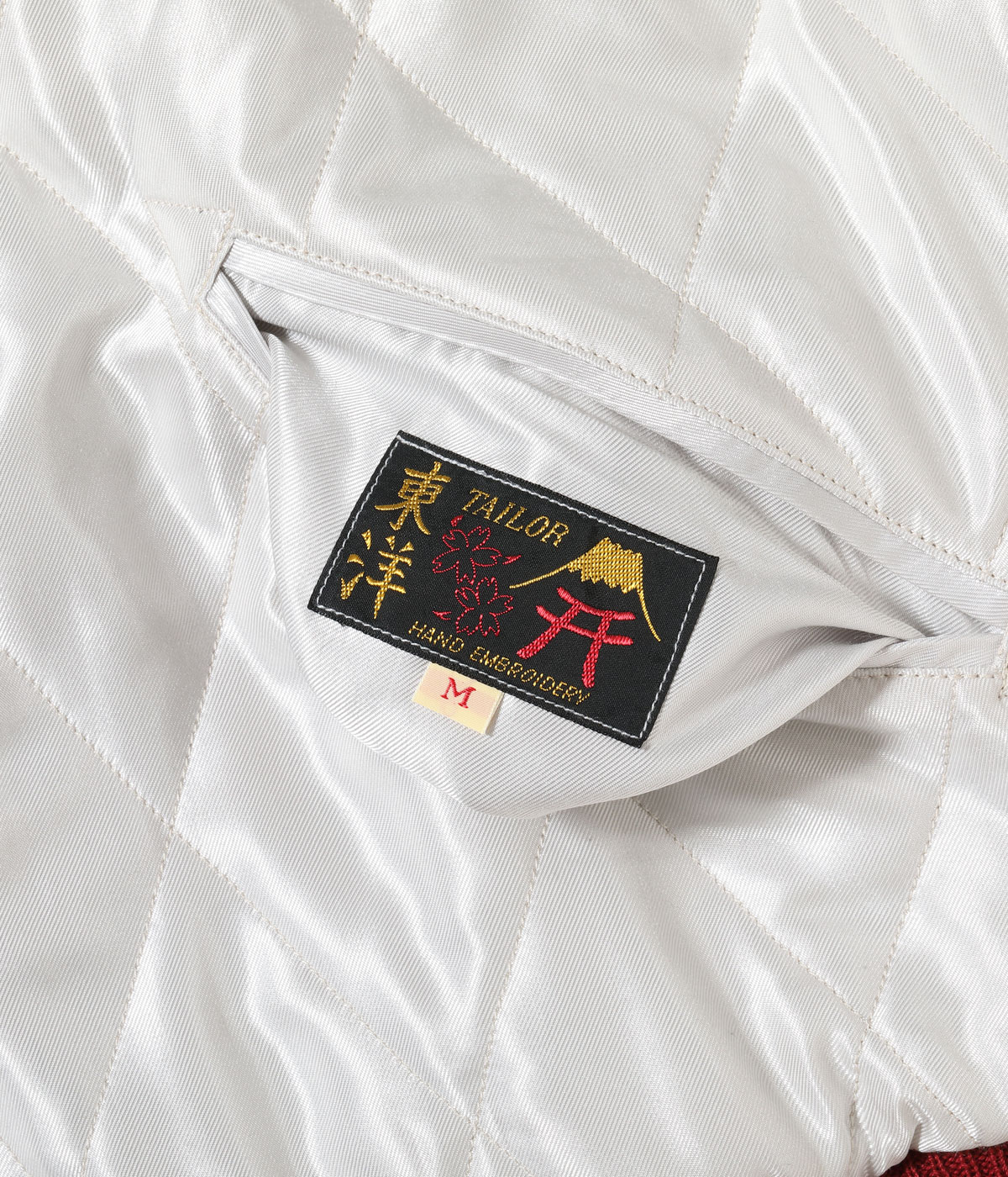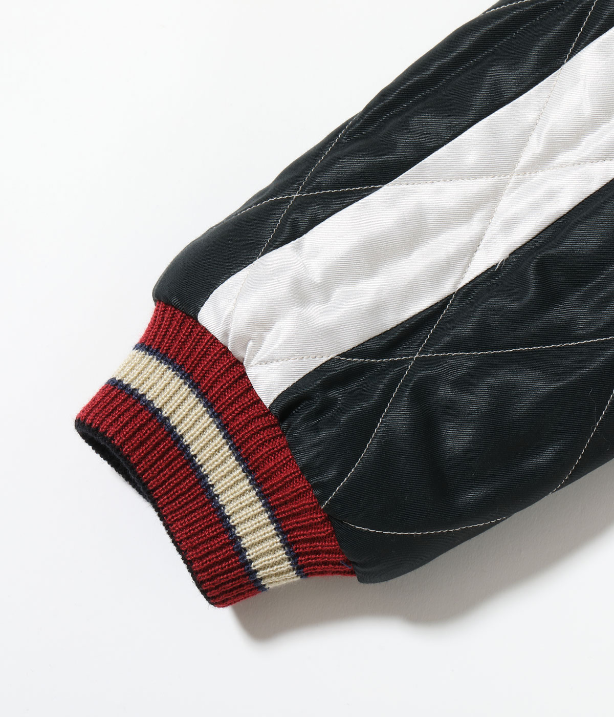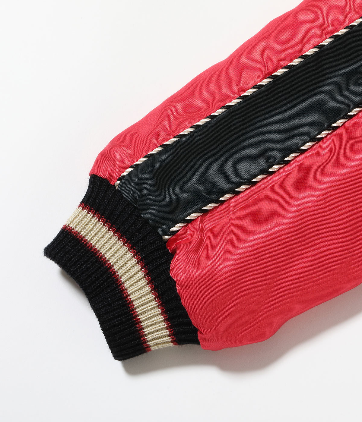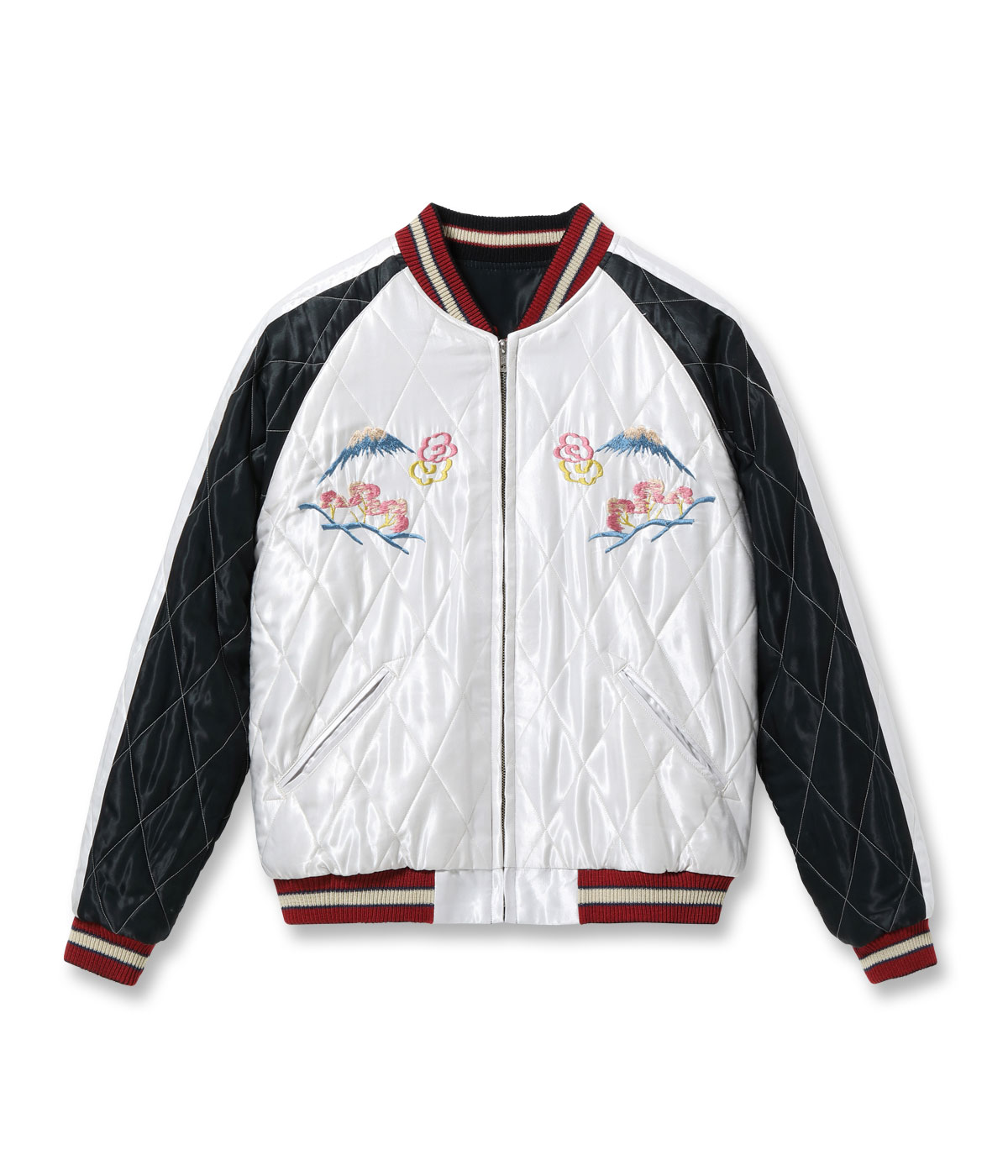 명승지로 유명한 마츠바라 미호 풍경 패턴의 스카잔입니다. 바디에 실버 소매에는 검은색으로 ‘리버스 컬러 배합’ 사양이 입니다. 뒤집을 수 있는 표면은 검은색× 빨간색 몸체에 빨간색과 흰색의 쌍용으로 자수를 놓았습니다. 후지산을 배경으로 하늘에서 내려오는 백룡과 파도를 일으키며 바다에서 나타나는 붉은 용이 서로 마주보고 있어 용의 해에 어울리는 그림입니다.