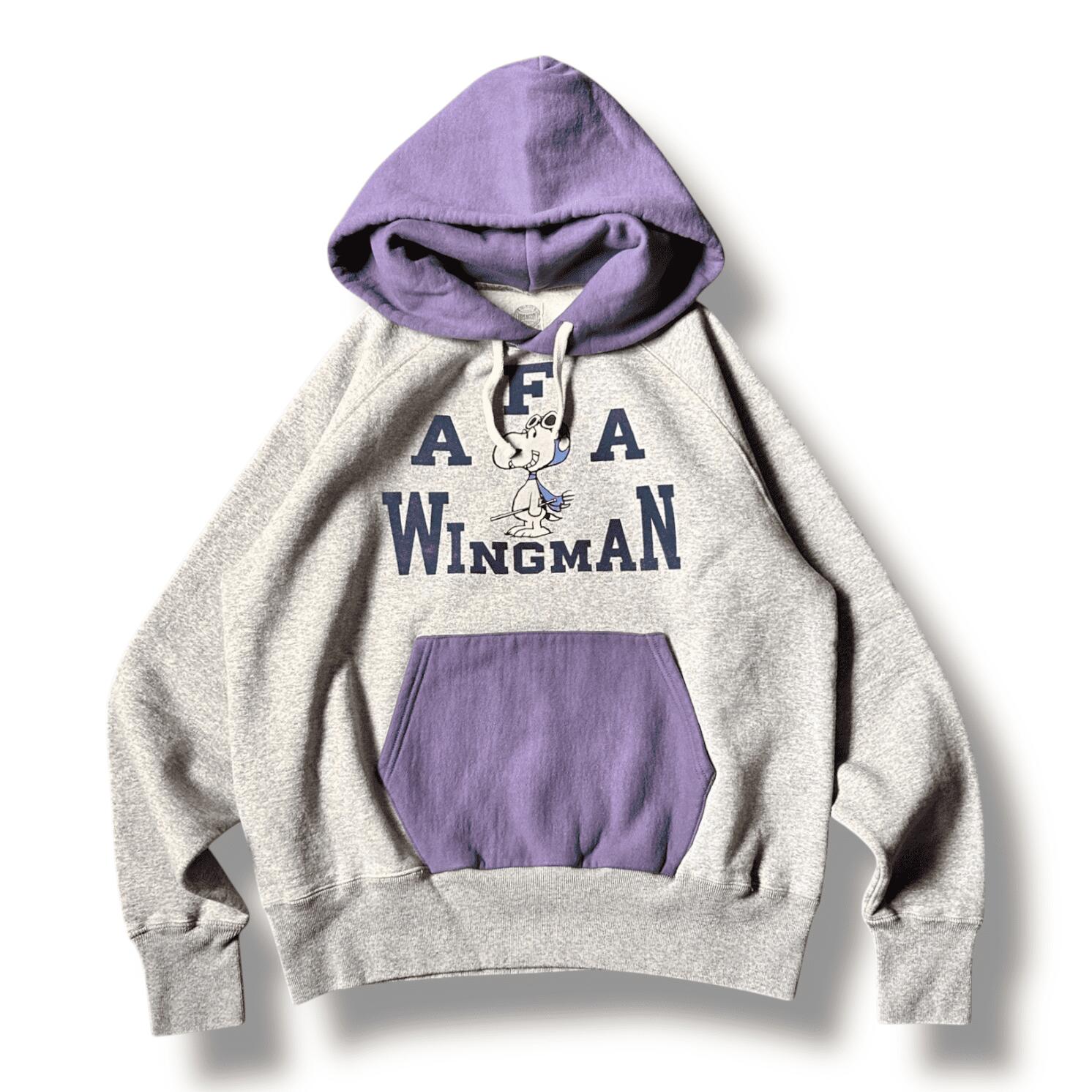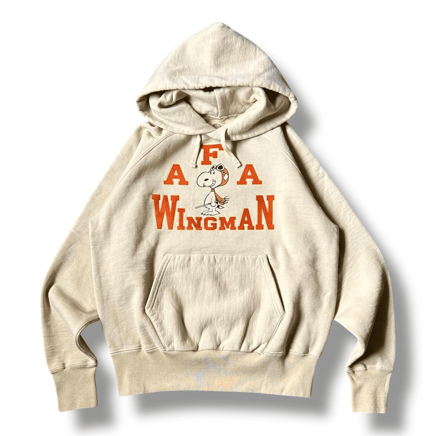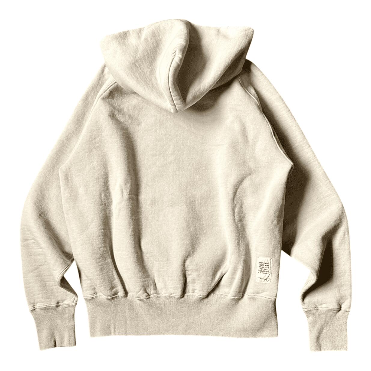 직물 자체의 무게감으로 절묘한 텐션을 살리면서 원통형으로 짜내는 구식 츠리 편직기로 제작한 기모 안감 스웨트 후디.