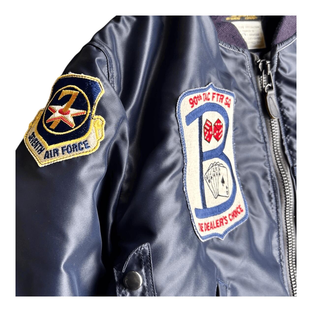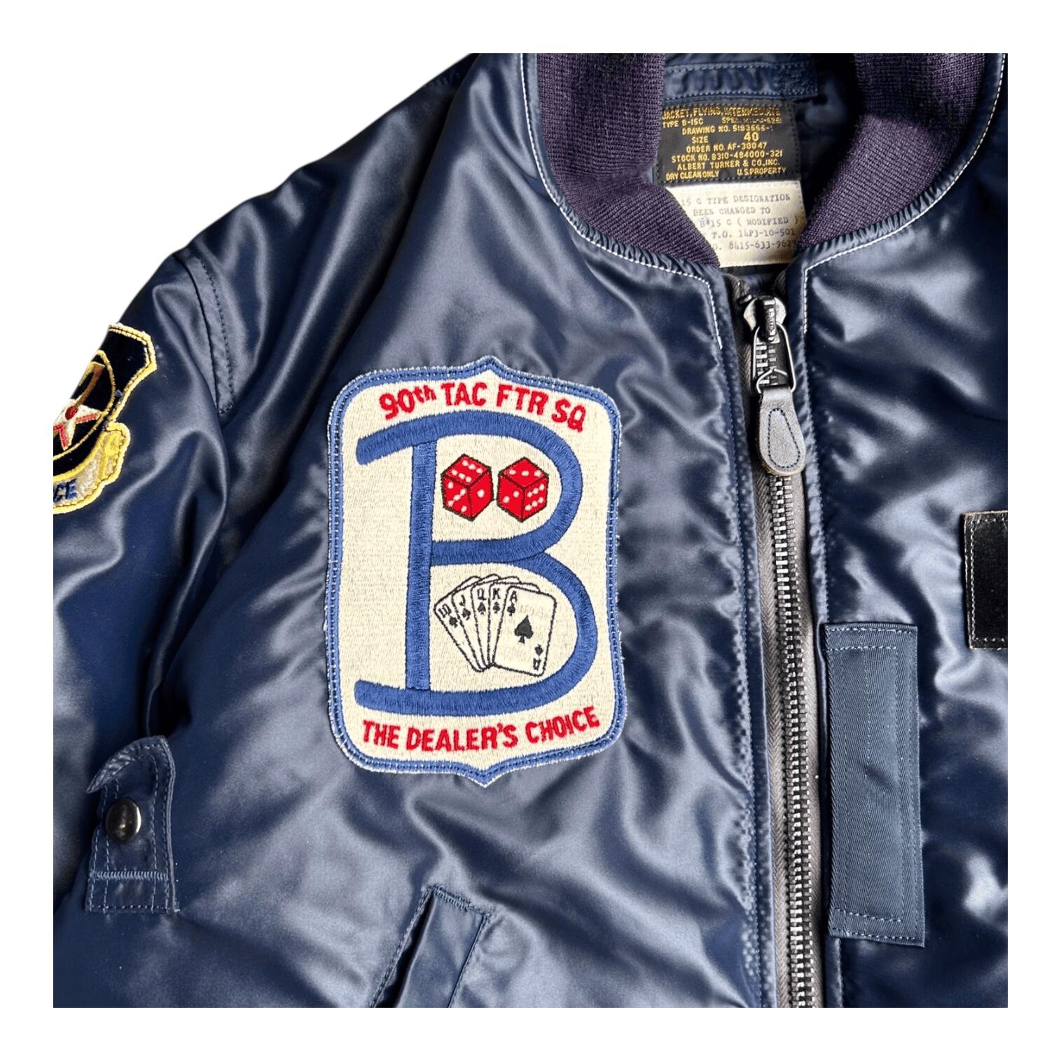 왼쪽 가슴에는 금박 네임플레이트, 오른쪽 가슴에는 90th TAC FTR SQ 자수 패치, 오른팔에는 제7항공군 자수 패치가 부착되어 있습니다.