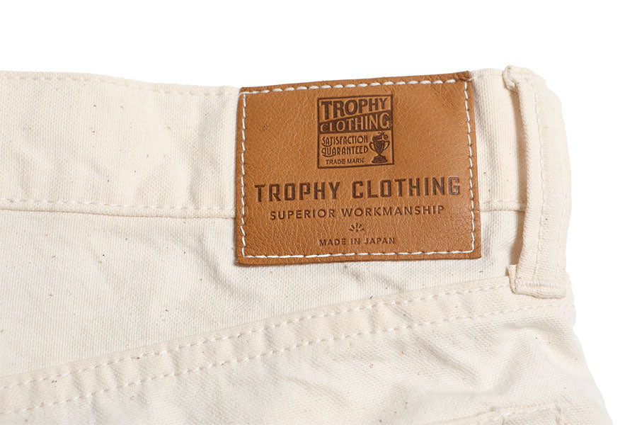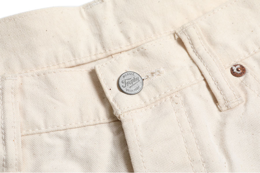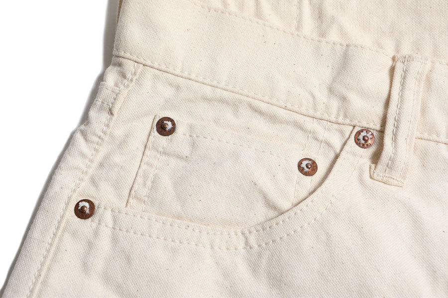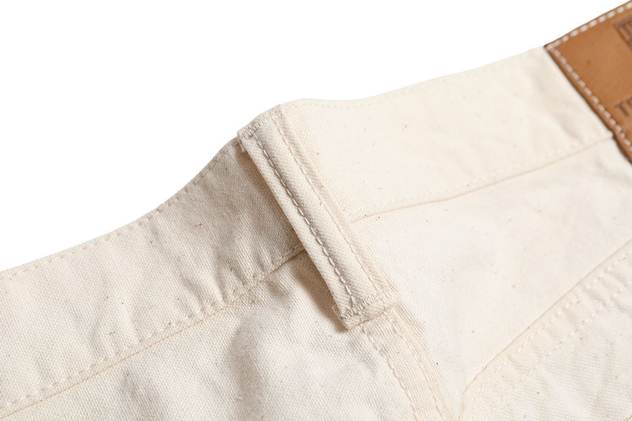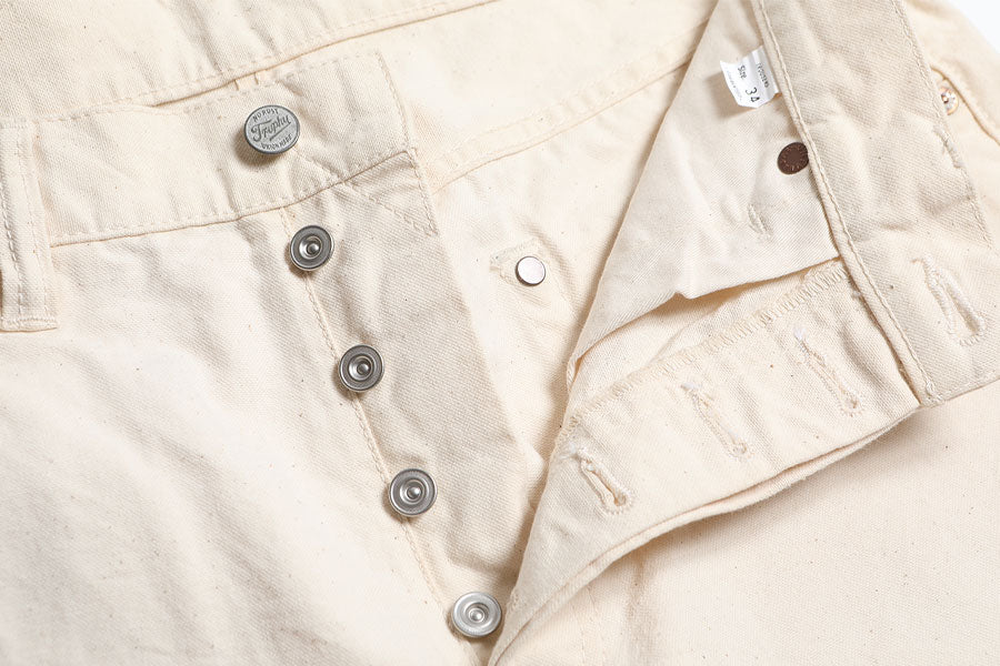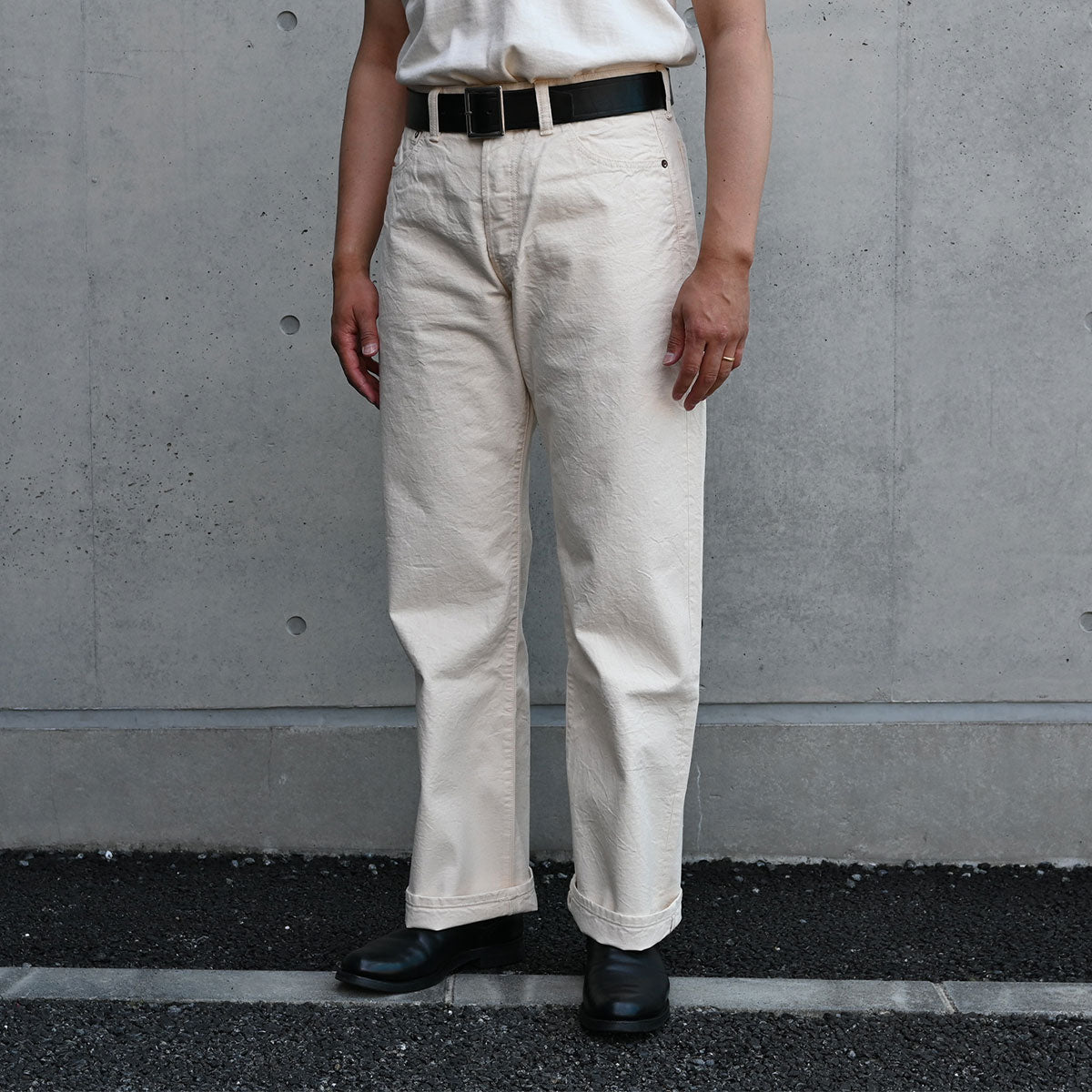 옛 방식의 셔틀 직기로 짜낸 미염색 내추럴 덕 원단 으로 제작한 테이퍼드 팬츠입니다.