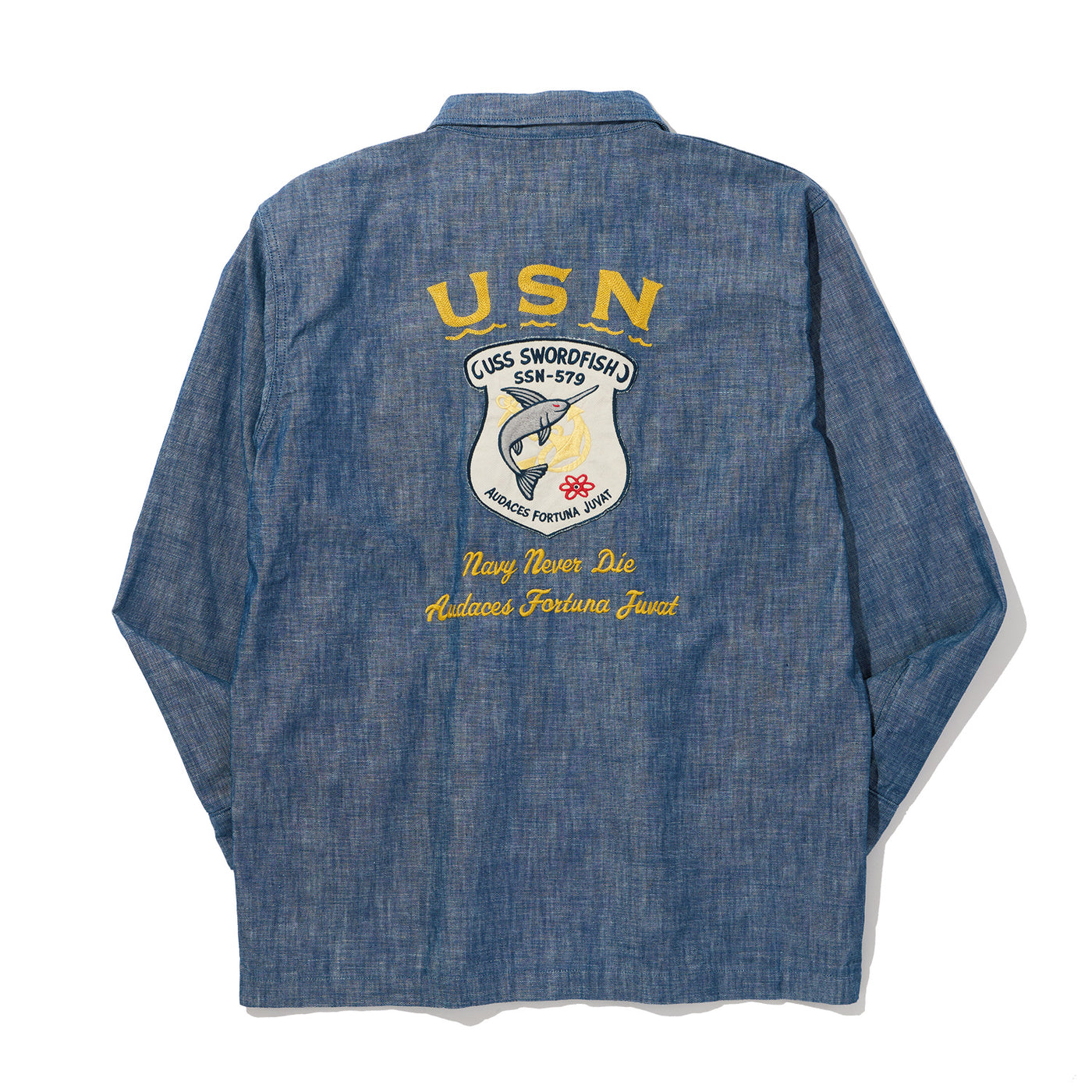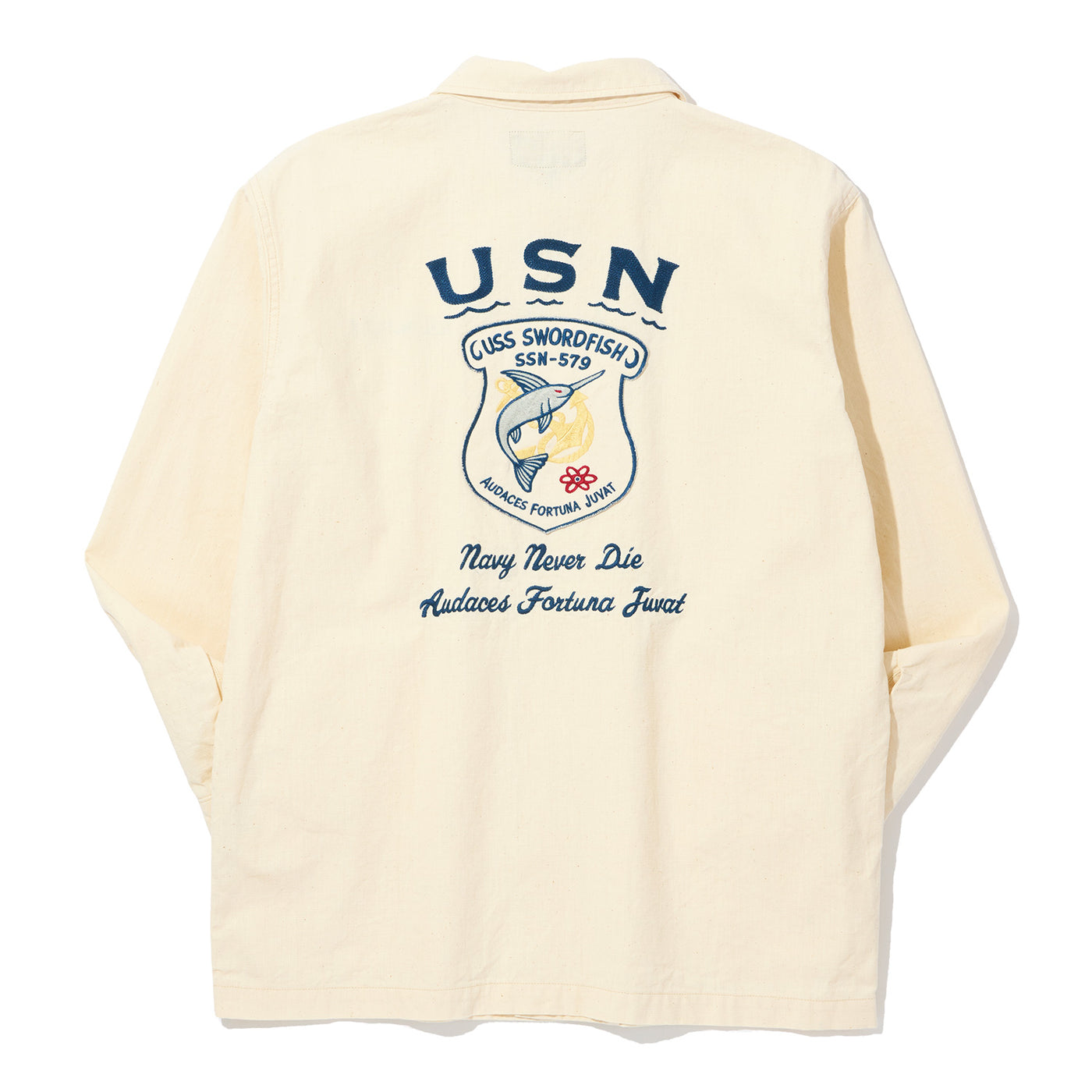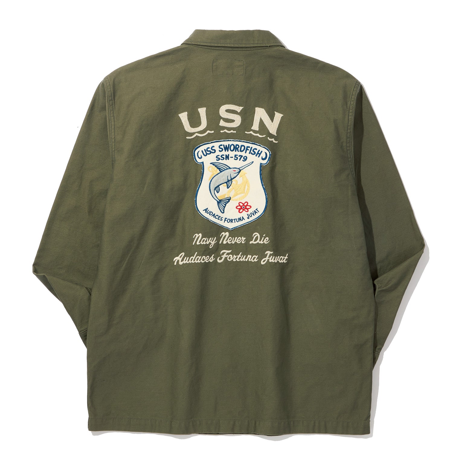 디자인 모티브는 태평양 함대에서 활약한 미 해군 원자력 잠수함 “Swordfish”. 등 부분에는 “Audaces Fortuna Juvat”라는 라틴어 문구가 자수로 새겨져 있습니다.곳곳에 와펜과 자수 디테일이 있습니다.