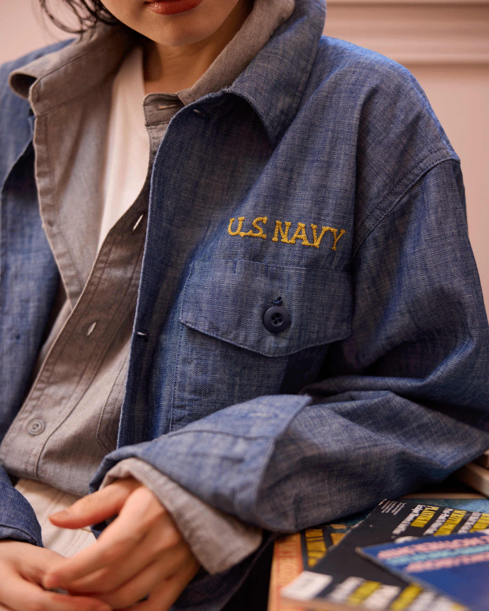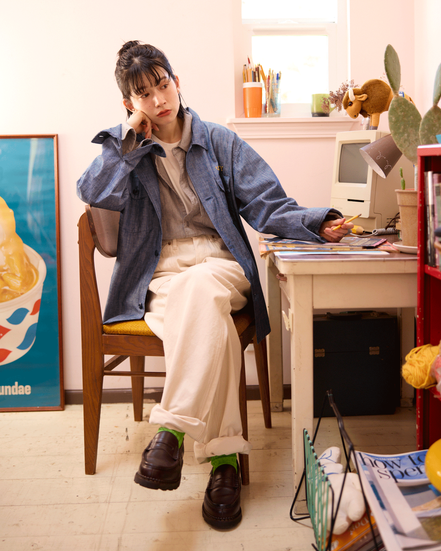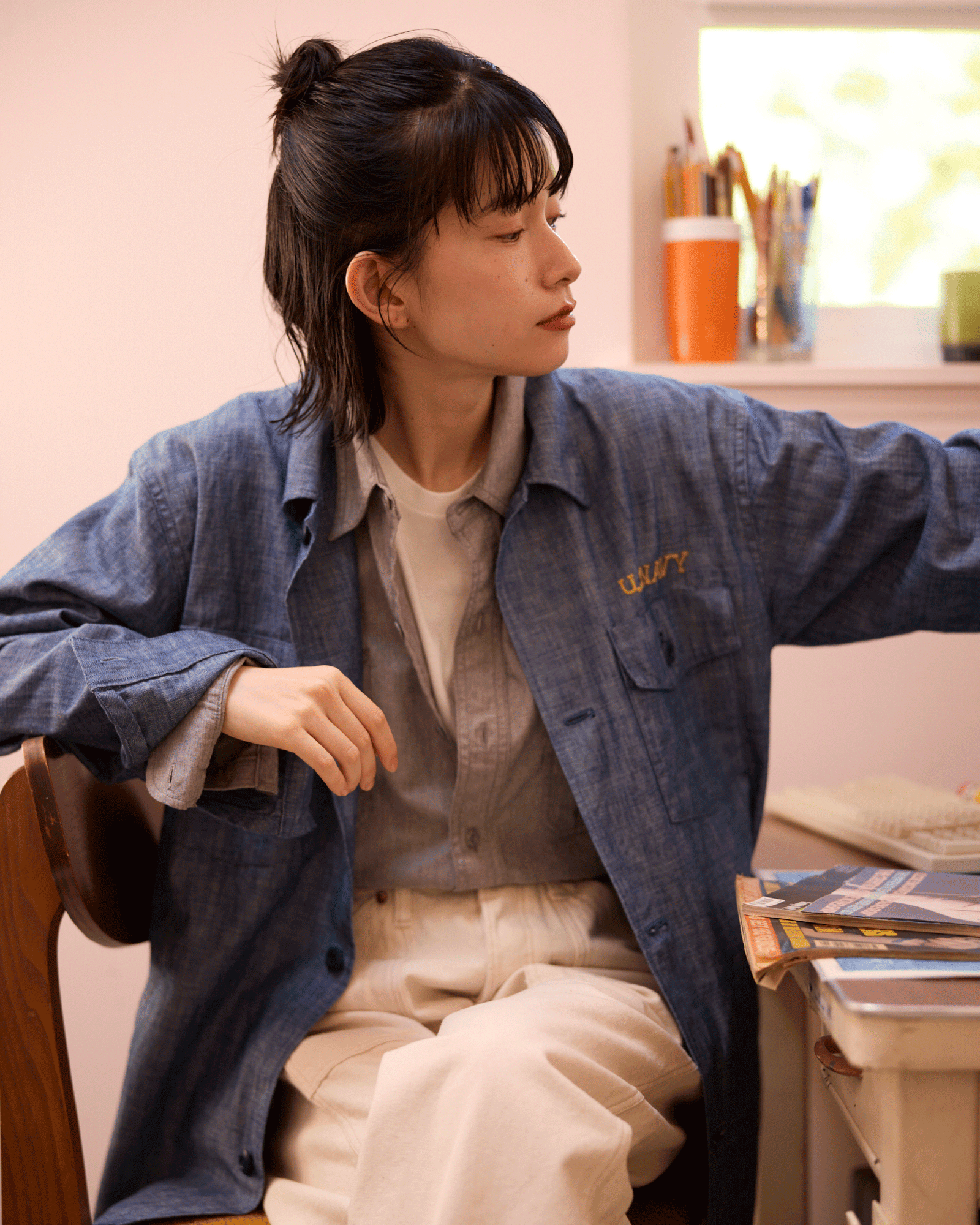 올리브 컬러에는 슬럽사로 고밀도 직조한 백사틴 원단을, 인디고와 내추럴 컬러에는 굵은 무라사로 짠 오리지널 헤비온스 샴브레이 원단을 사용했습니다.