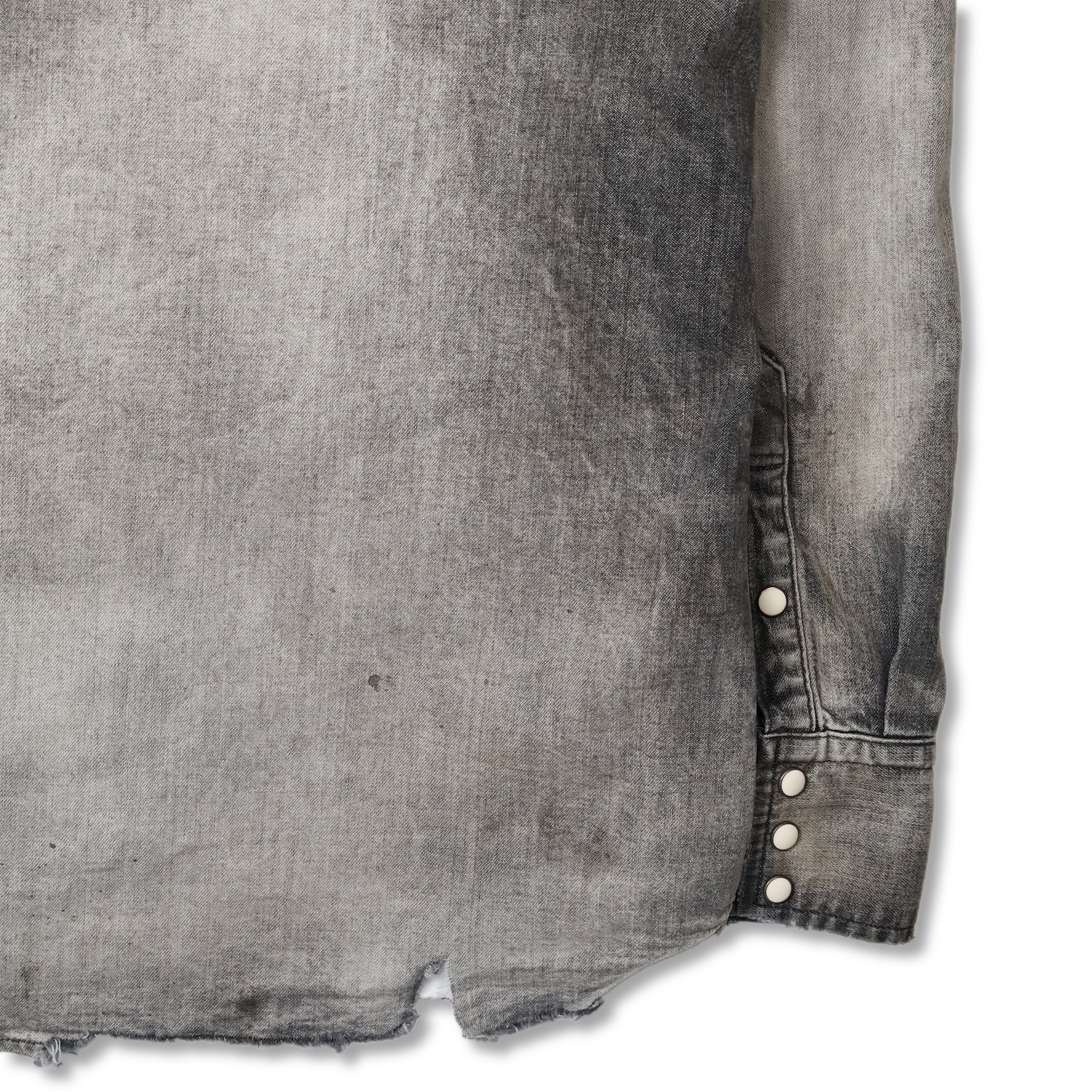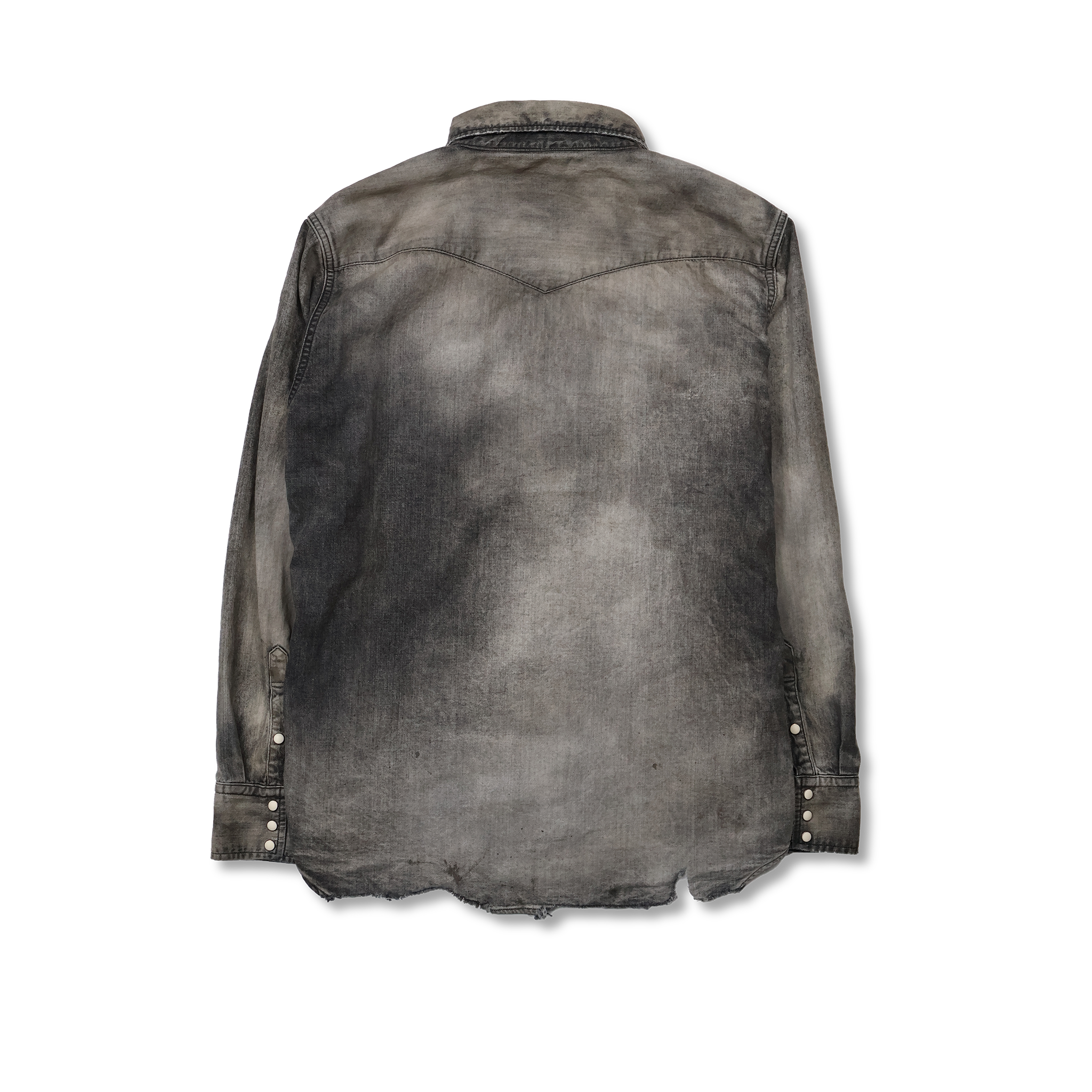 기본형 웨스턴 셔츠 실루엣에 강렬한 데미지 & 브러시드 가공 을 더한 셔츠.