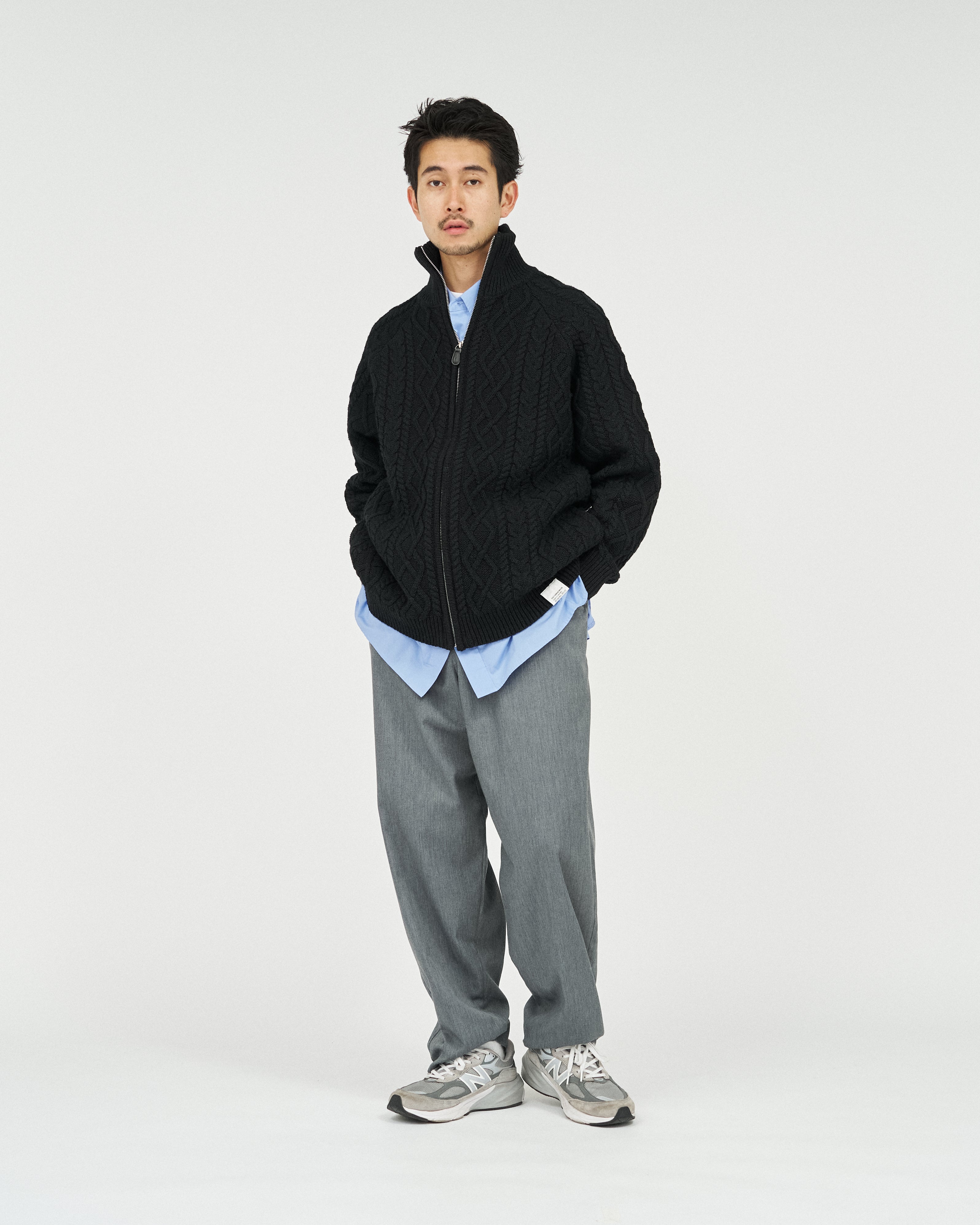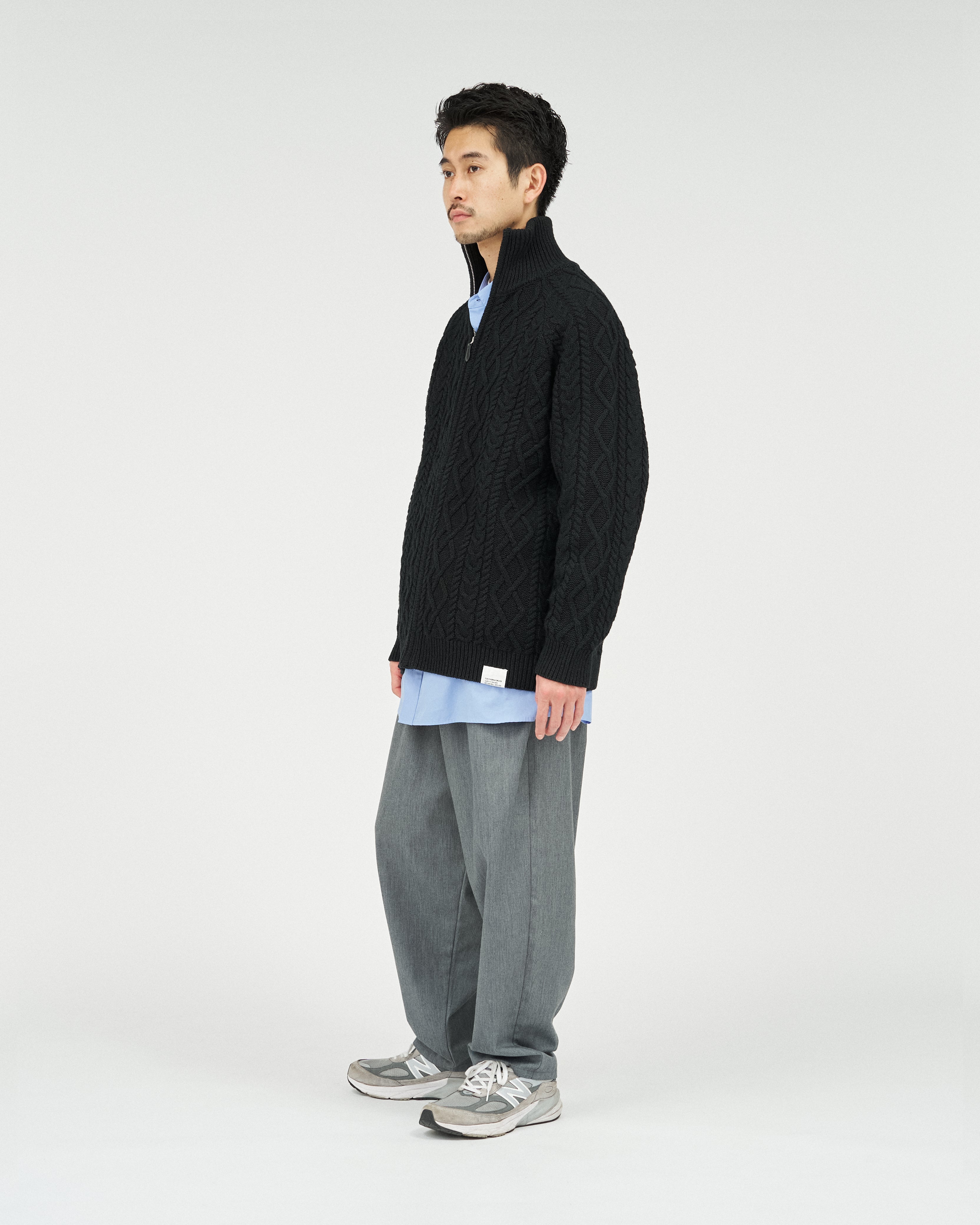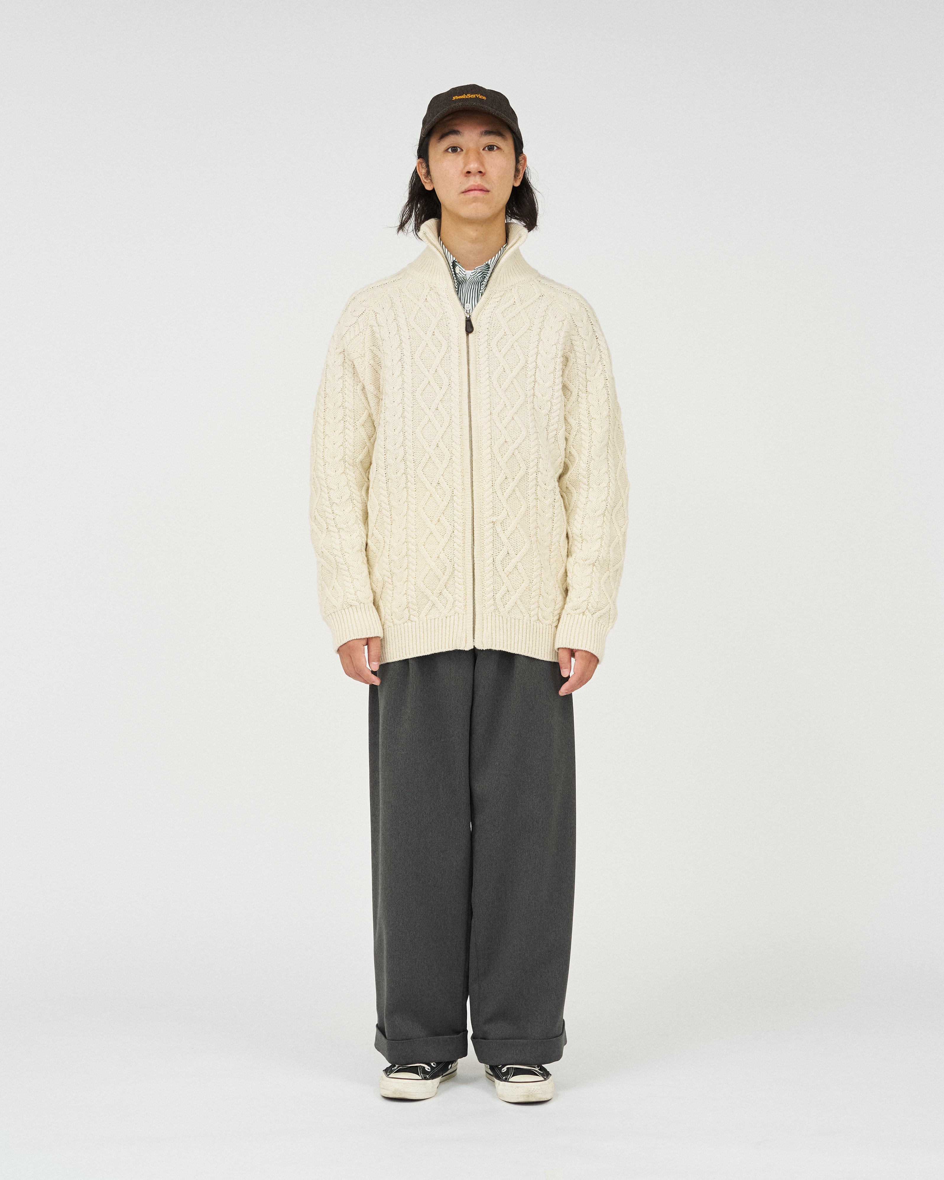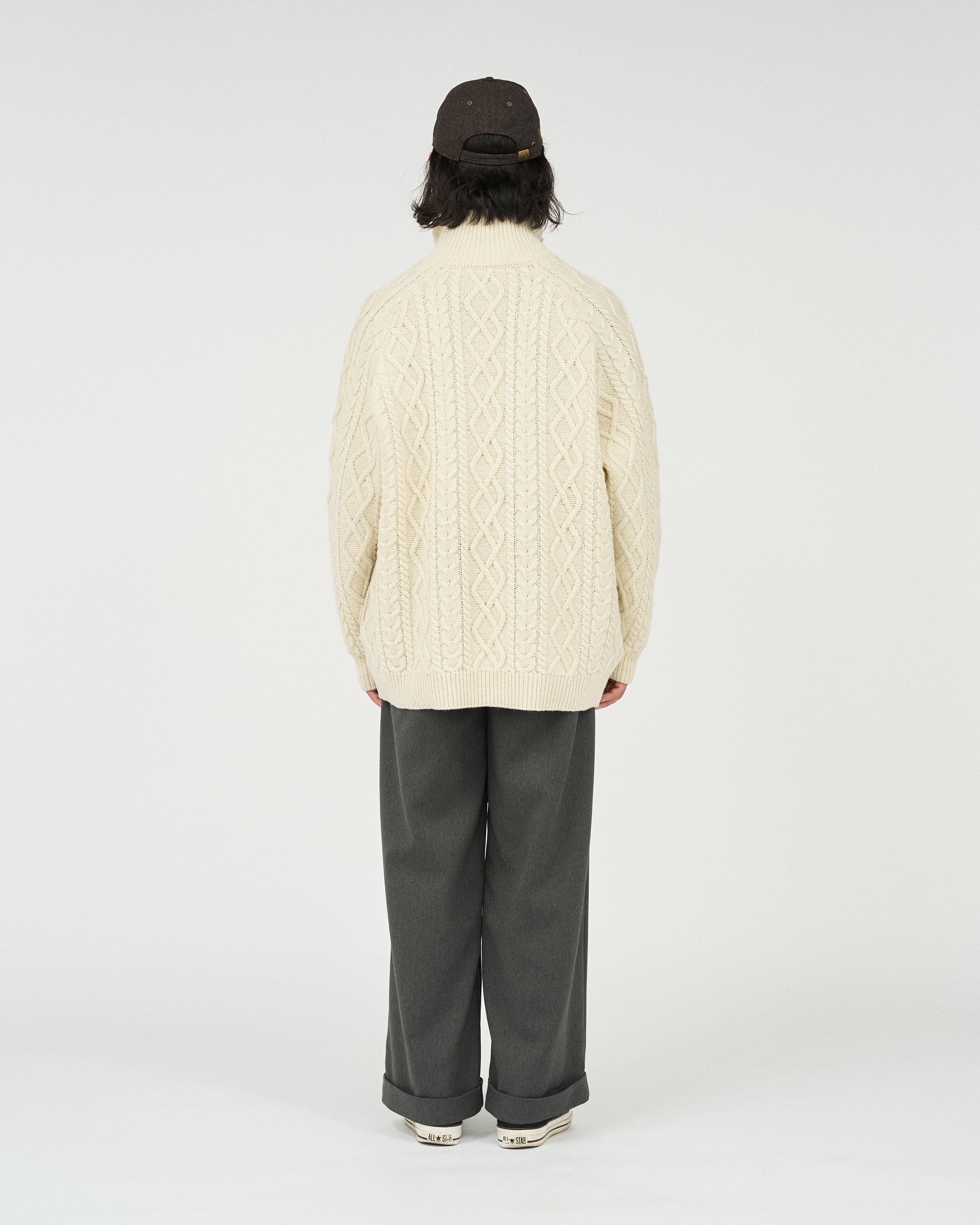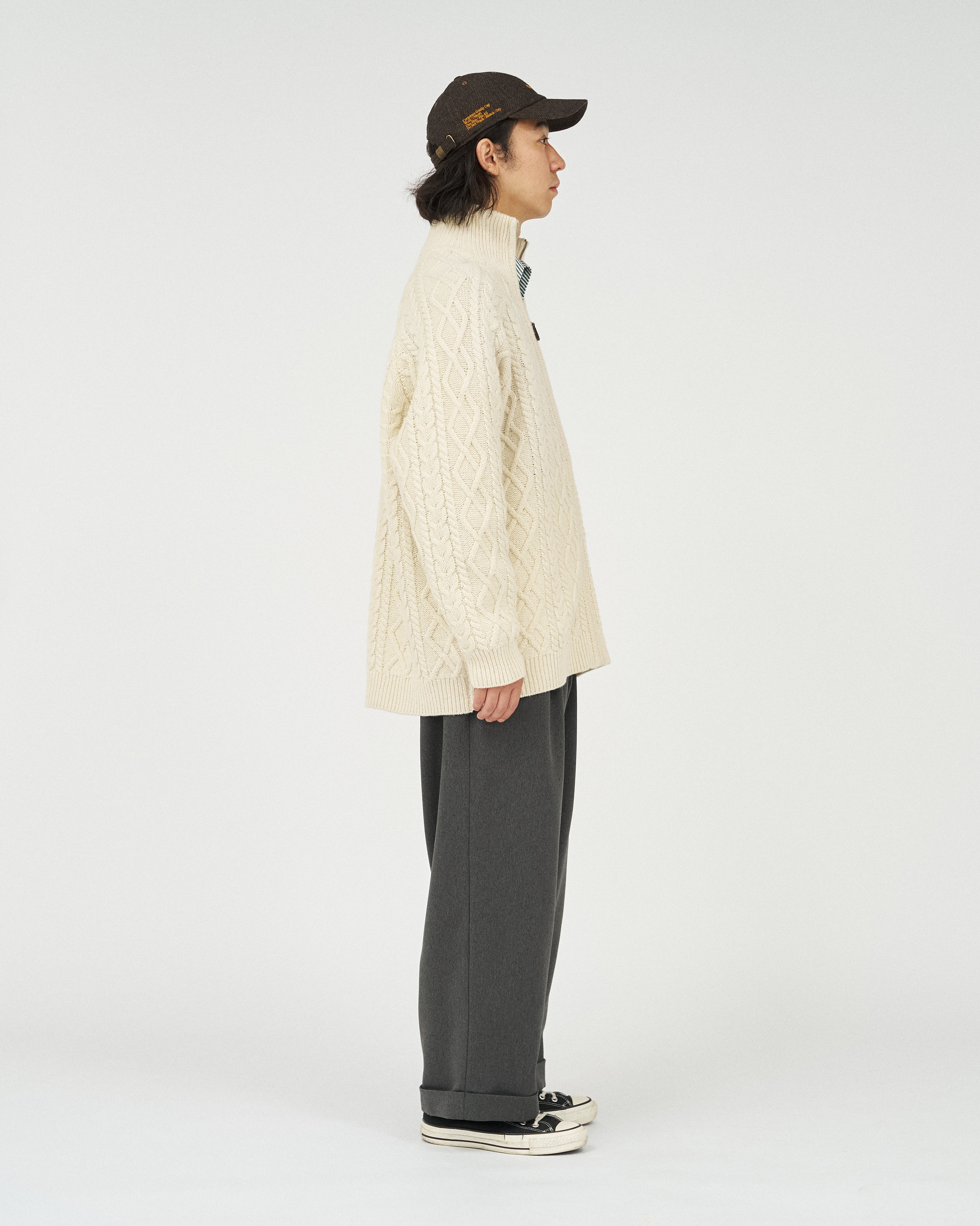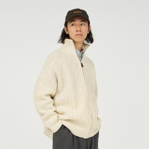 전통적인 아란 니트를 현대적으로 재해석한 피셔맨 집업 스웨터입니다. 울 고유의 따뜻하고 풍성한 질감을 유지하면서 기능성을 더한 하이브리드 아이템으로 완성했습니다.