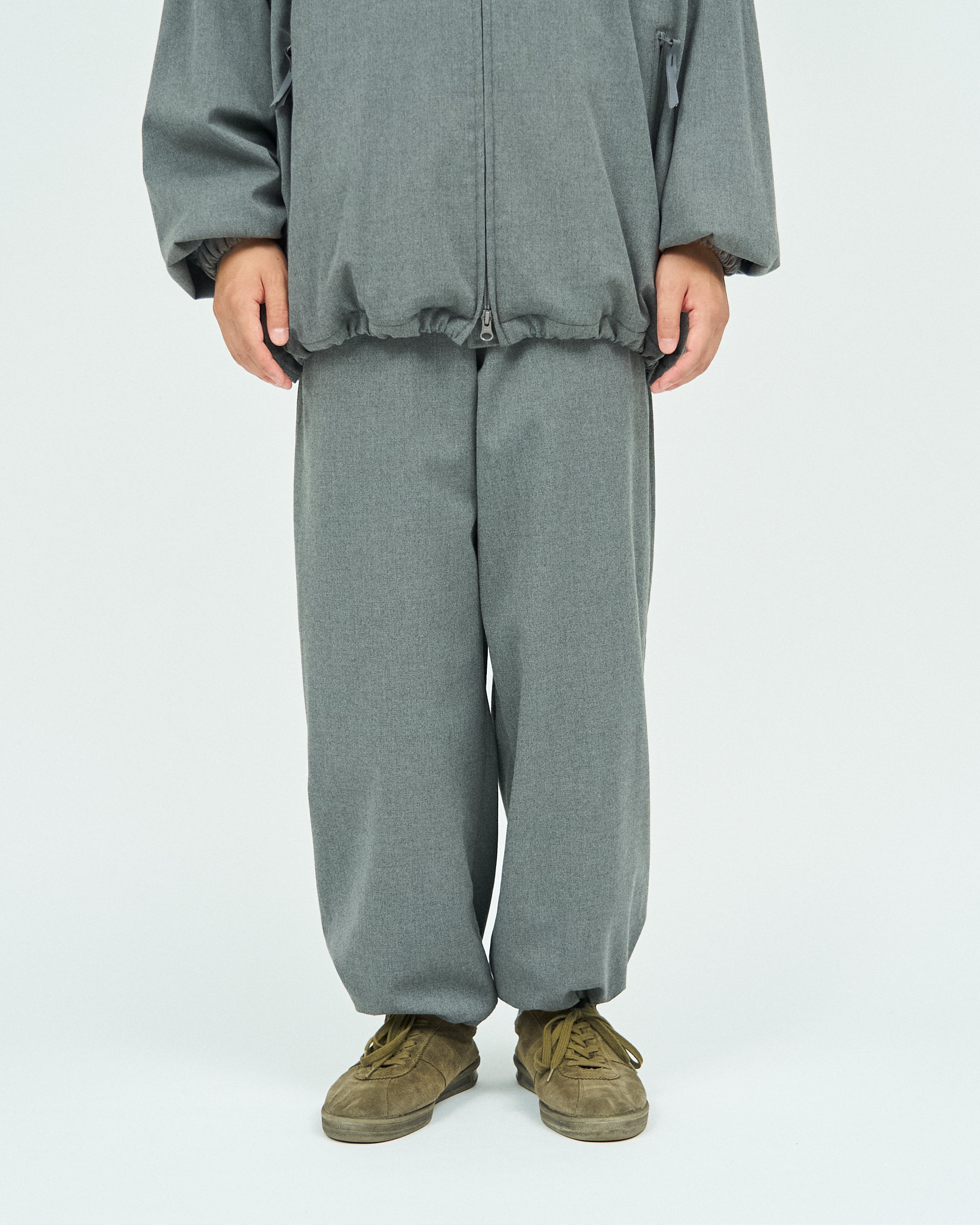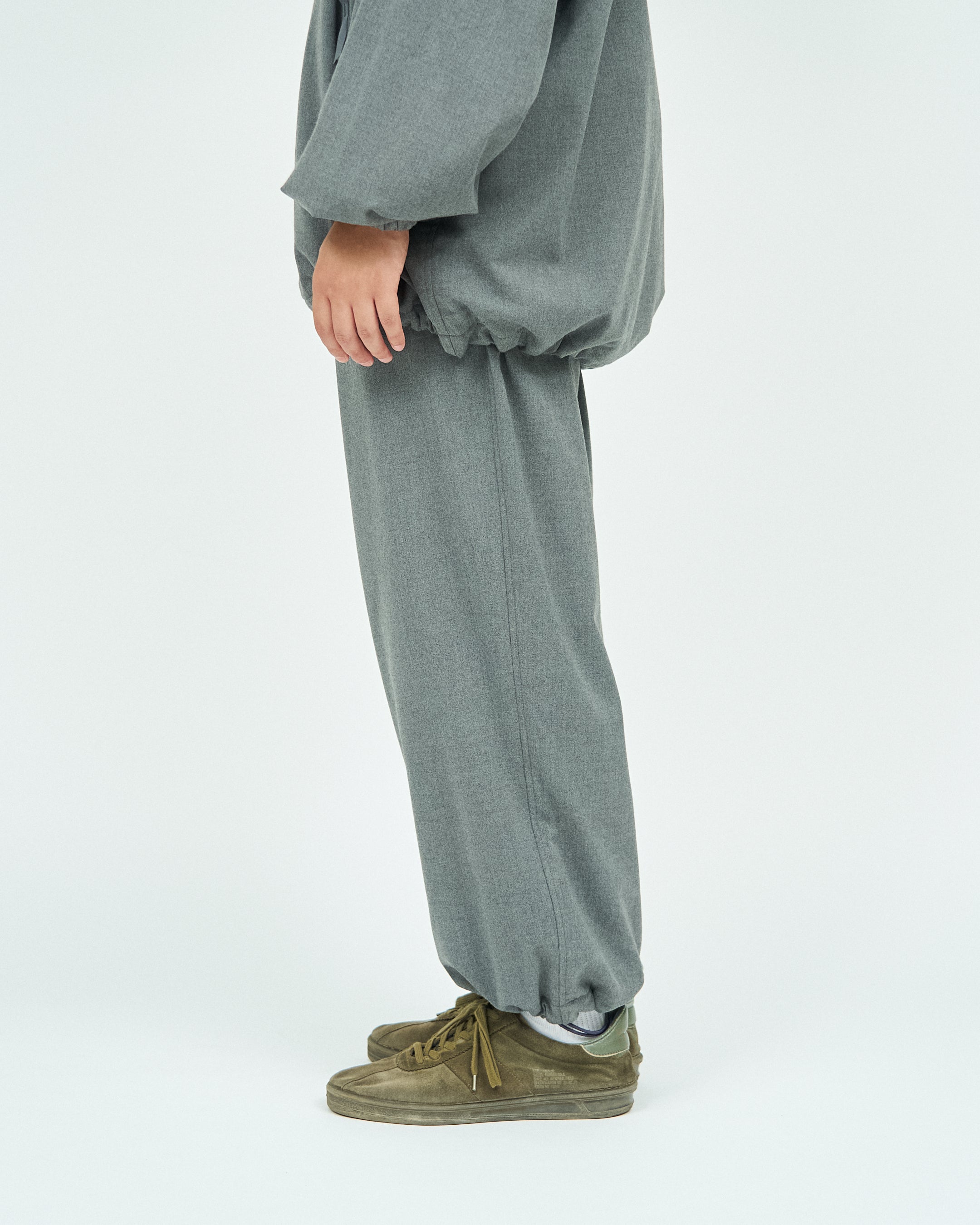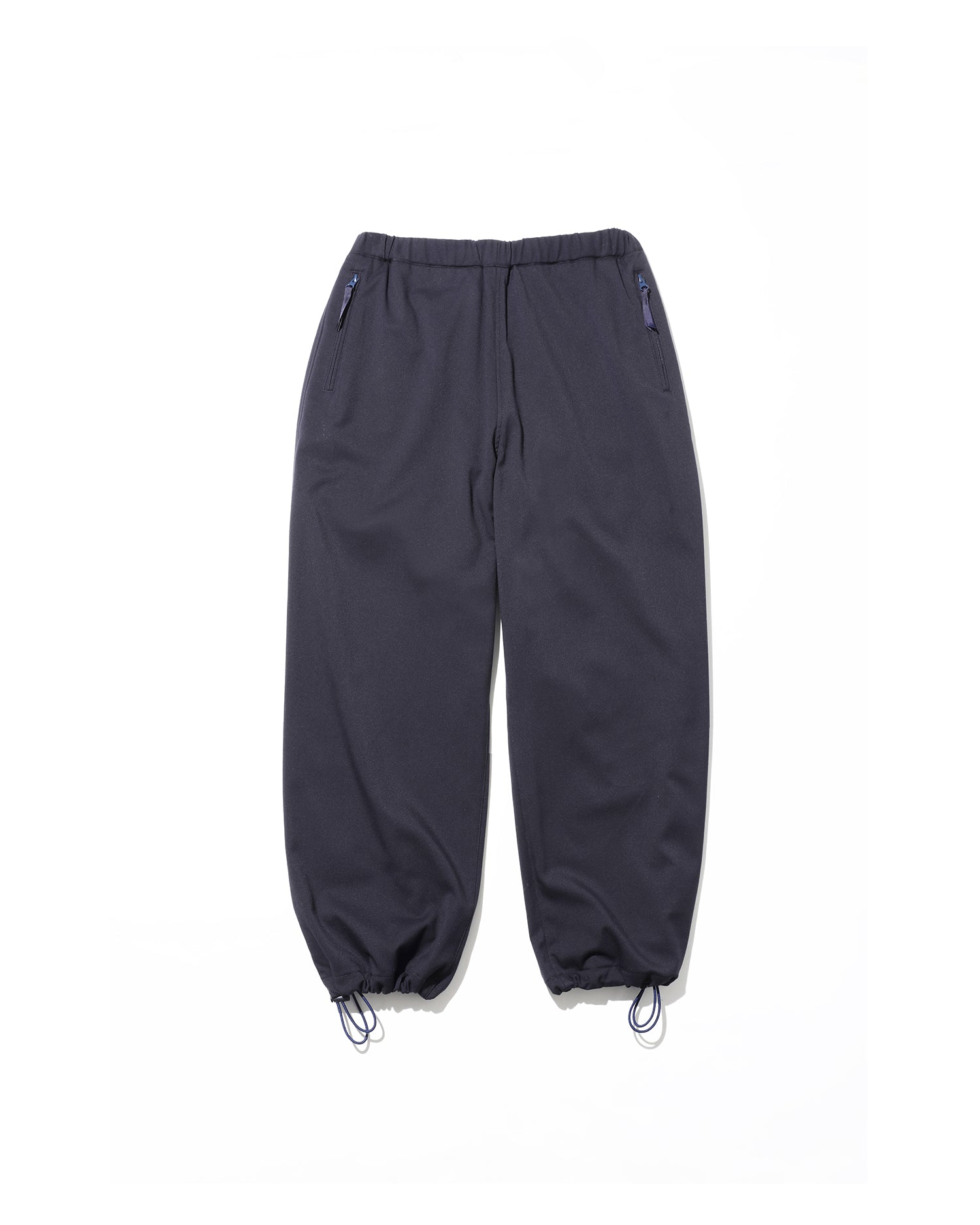 오버팬츠 타입의 트랙 팬츠. 겉감은 울과 같은 기능성 원단으로 만들어져 신축성이 뛰어나고 보풀에 강하고 가정에서 세탁할 수 있습니다. 따뜻하고 유연한 질감이 특징입니다. 안감은 TEIJIN이 개발한 기능성 소재 “Octa”로 제작되었습니다. 땀흡수, 속건성, 경량화, 보온성 등 다양한 기능을 가지고 있어 땀을 빠르게 흡수하고 끈적거리지 않습니다. 허리에서 옷자락까지 볼륨감 있는 실루엣이 특징으로, 옷자락의 드로스트링으로 실루엣을 조정할 수 있다.