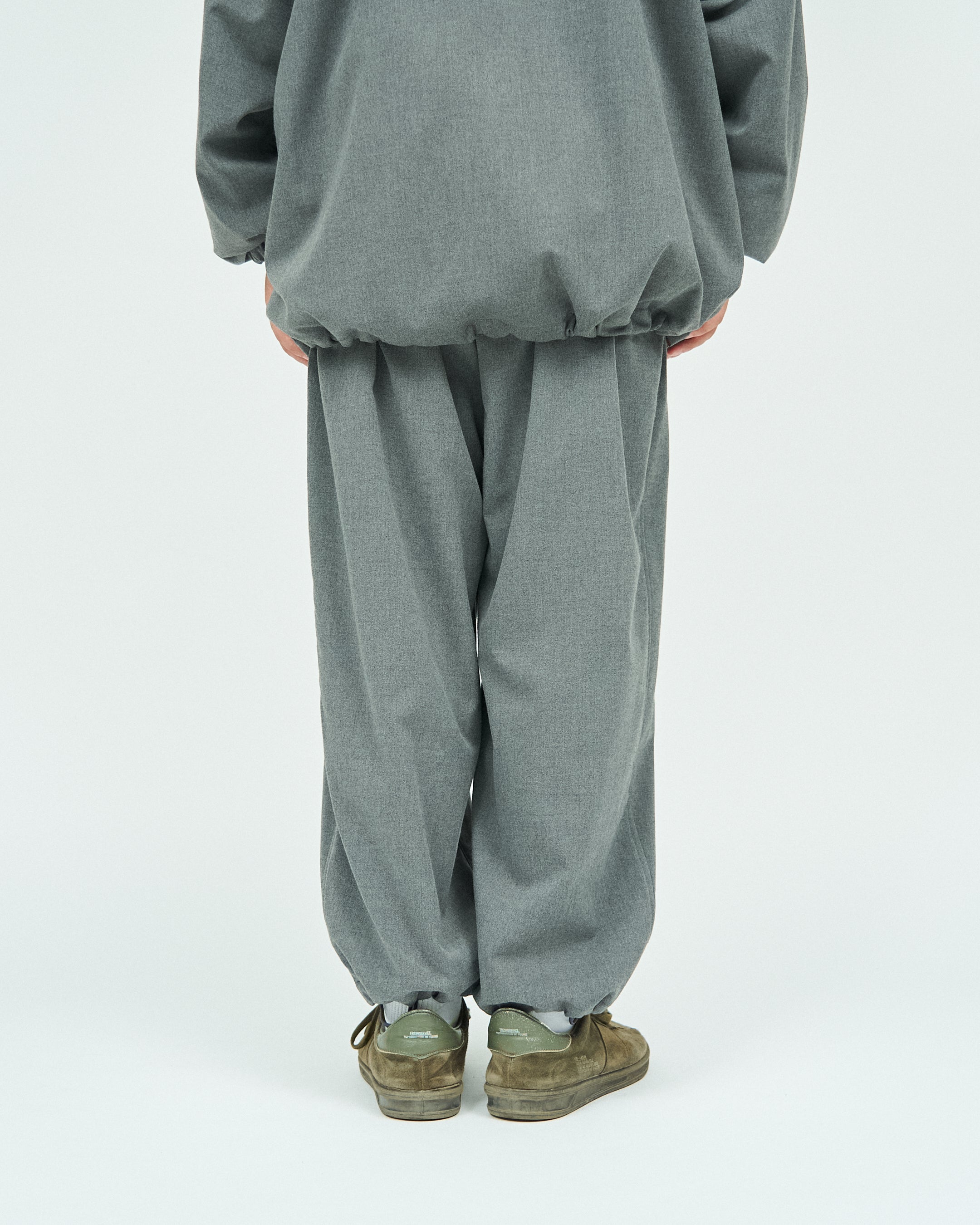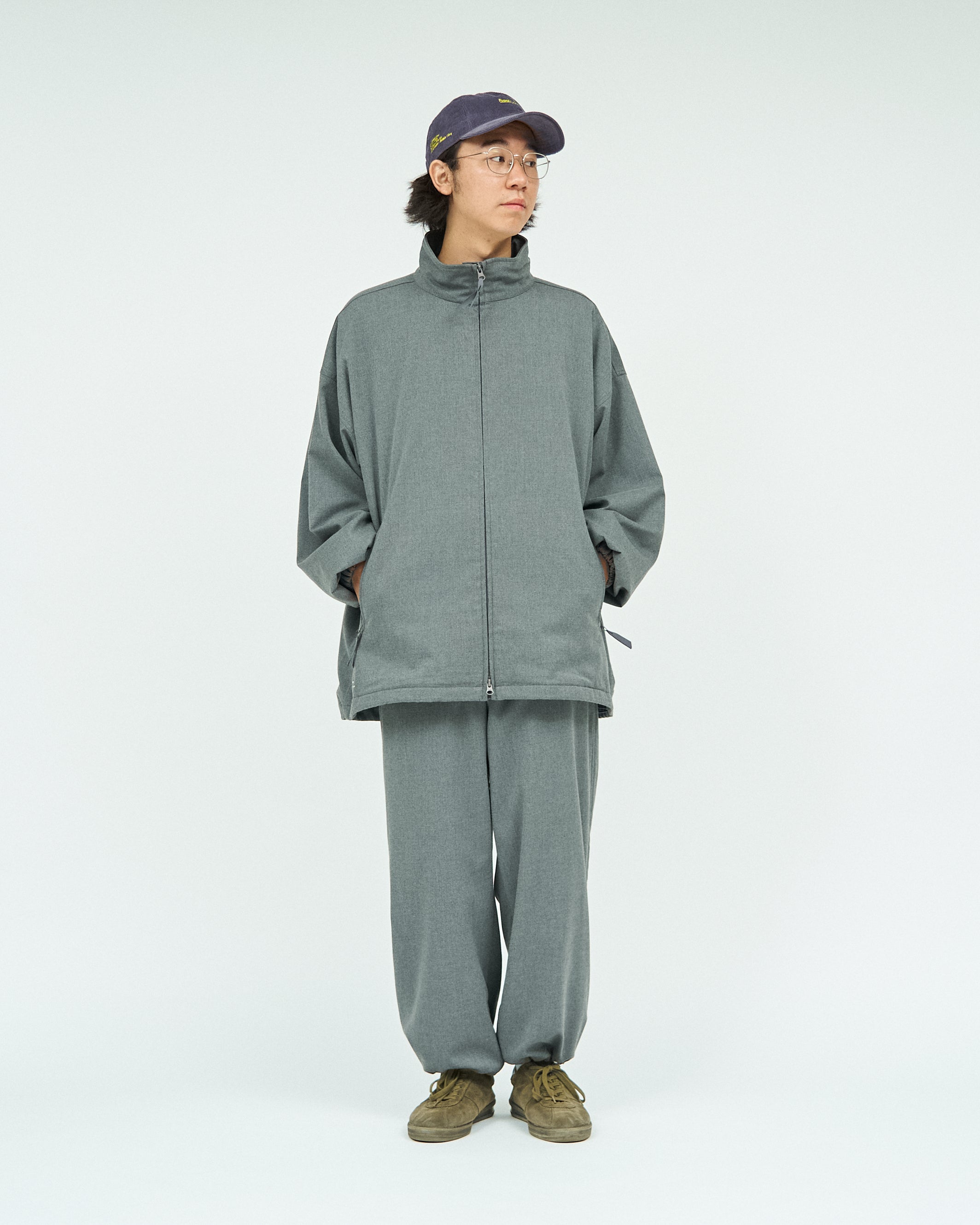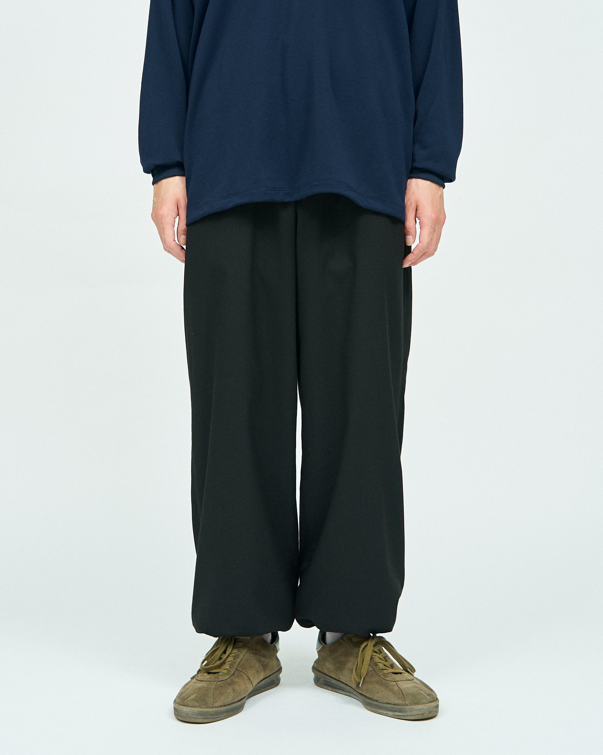 오버팬츠 타입의 트랙 팬츠. 겉감은 울과 같은 기능성 원단으로 만들어져 신축성이 뛰어나고 보풀에 강하고 가정에서 세탁할 수 있습니다. 따뜻하고 유연한 질감이 특징입니다. 안감은 TEIJIN이 개발한 기능성 소재 “Octa”로 제작되었습니다. 땀흡수, 속건성, 경량화, 보온성 등 다양한 기능을 가지고 있어 땀을 빠르게 흡수하고 끈적거리지 않습니다. 허리에서 옷자락까지 볼륨감 있는 실루엣이 특징으로, 옷자락의 드로스트링으로 실루엣을 조정할 수 있다.