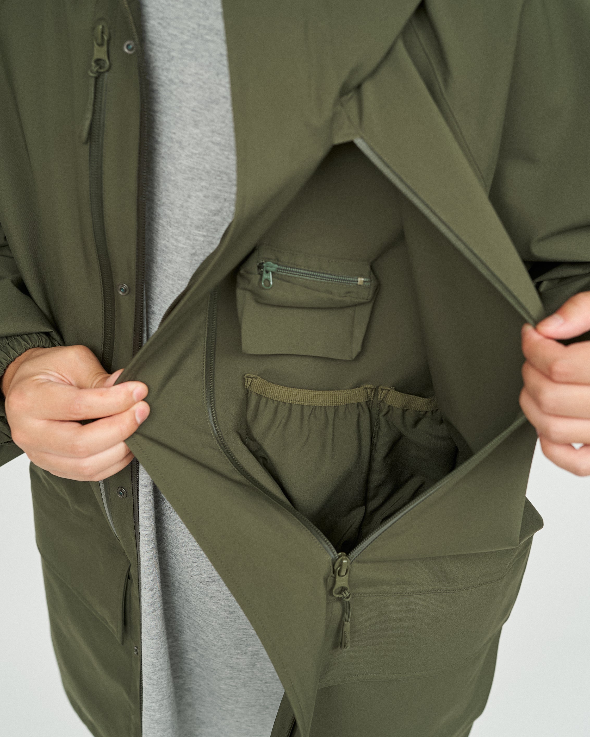 오버사이즈 실루엣의 후드 디자인으로 편안한 착용감을 제공하며, 전면에는 세로형 프론트 지퍼 가 달린 내부 포켓 시스템이 적용되어 있습니다.