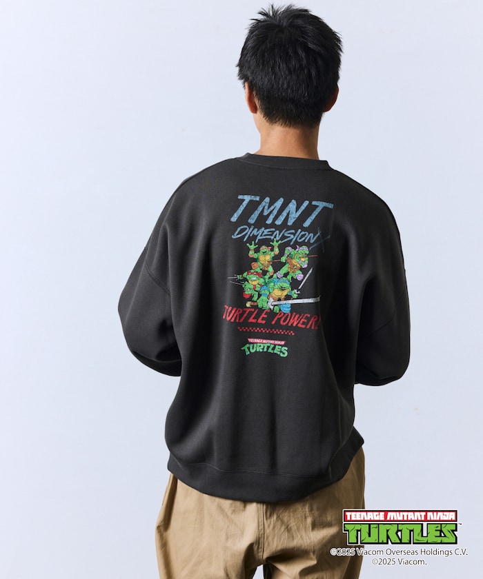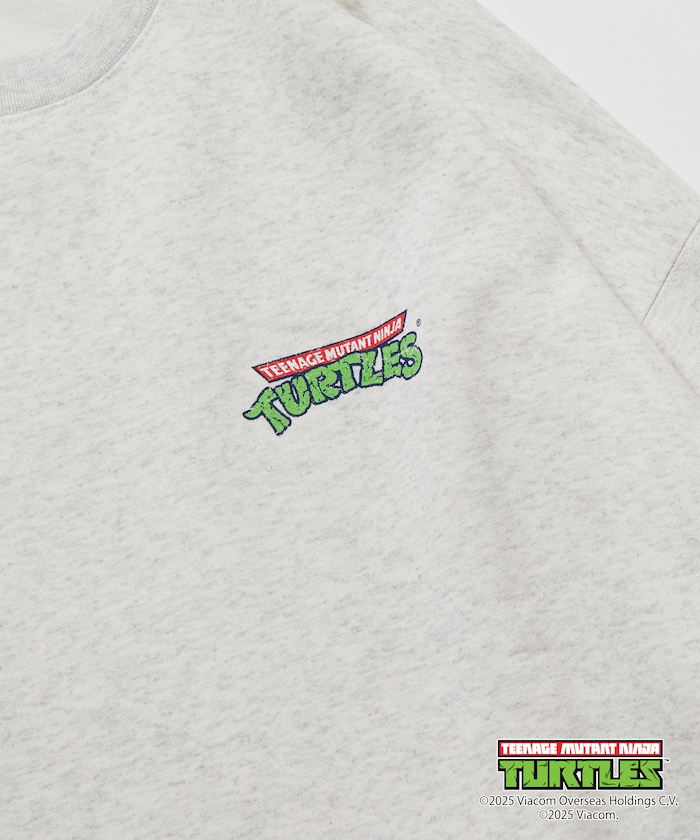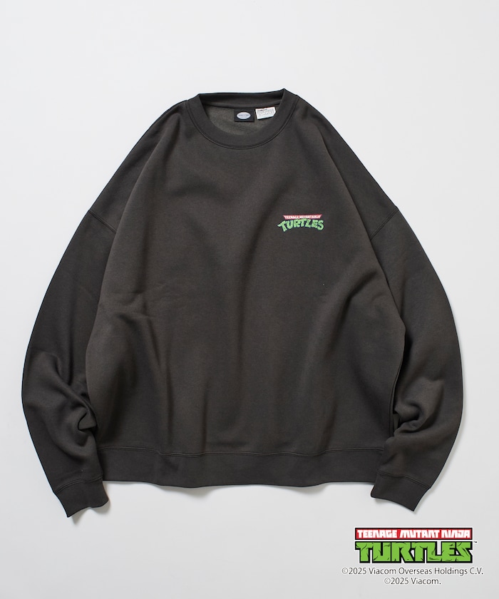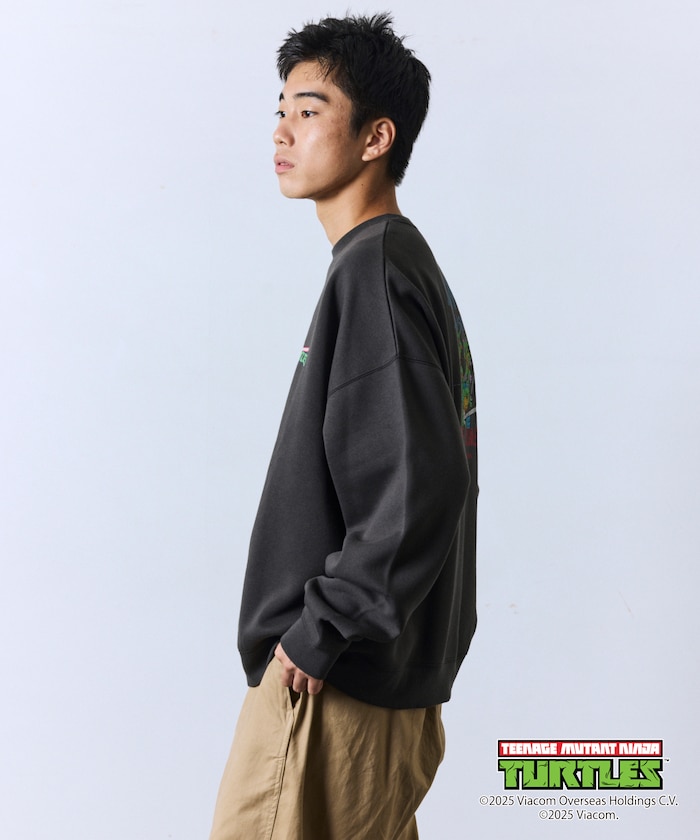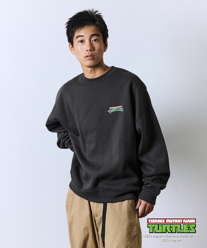 뒷면에 닌자거북이의 오리지널 그래픽 프린트, 앞면에 심플한 원포인트 디자인의 스웨트 티. 적당한 빅 실루엣입니다.