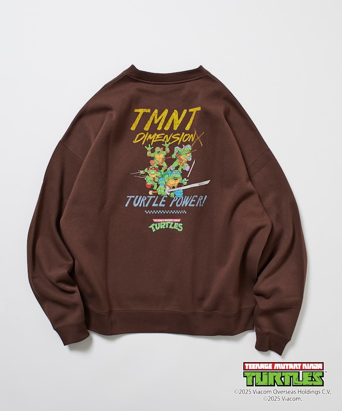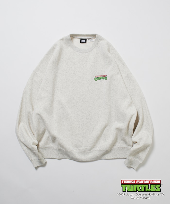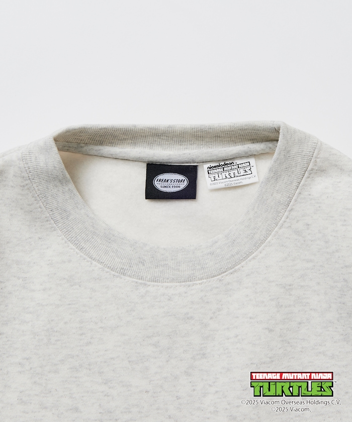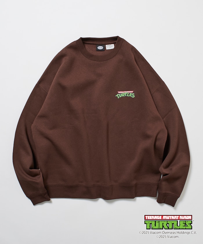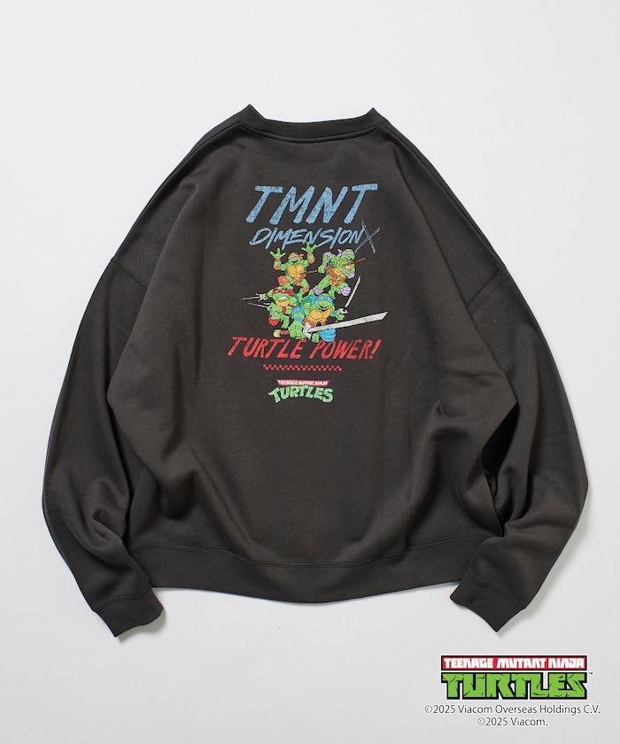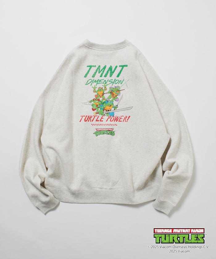 뒷면에 닌자거북이의 오리지널 그래픽 프린트, 앞면에 심플한 원포인트 디자인의 스웨트 티. 적당한 빅 실루엣입니다.