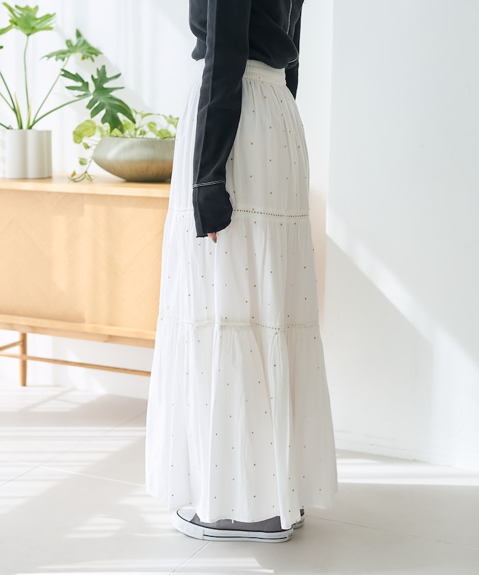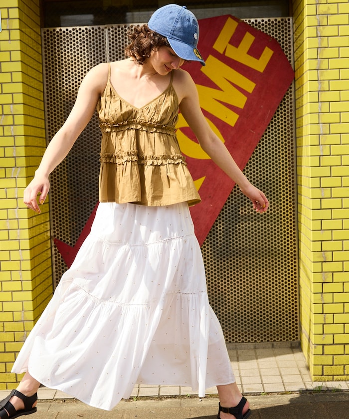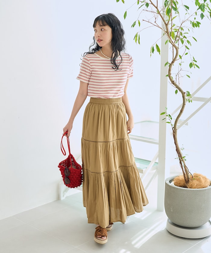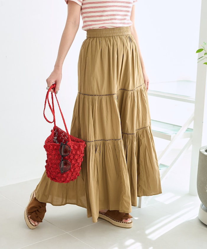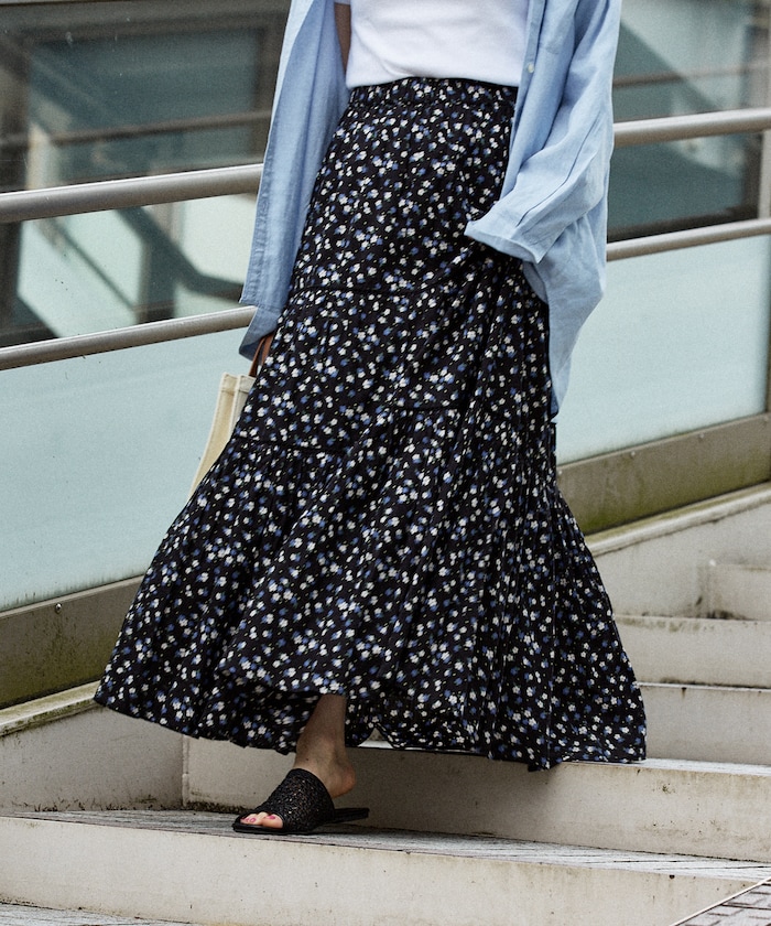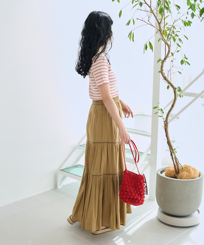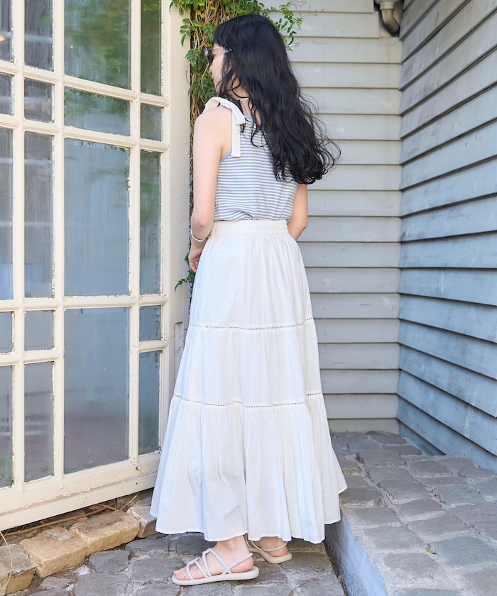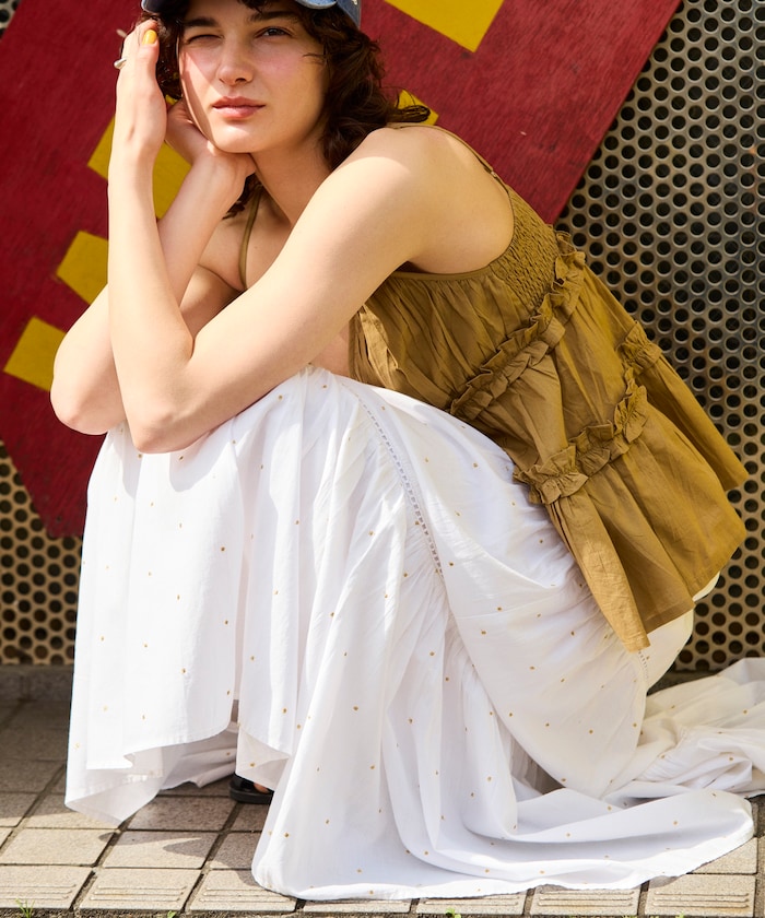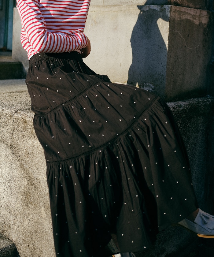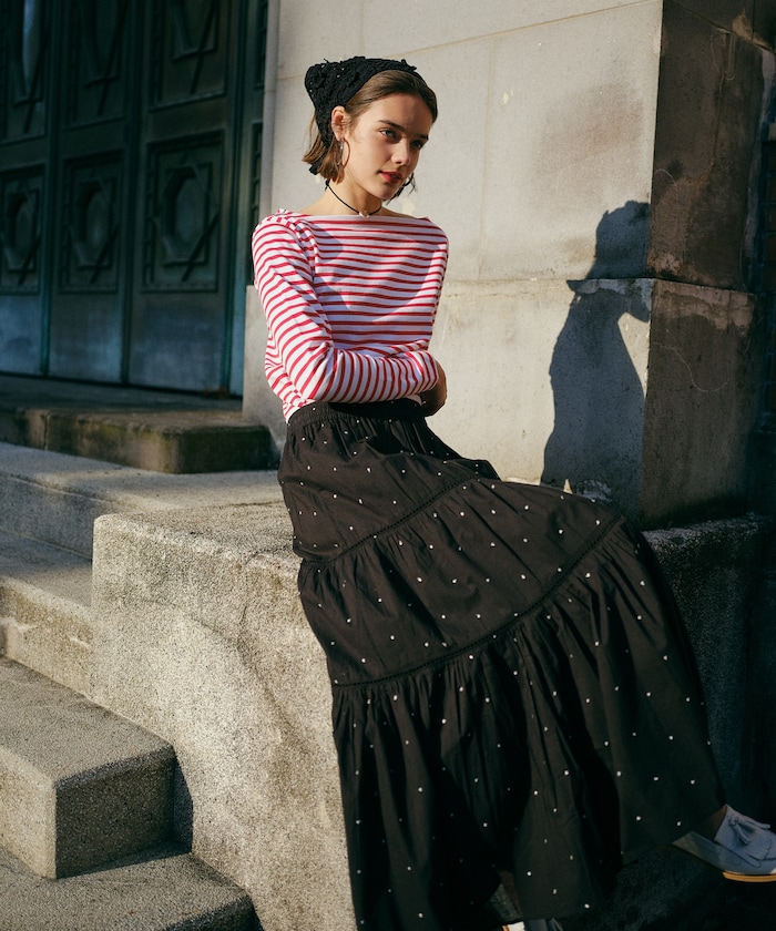 - 허리 부분은 절개선을 낮춘 티어드 디자인으로, 하체는 자연스럽게 퍼지는 실루엣
