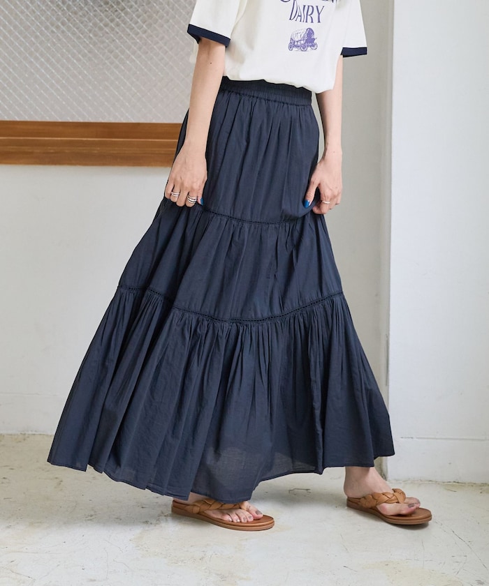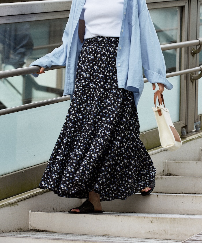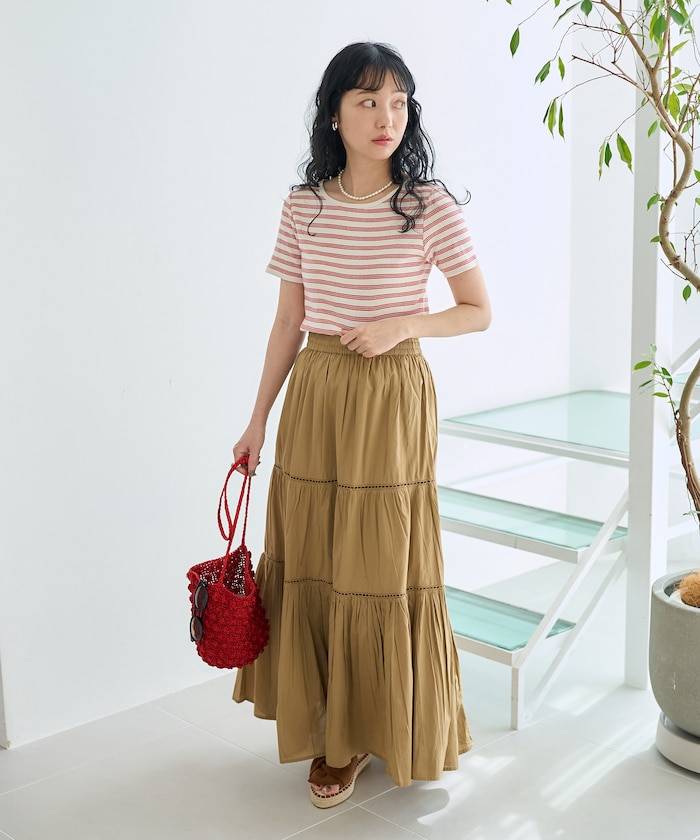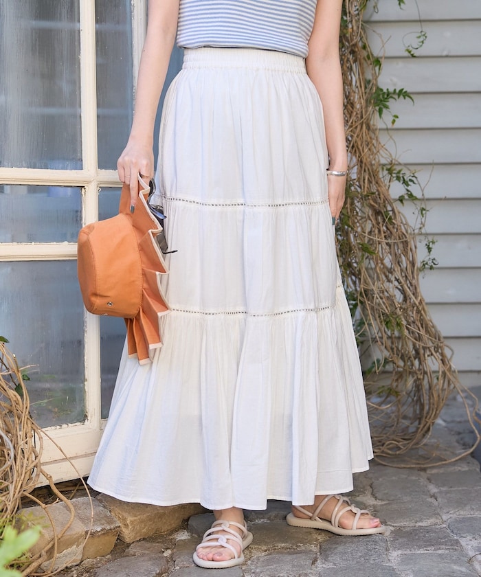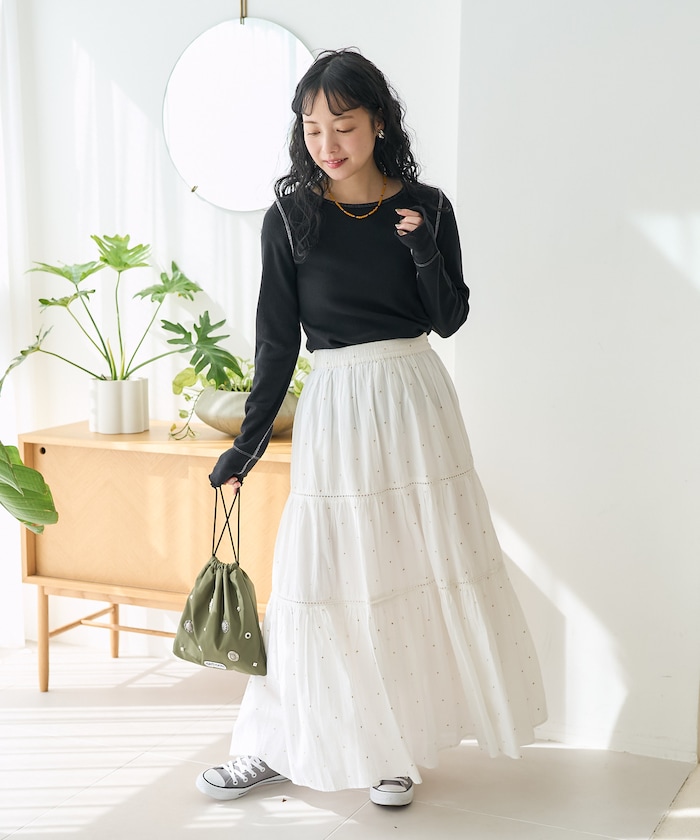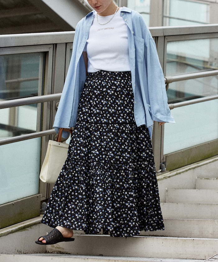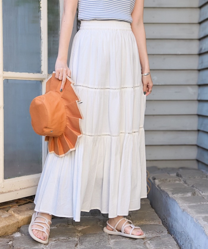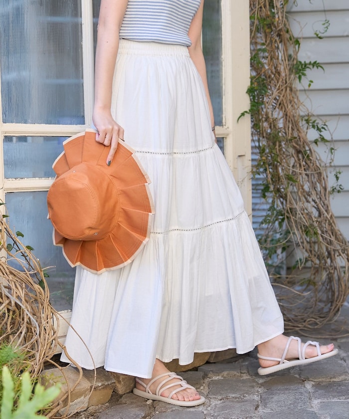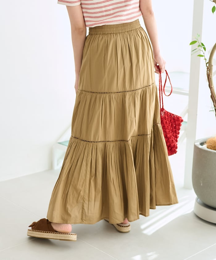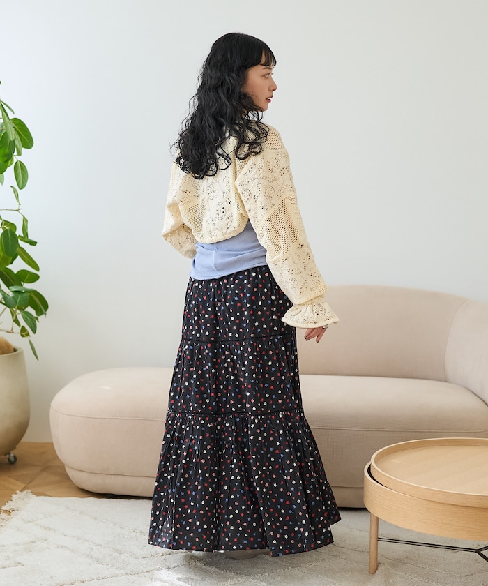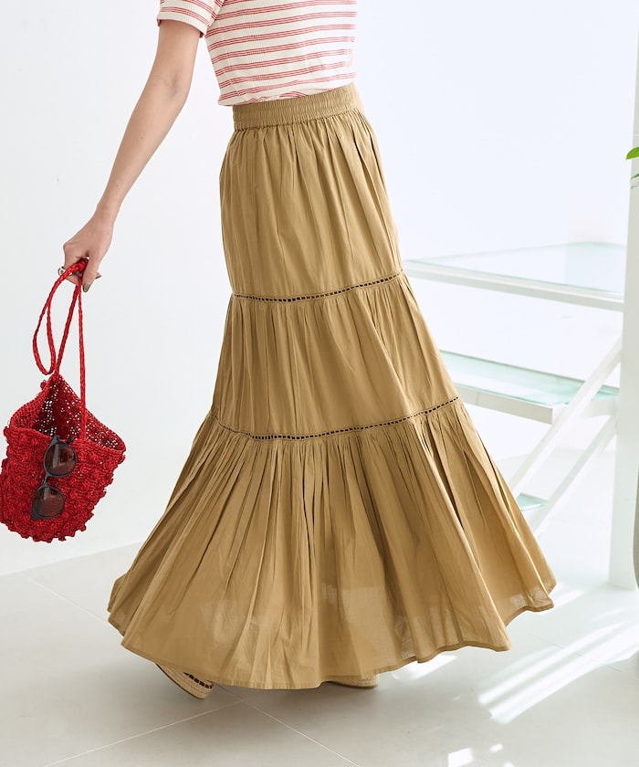 - 허리 부분은 절개선을 낮춘 티어드 디자인으로, 하체는 자연스럽게 퍼지는 실루엣