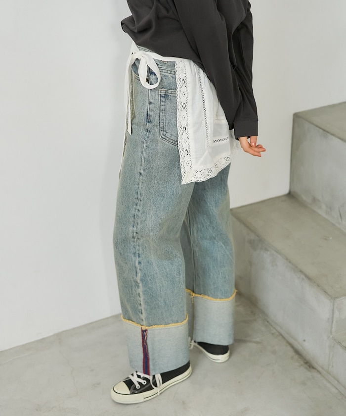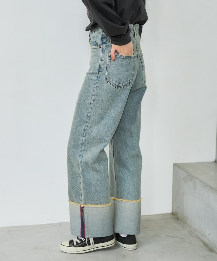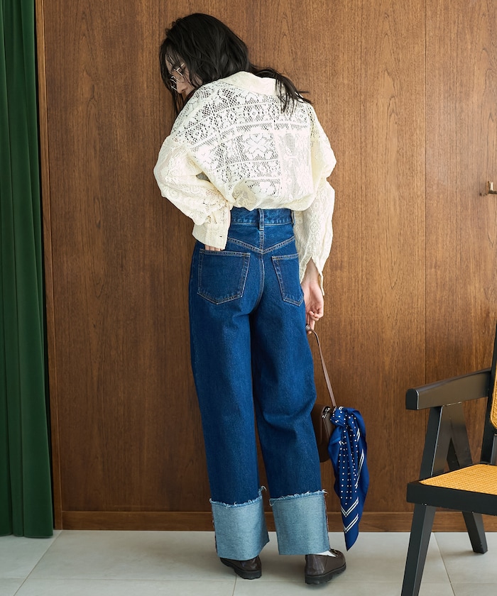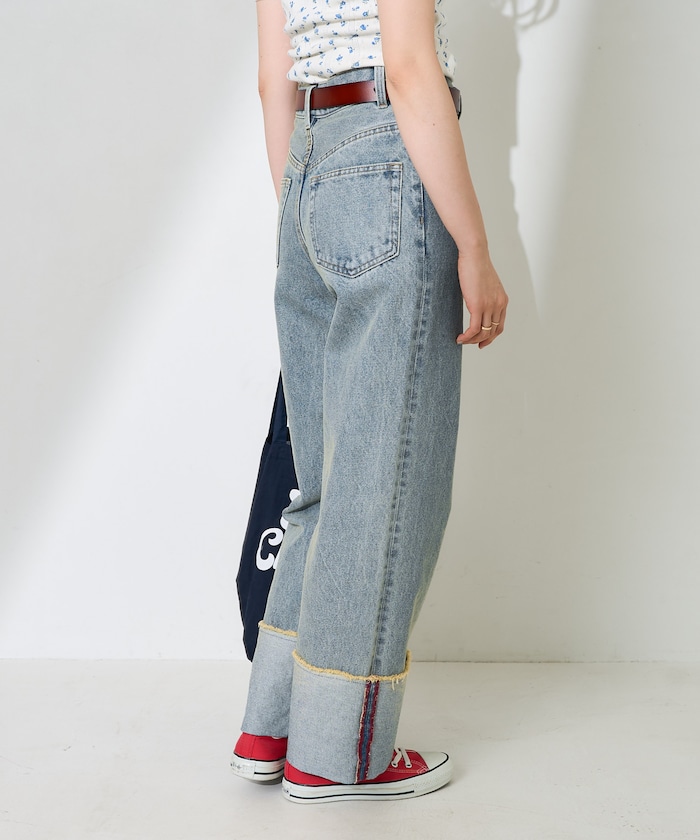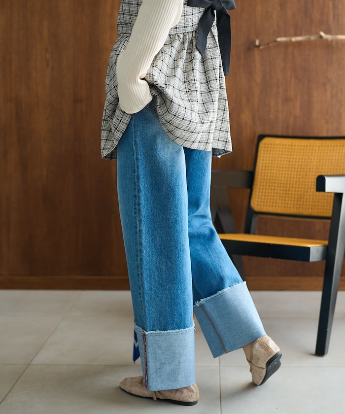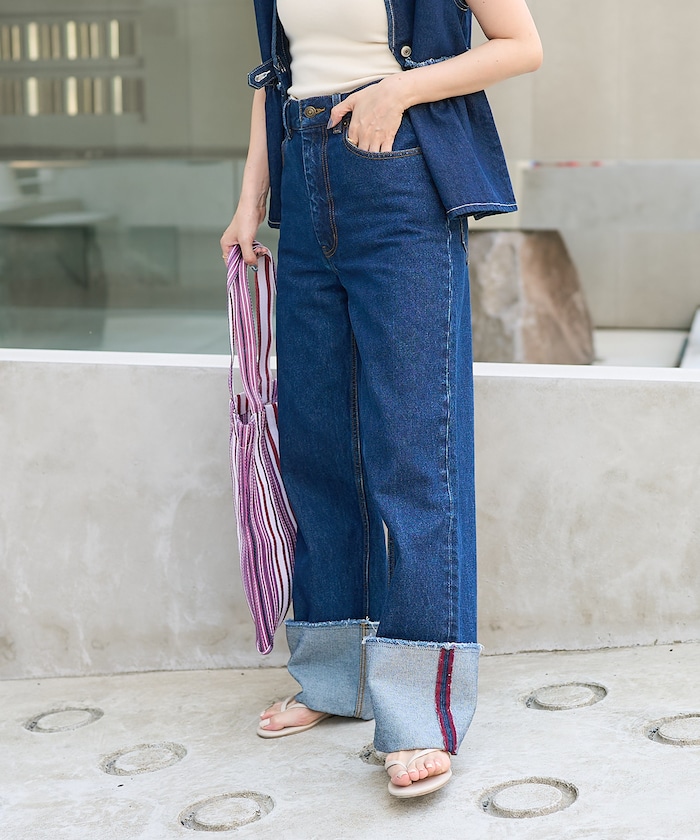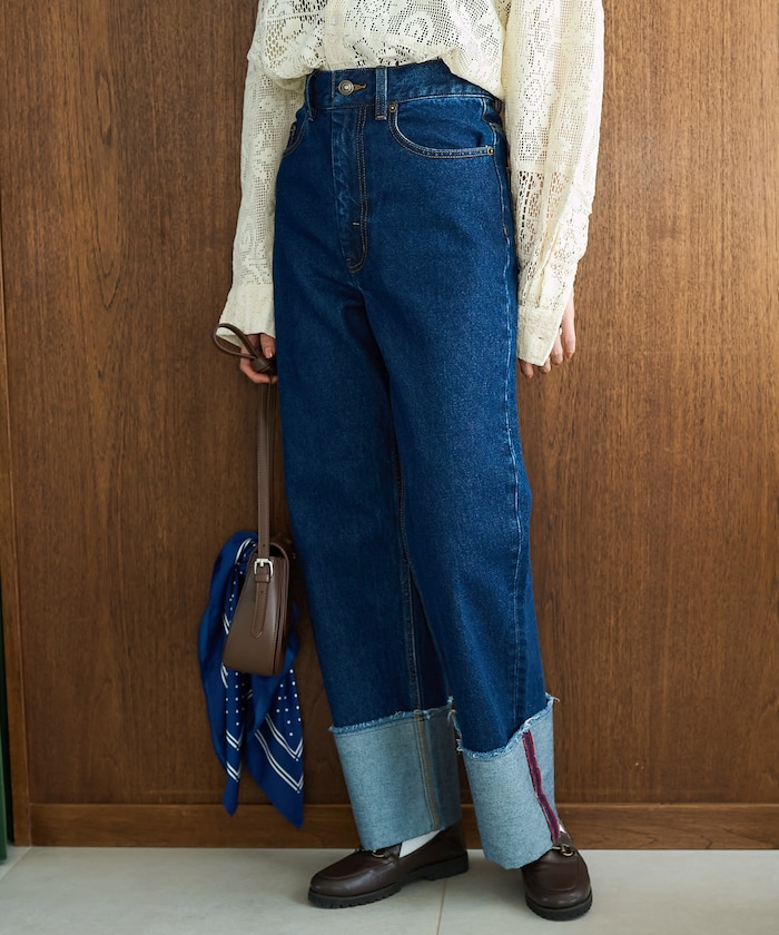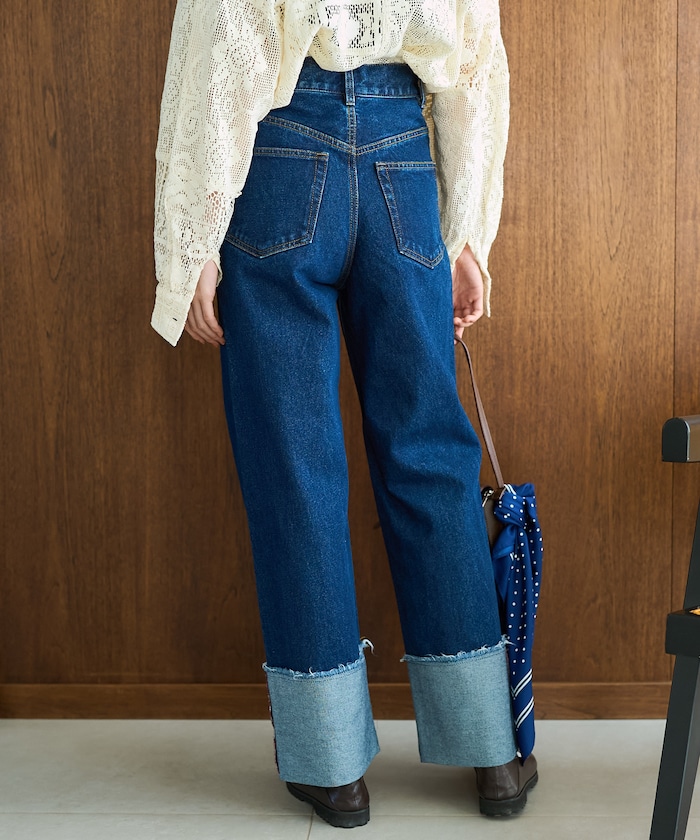 - 넓은 롤업 디테일 이 스타일링에 포인트를 더해주는 데님 팬츠
