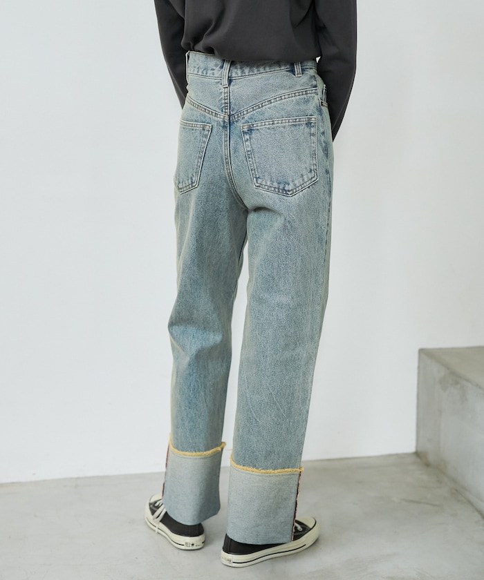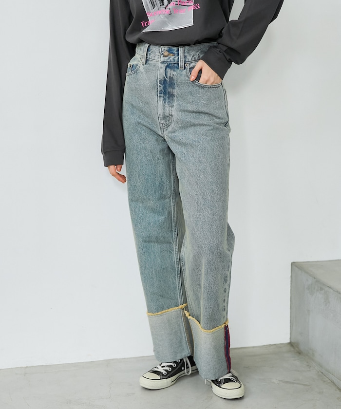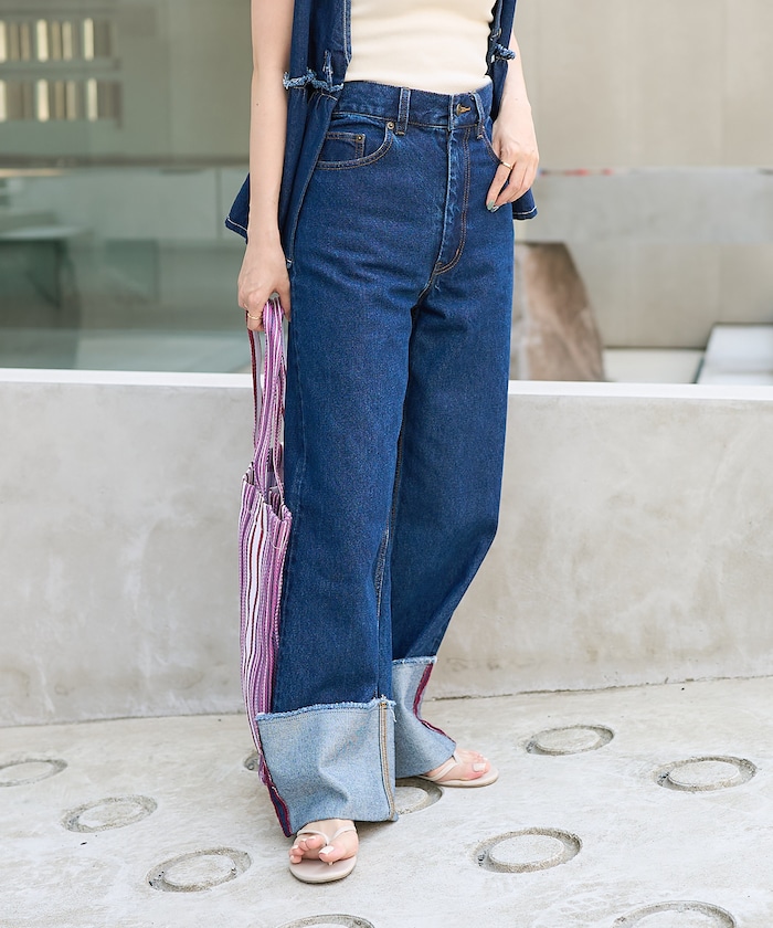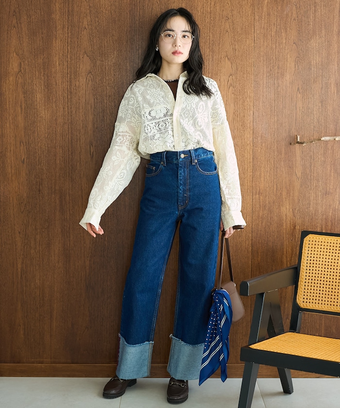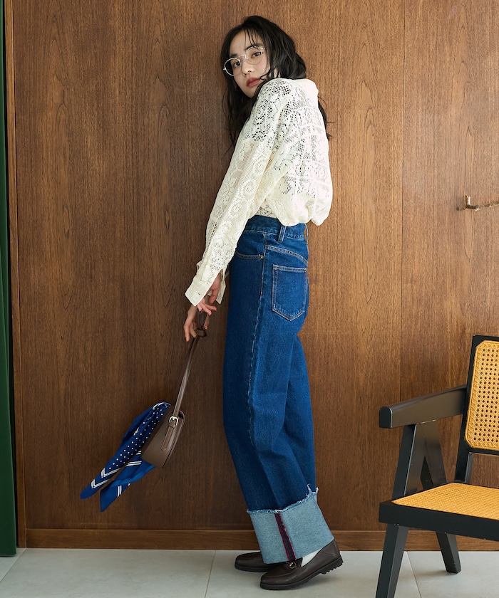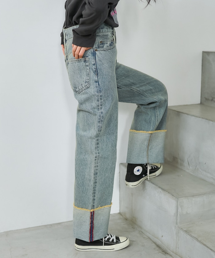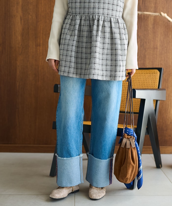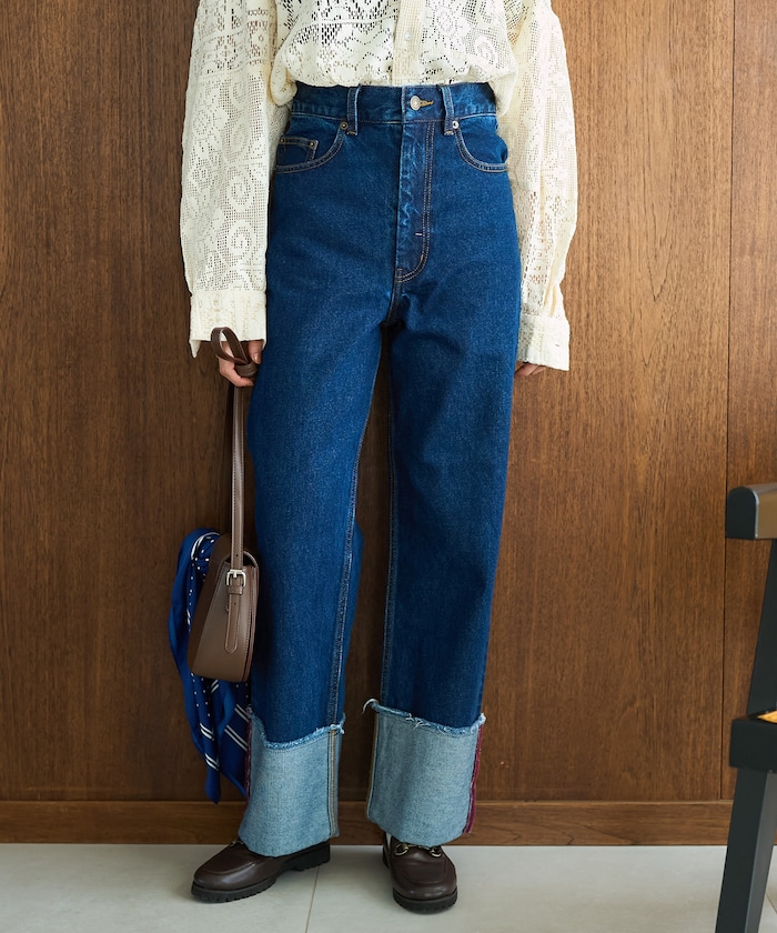 - 넓은 롤업 디테일 이 스타일링에 포인트를 더해주는 데님 팬츠