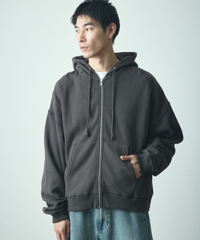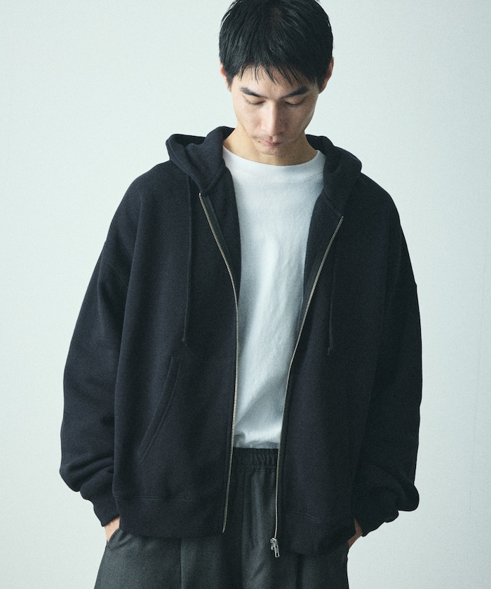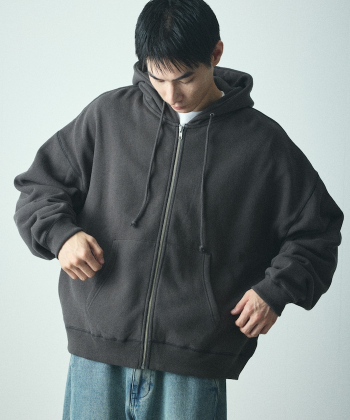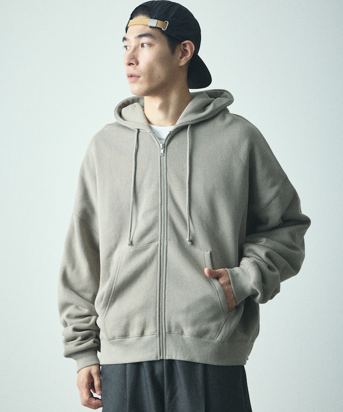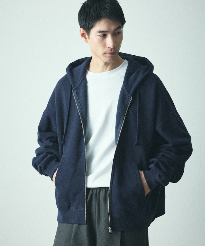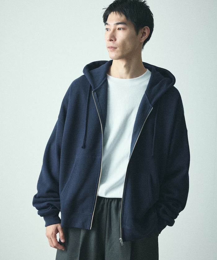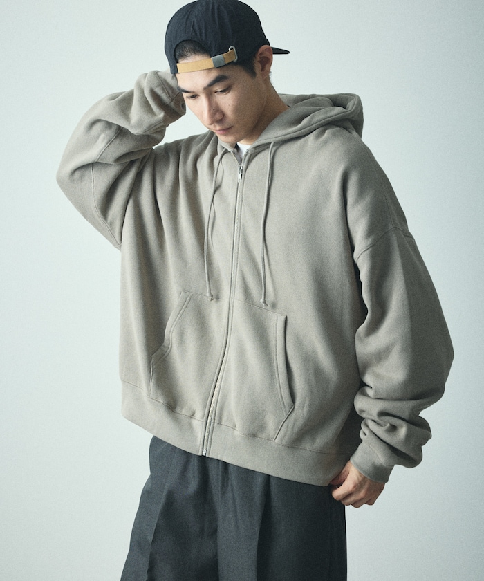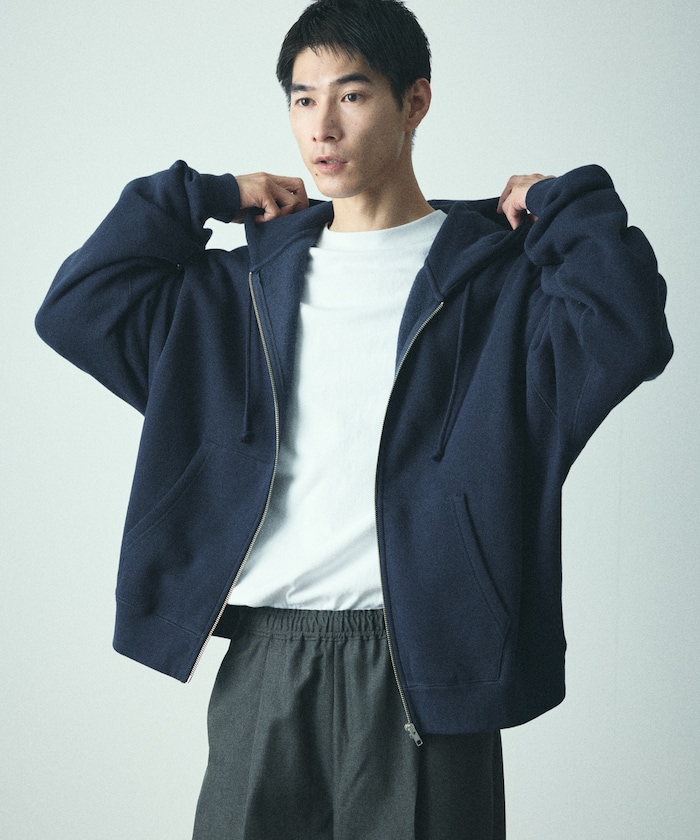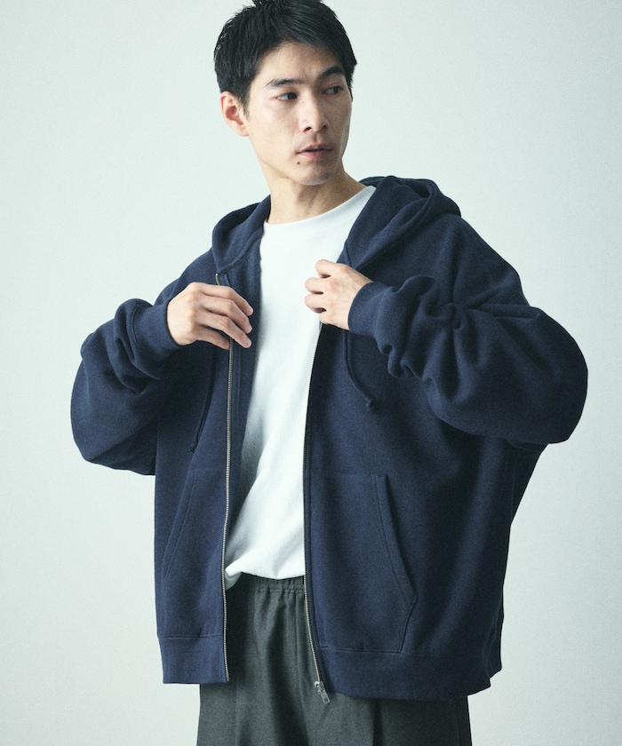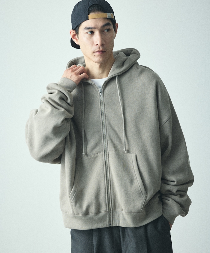 올시즌 사용할 수 있는 심플한 풀지퍼 파커. 부드러운 기모 소재이며 적당한 빅 실루엣입니다.