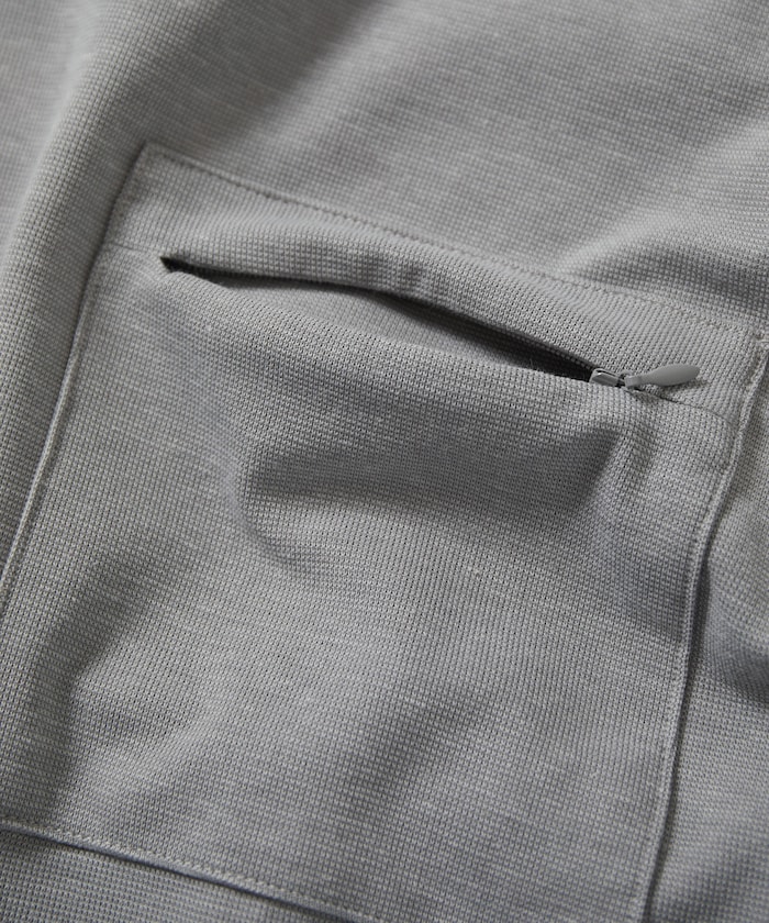 지퍼가 달린 가슴 포켓이 있으며 밑단에 스피널이 있어 실루엣을 조절할 수 있습니다.