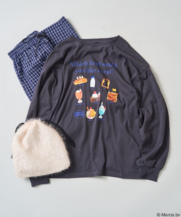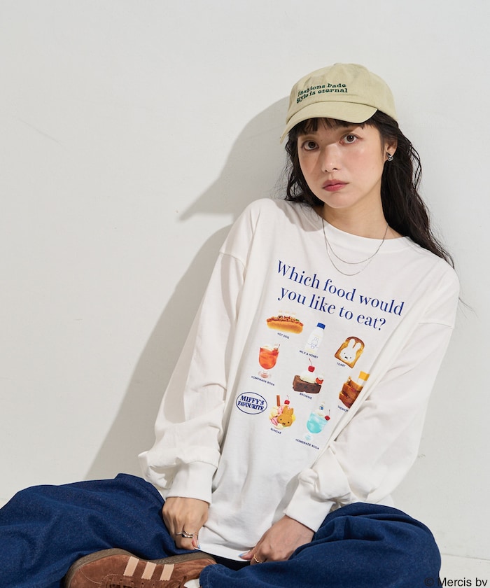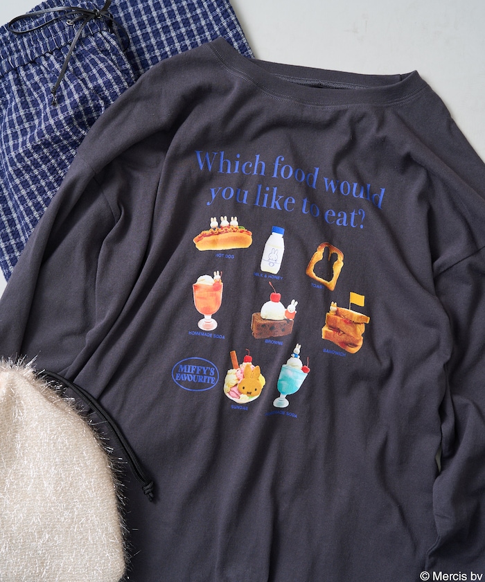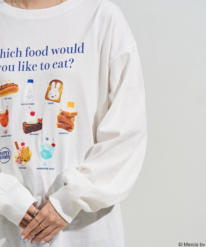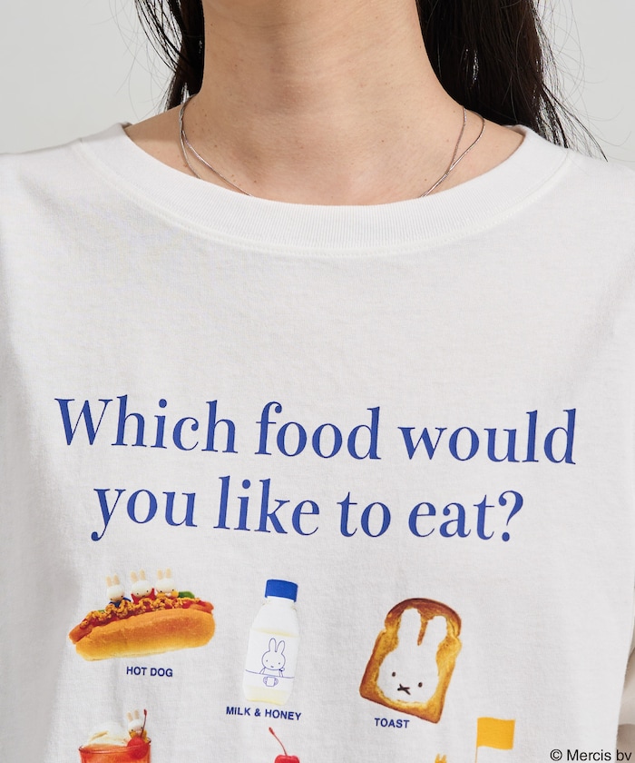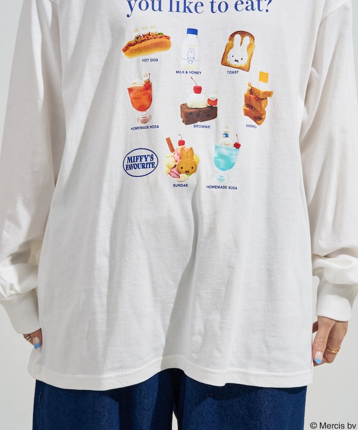 귀여운 미피와 토스트, 파르페, 케이크 등의 음식 프린팅의 티.