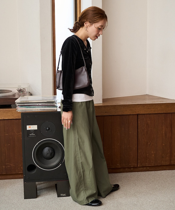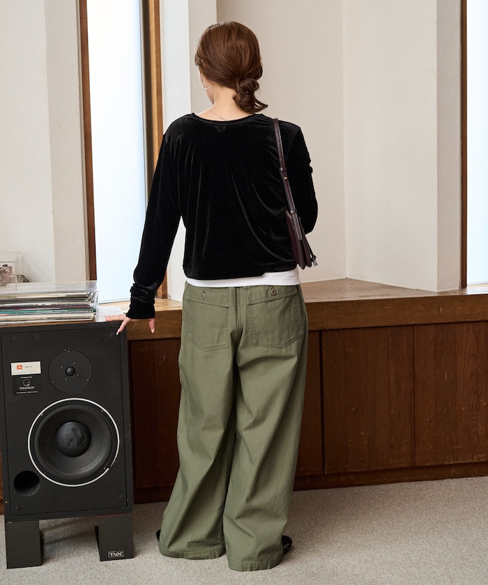 힙과 허벅지는 여유롭고 밑단으로 자연스럽게 떨어지는 와이드 커브 핏입니다.