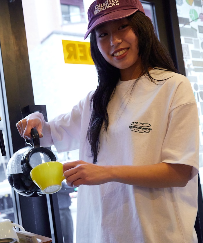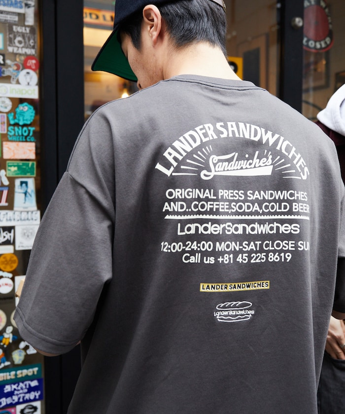 요코하마의 인기 샌드위치 가게 “LANDER”와의 최신 콜라보 모델. 뒷면에는 오리지널 그래픽 프린트, 앞면에는 원포인트 디자인이 있습니다.