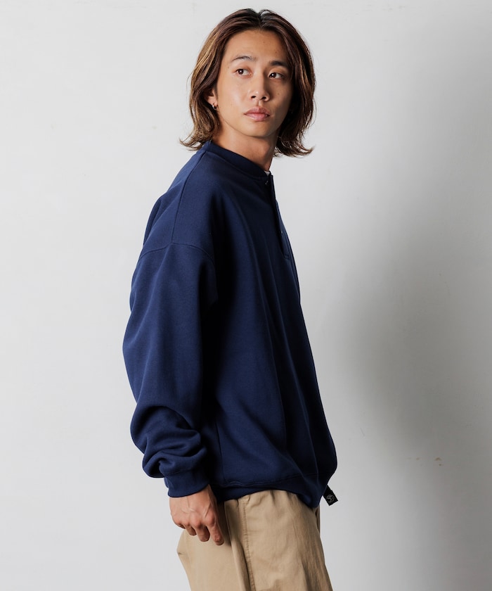 올 시즌 트렌드를 느낄 수 있는 헨리넥 디자인의 스웨트 풀오버입니다.
