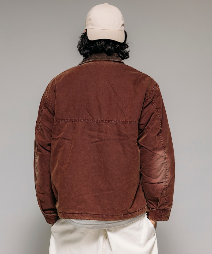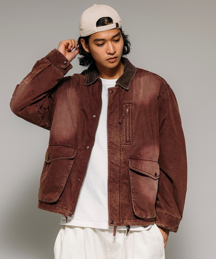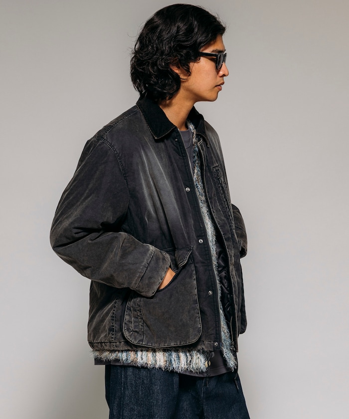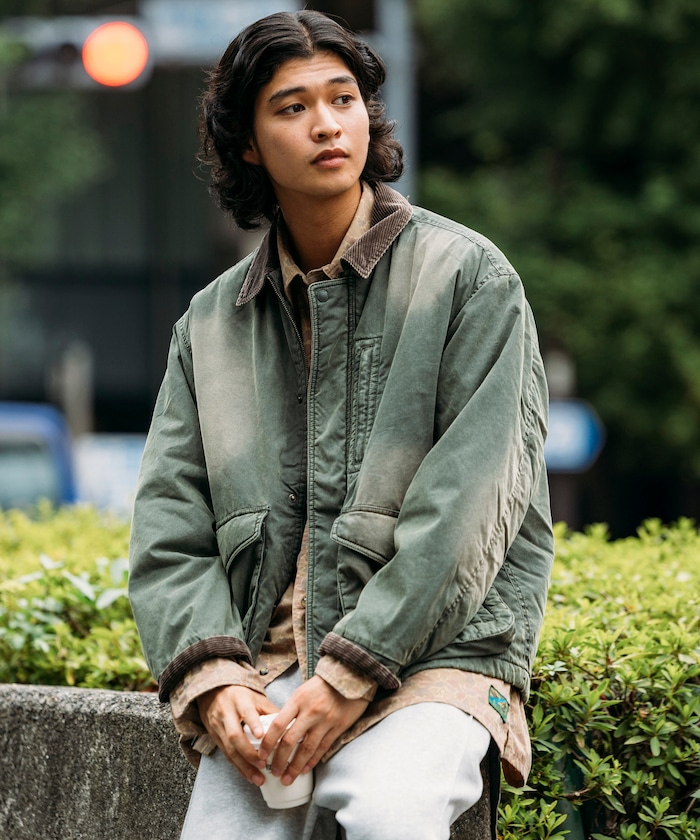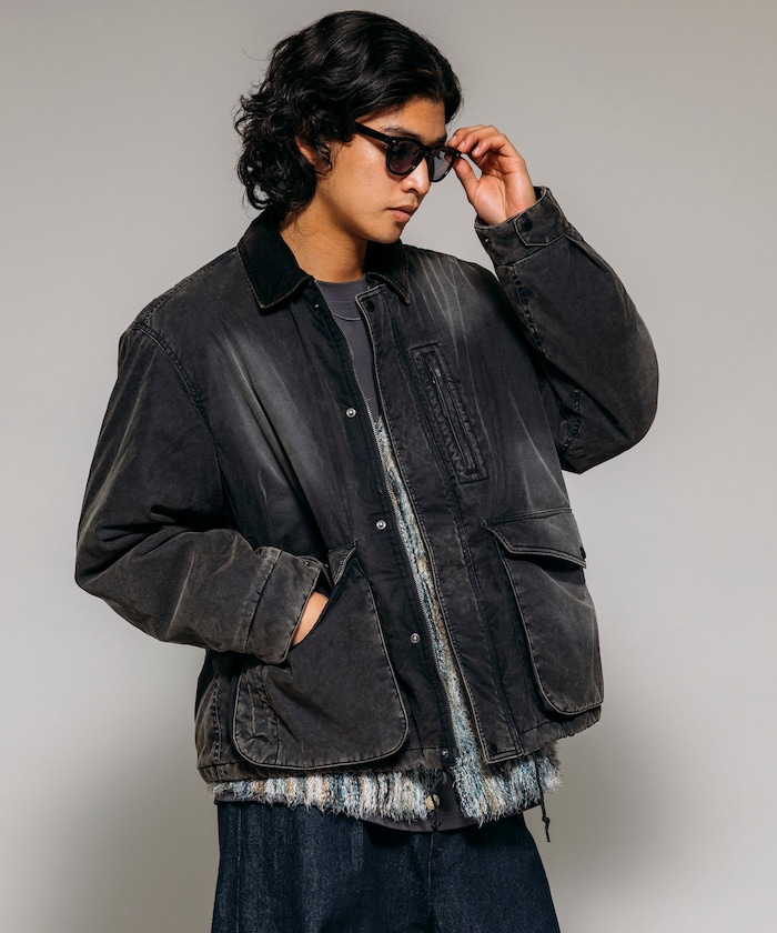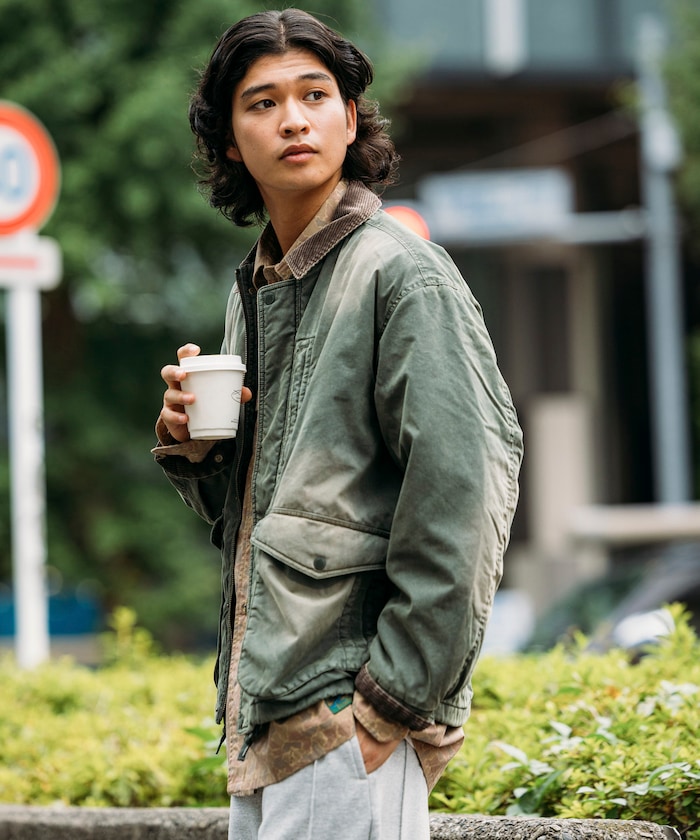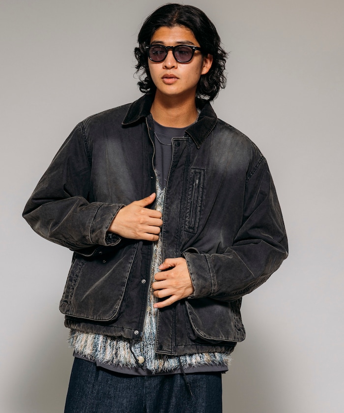 카라 부분을 코듀로이 원단으로 배색한 코튼 나일론 혼방의 블루종. 자연스러운 워싱 가공으로 빈티지한 멋을 살린 디자인입니다. 피싱 재킷에서 착안한 디테일로, 양쪽 사이드에는 여유 있는 플랩포켓과 슬래시 포켓을, 가슴에는 지퍼 포켓이 있습니다. 어깨선이 내려간 드롭숄더와 살짝 짧은 박시 실루엣입니다.
