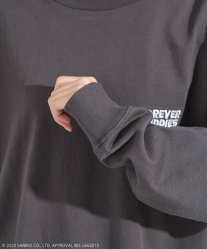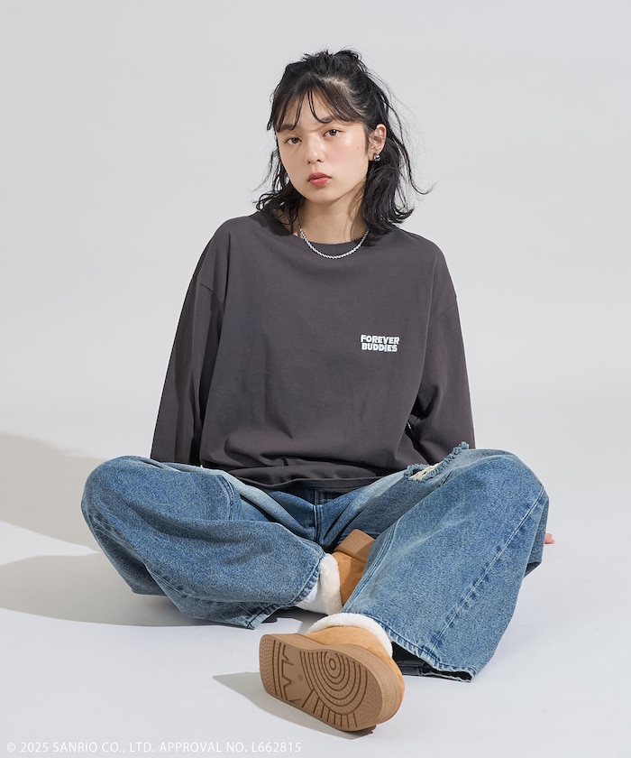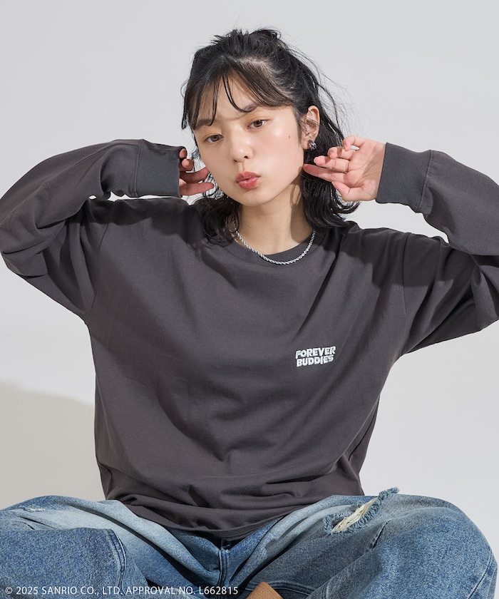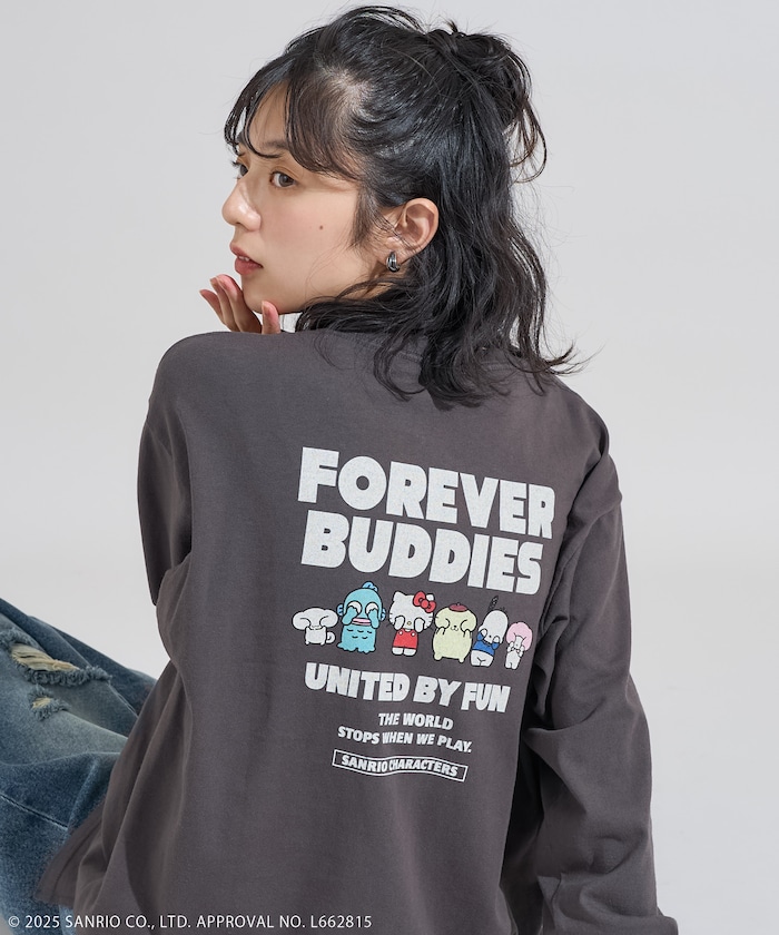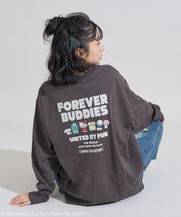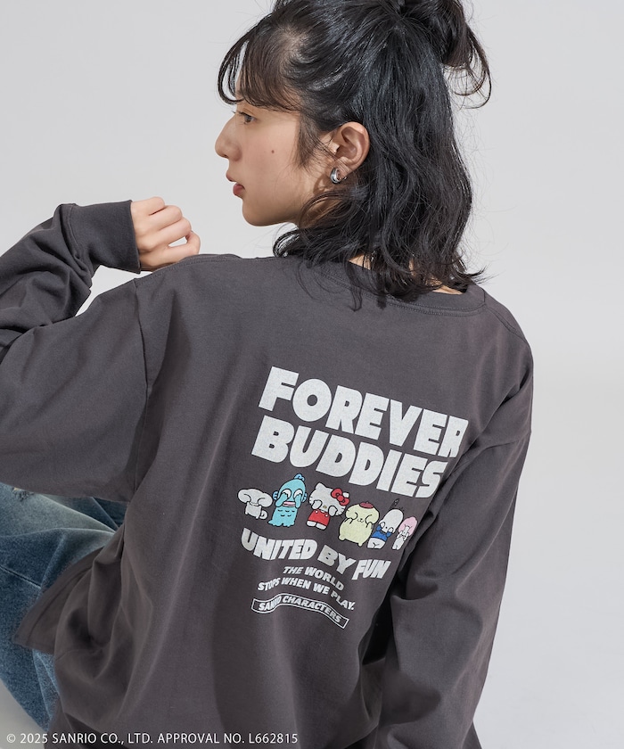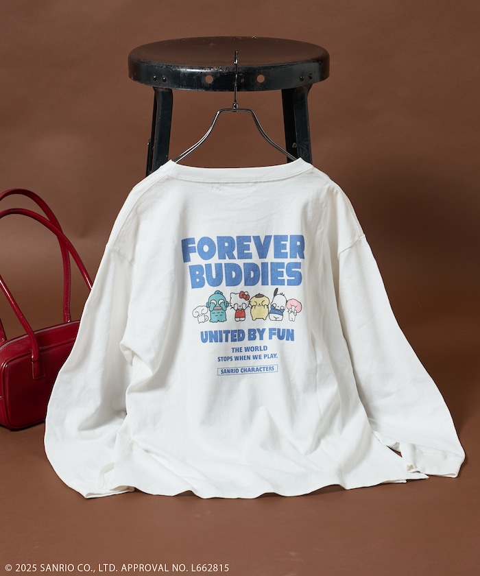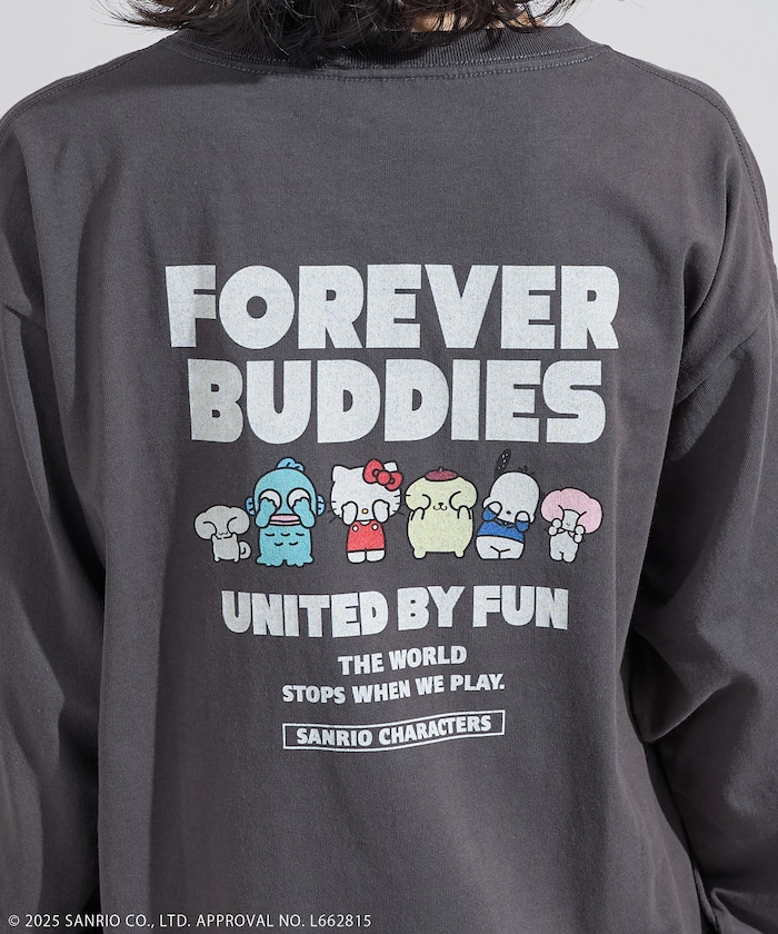 산리오의 인기 캐릭터들이 얼굴을 가린 모습이 담긴 유니크한 프린트 티. 앞면에는 FOREVER BUDDIES 문구가 있습니다. 오버사이즈 실루엣