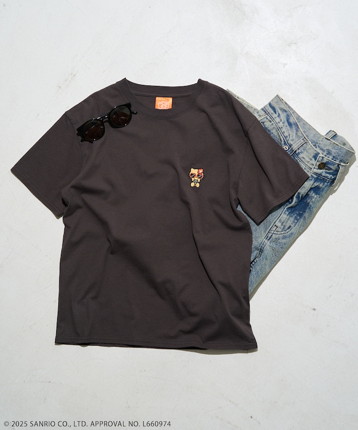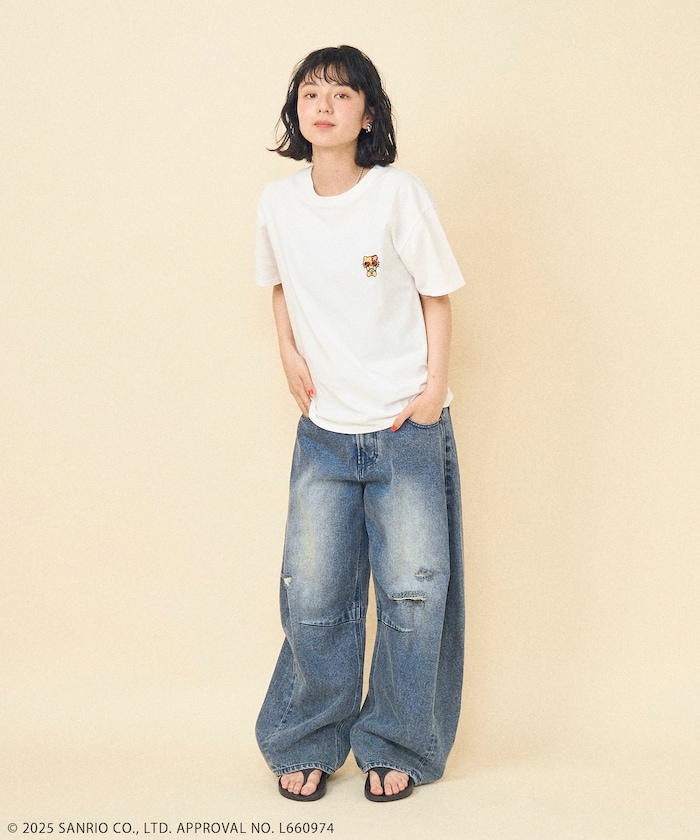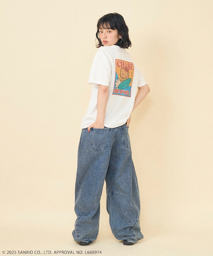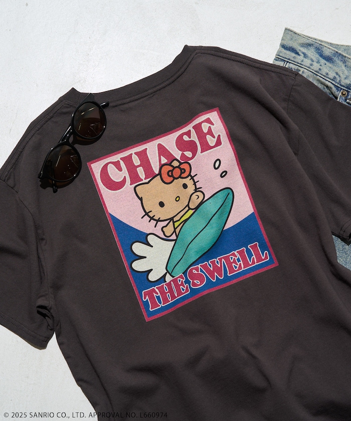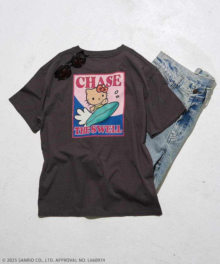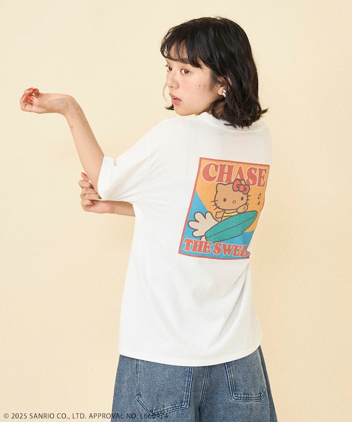 뒷면에는 서핑을 즐기는 헬로키티 일러스트, 앞면에는 선글라스를 쓴 자수 키티가 포인트가 있 는 반팔 티