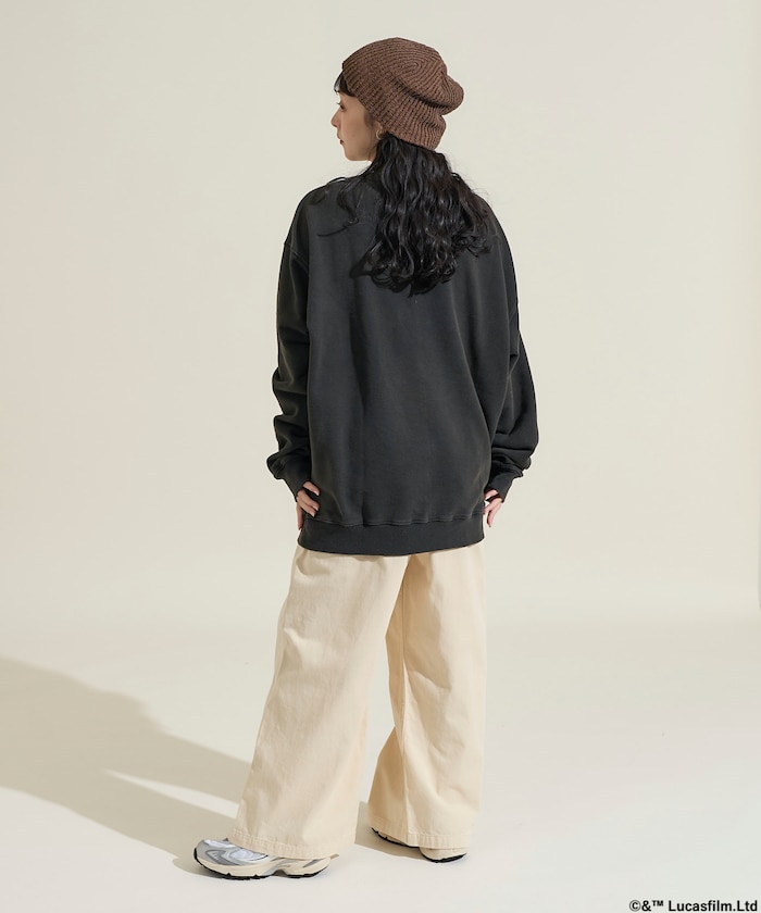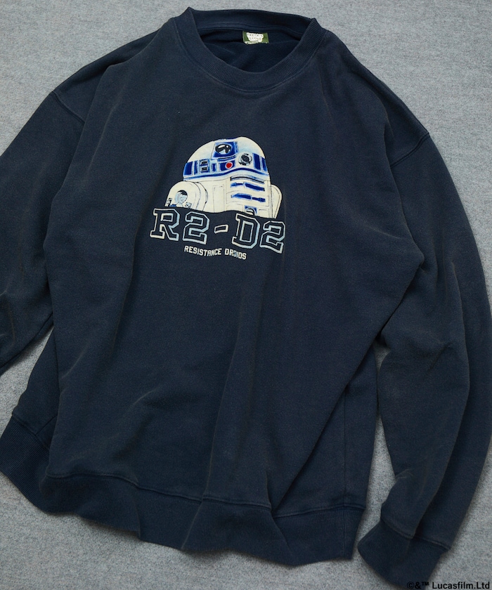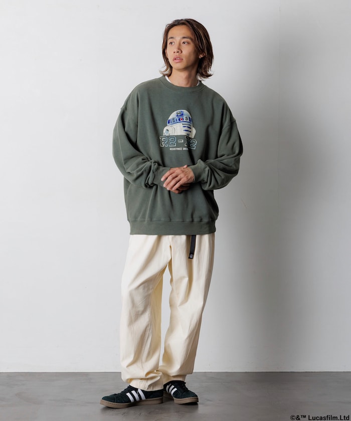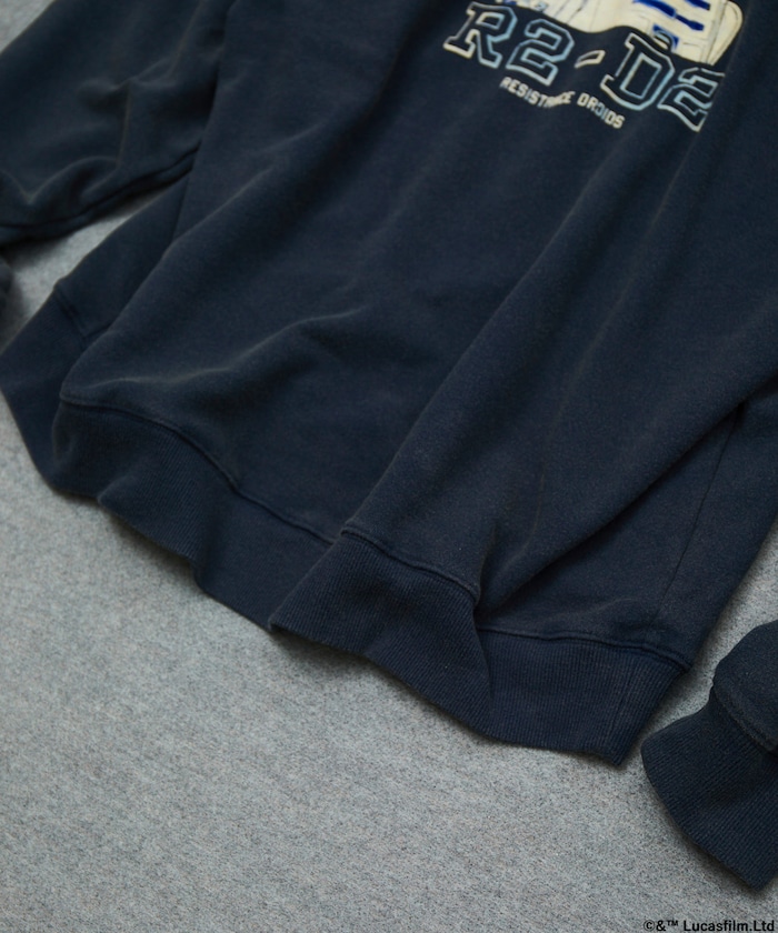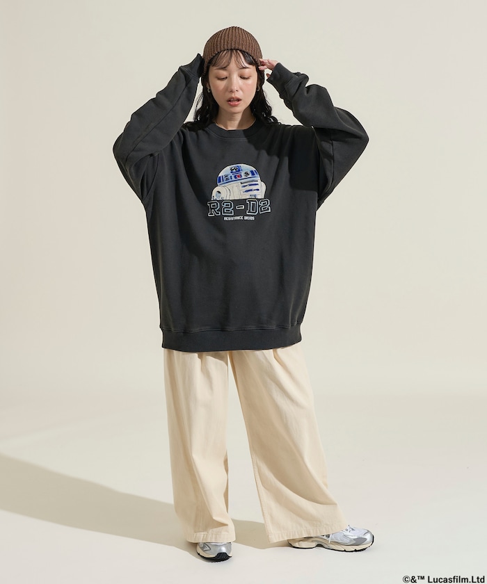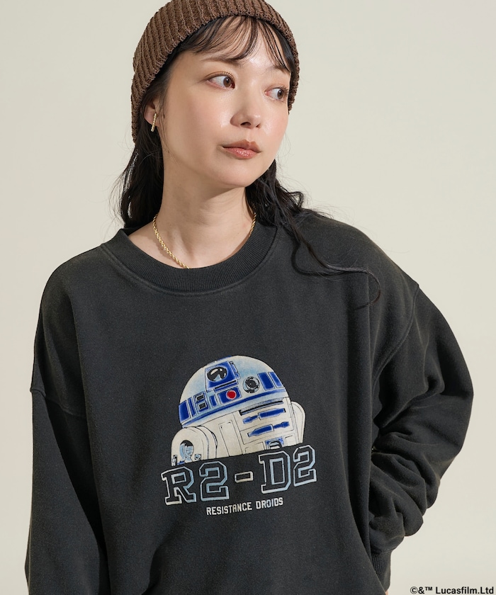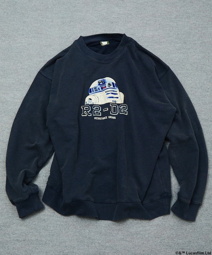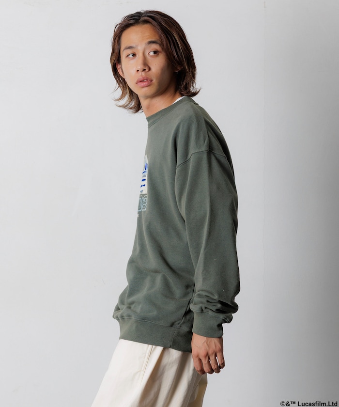 SF 영화의 금자탑, 스타워즈 시리즈의 드로이드 R2-D2 그래픽을 프린트한 스웨트 티. 오래 입은 듯한 가공 처리를 더해 빈티지한 분위기를 연출했습니다. 여유로운 릴렉스 실루엣입니다.