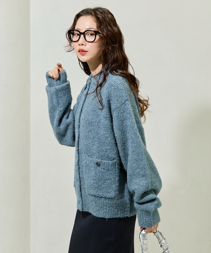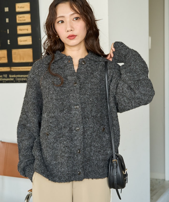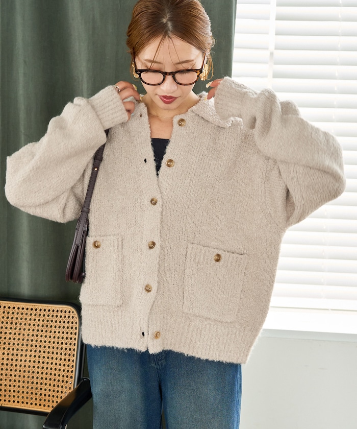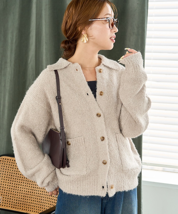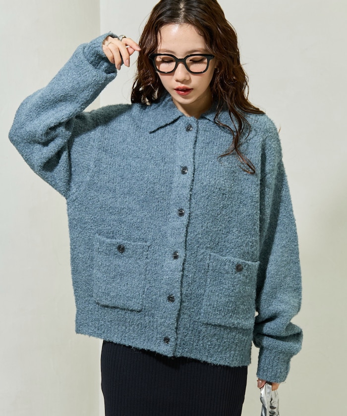 카라 디테일과 더블 포켓 디자인의 니트 가디건. 기모감이 느껴지는 부클레 니트 소재로 따뜻하고 부드러운 착용감입니다. 오버사이즈 실루엣