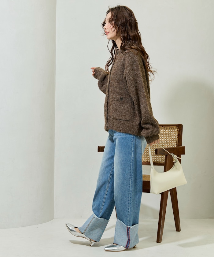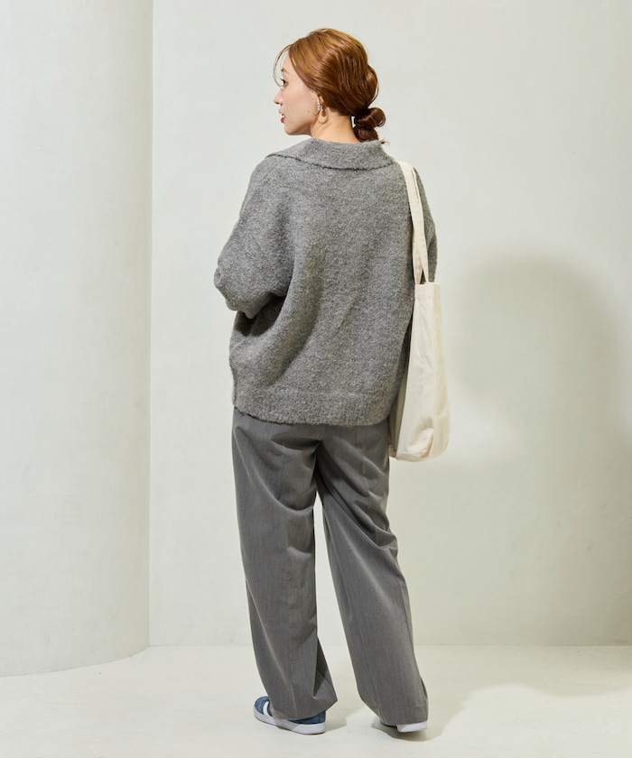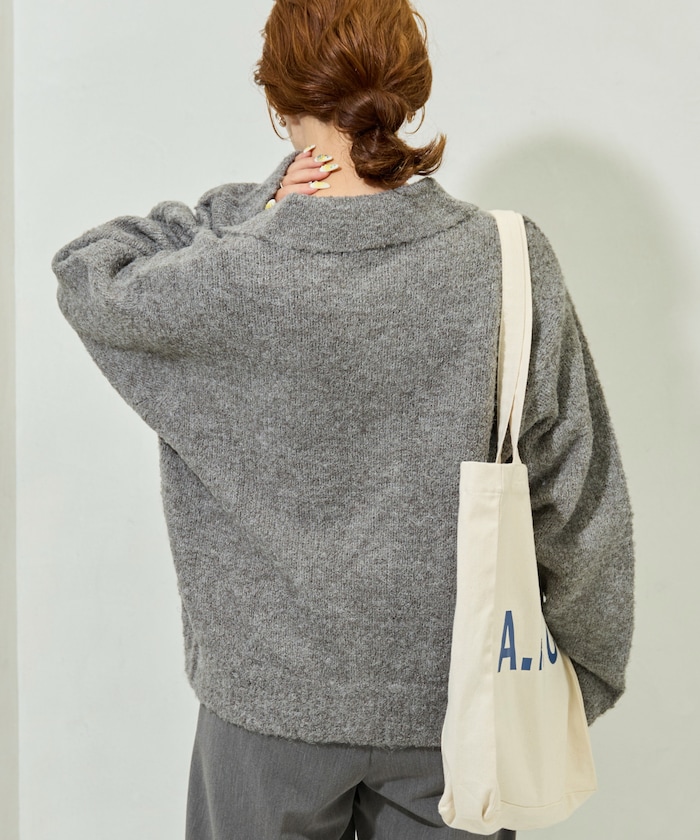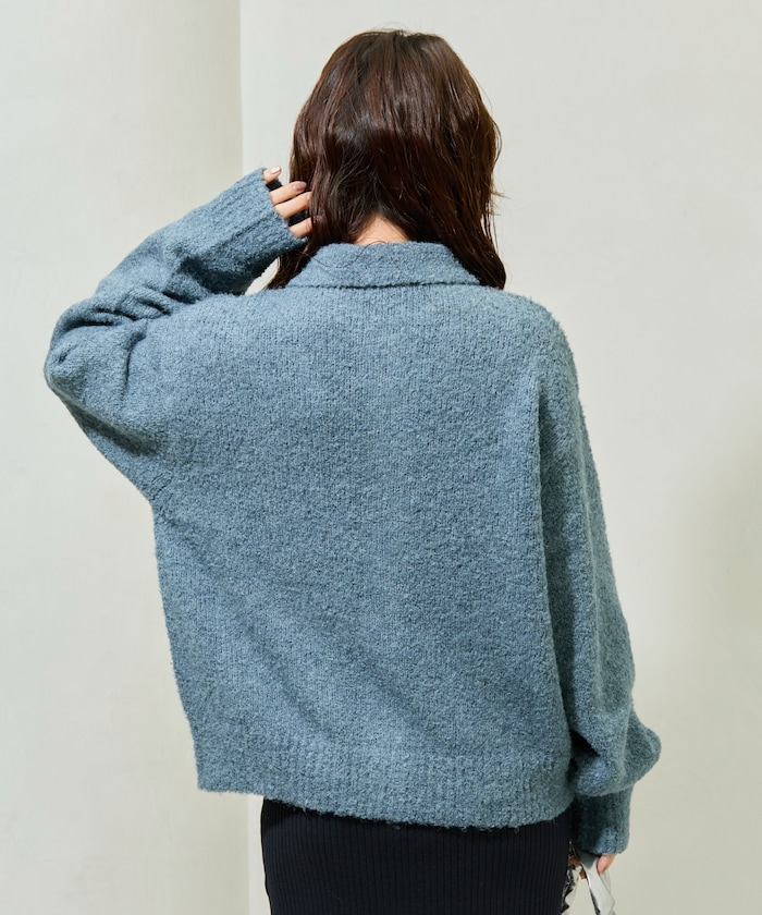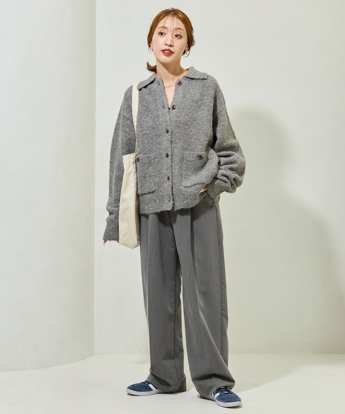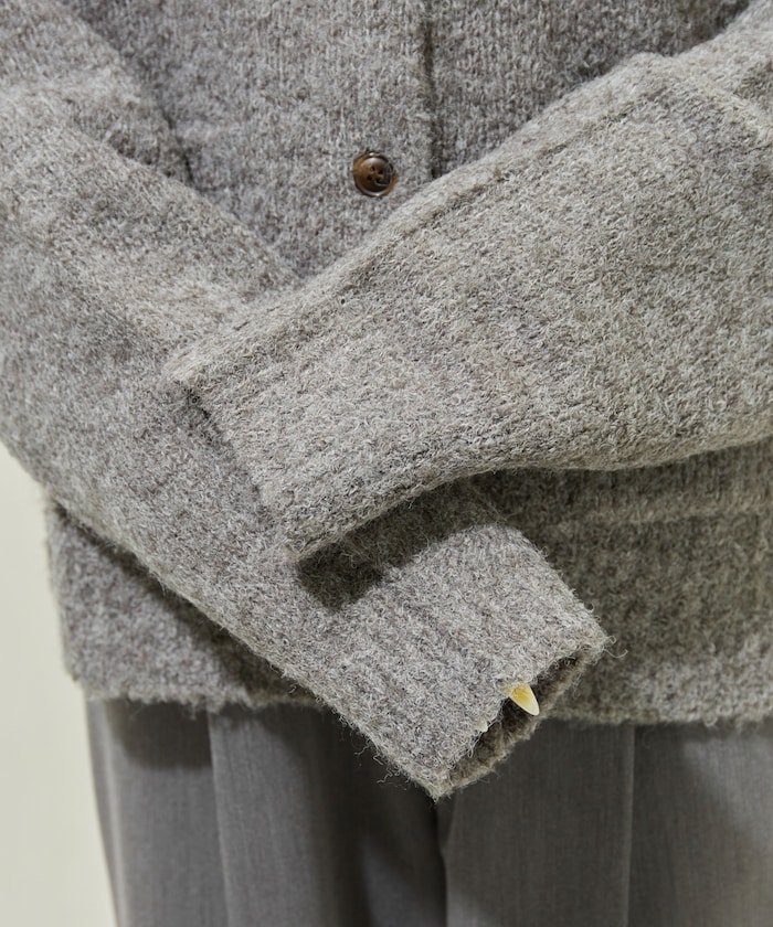 카라 디테일과 더블 포켓 디자인의 니트 가디건. 기모감이 느껴지는 부클레 니트 소재로 따뜻하고 부드러운 착용감입니다. 오버사이즈 실루엣