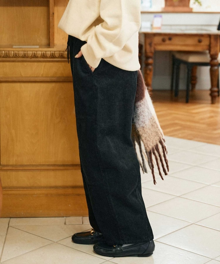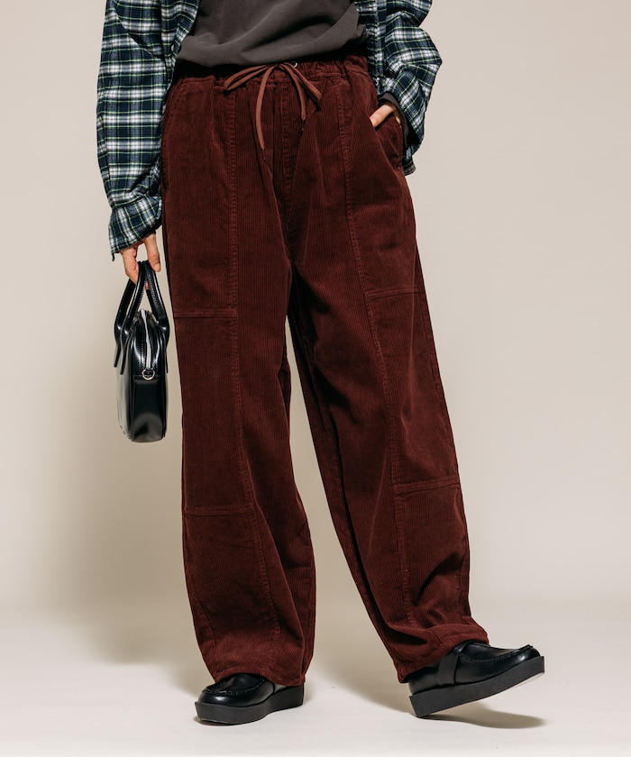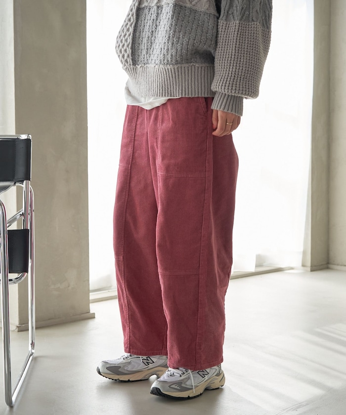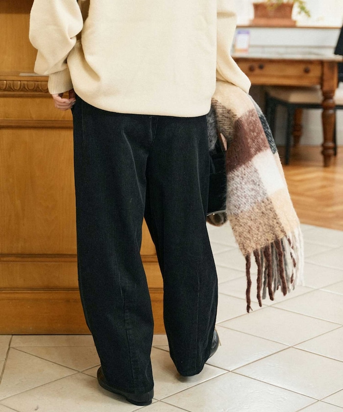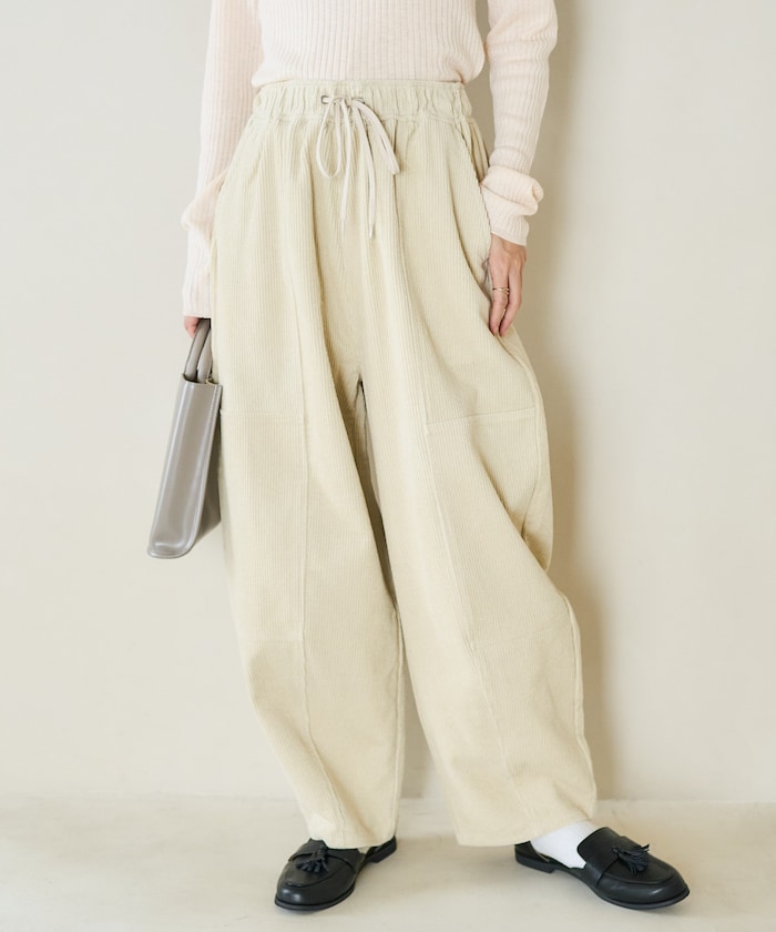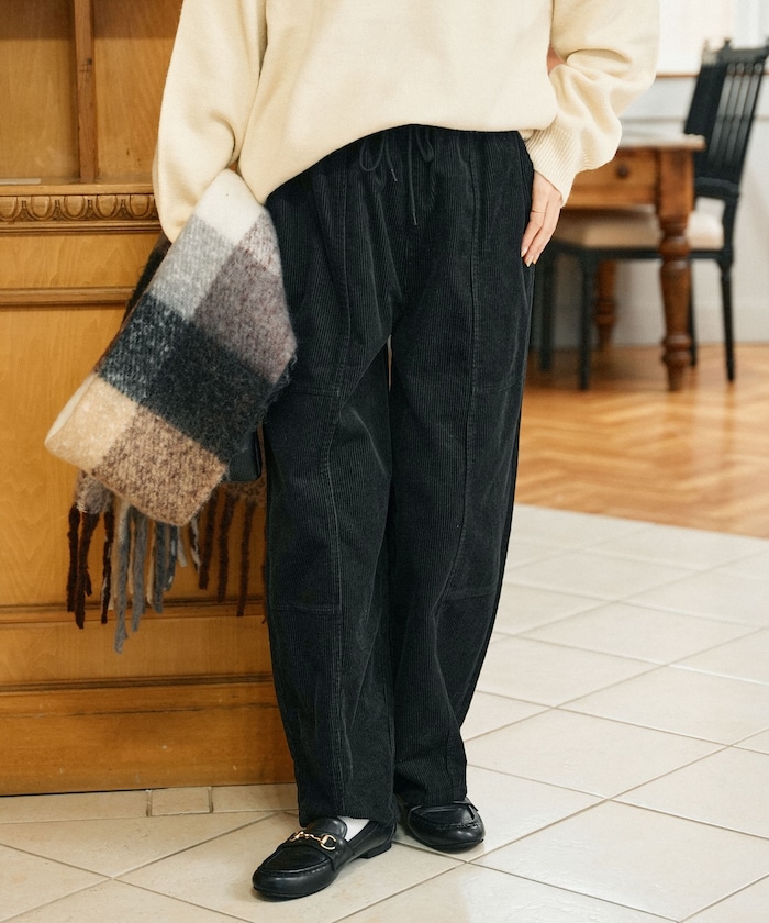트렌디한 곡선 실루엣이 돋보이는 팬츠입니다. 허리 밴딩으로 편안한 착용감을 제공합니다.