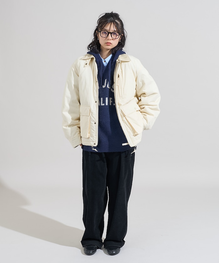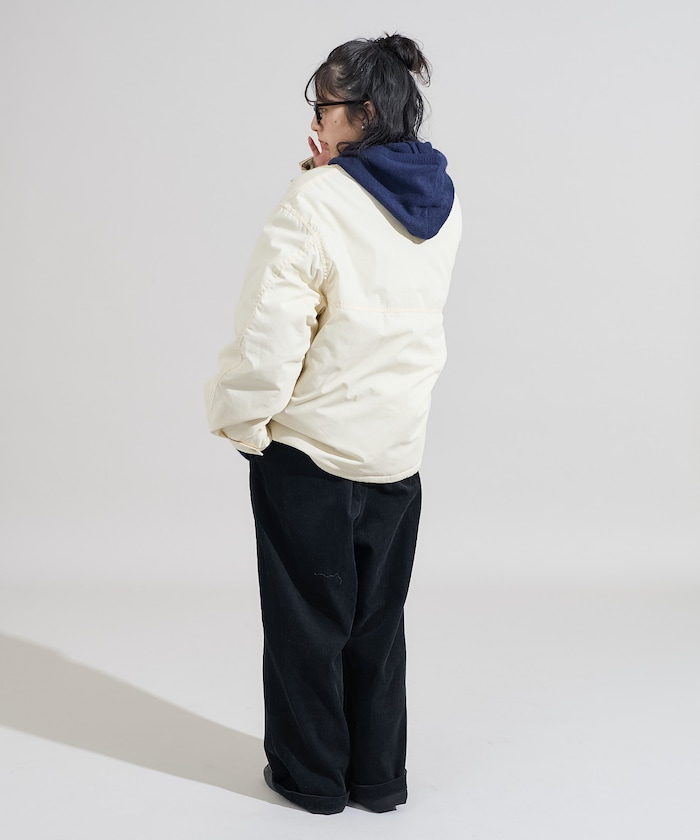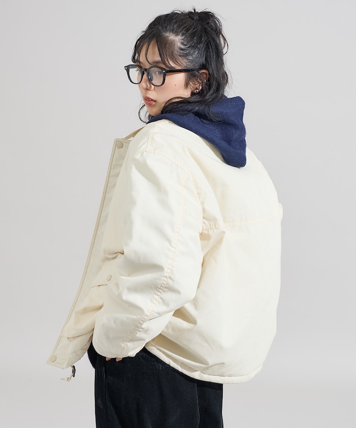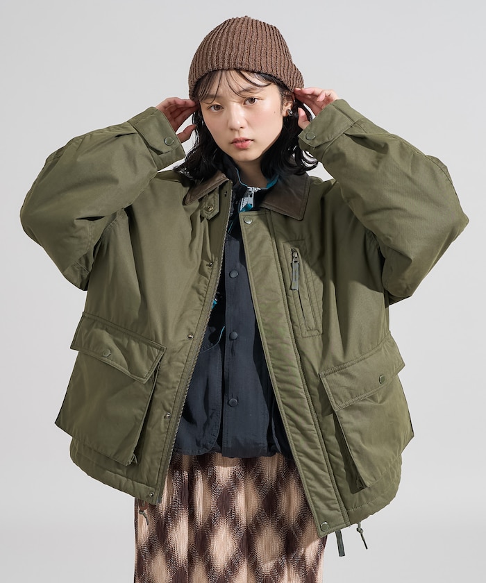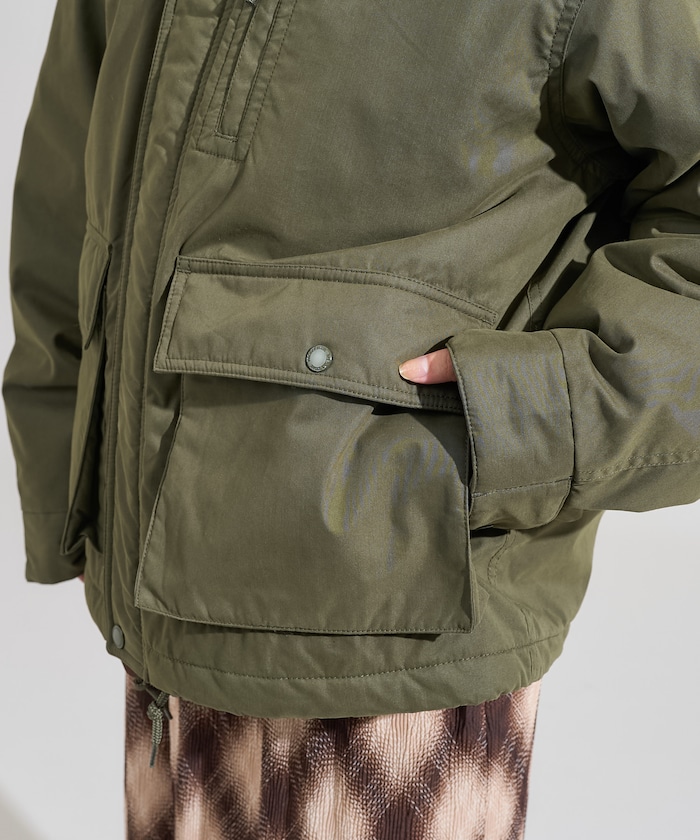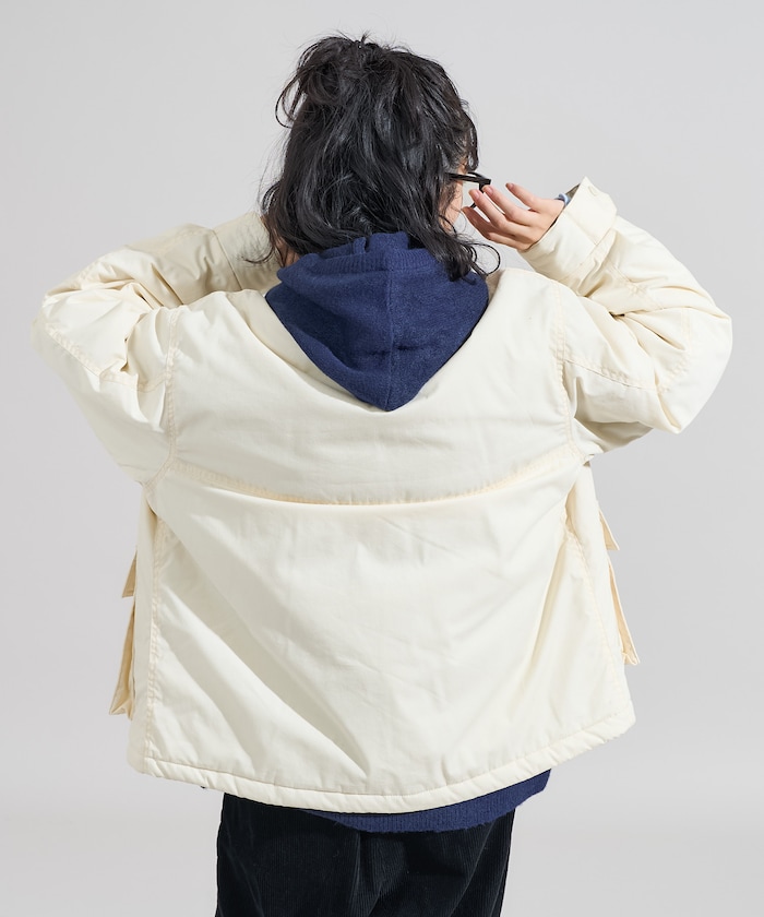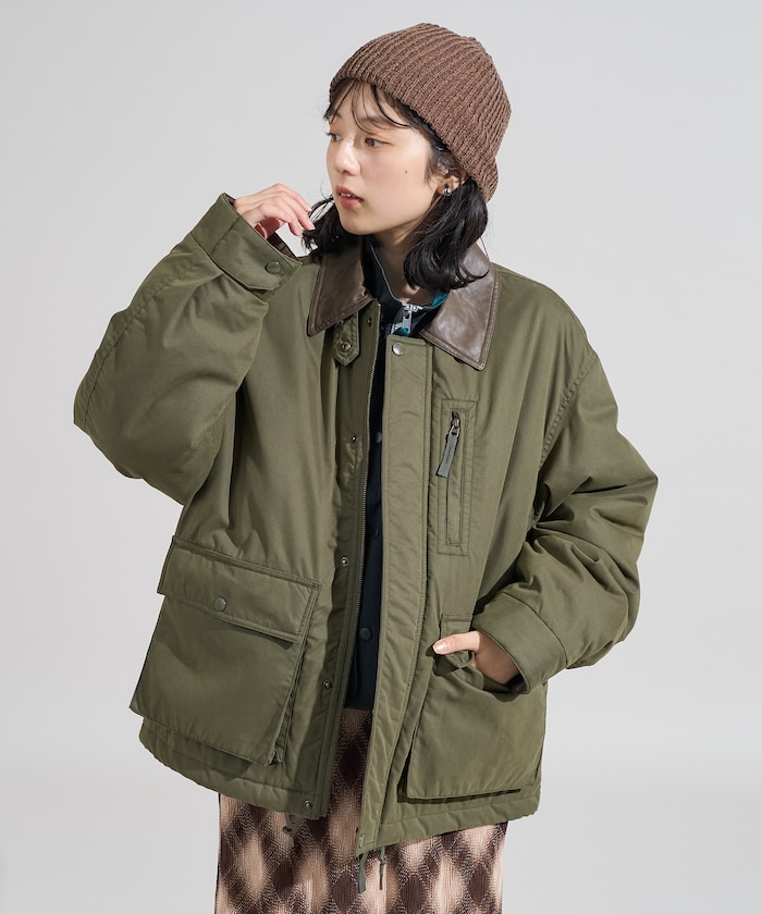 성가죽 배색 카라와 빅 플랩 포켓이 돋보이는 디자인의 패딩 점퍼. 밑단에 드로우스트링이 있어 실루엣을 변화할 수 있으며 카라의 친스트랩과 소매의 버튼 디테일이 있습니다. 오버사이즈 실루엣